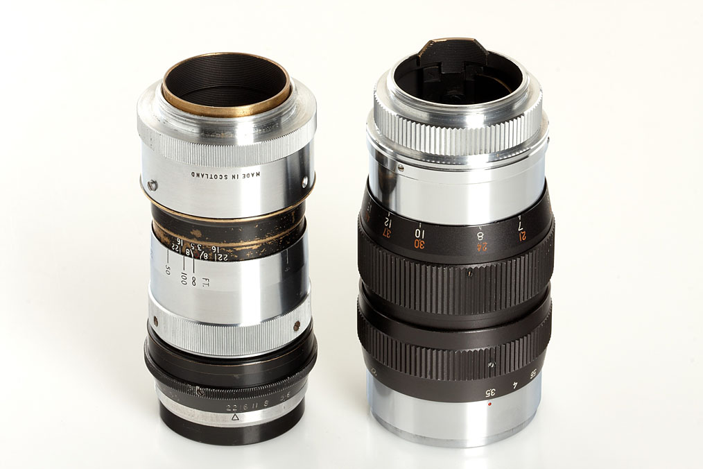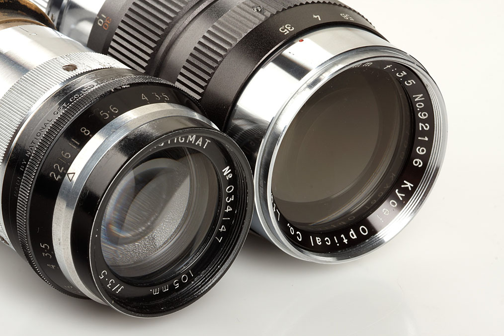 Stewartry Trinol Anastigmat 3.5/105mm no.034147 (feet scale, rear cap), Kyoei Optical Co. Super-Acall 3.5/135mm no.92196 (meter and feet scale) (2)