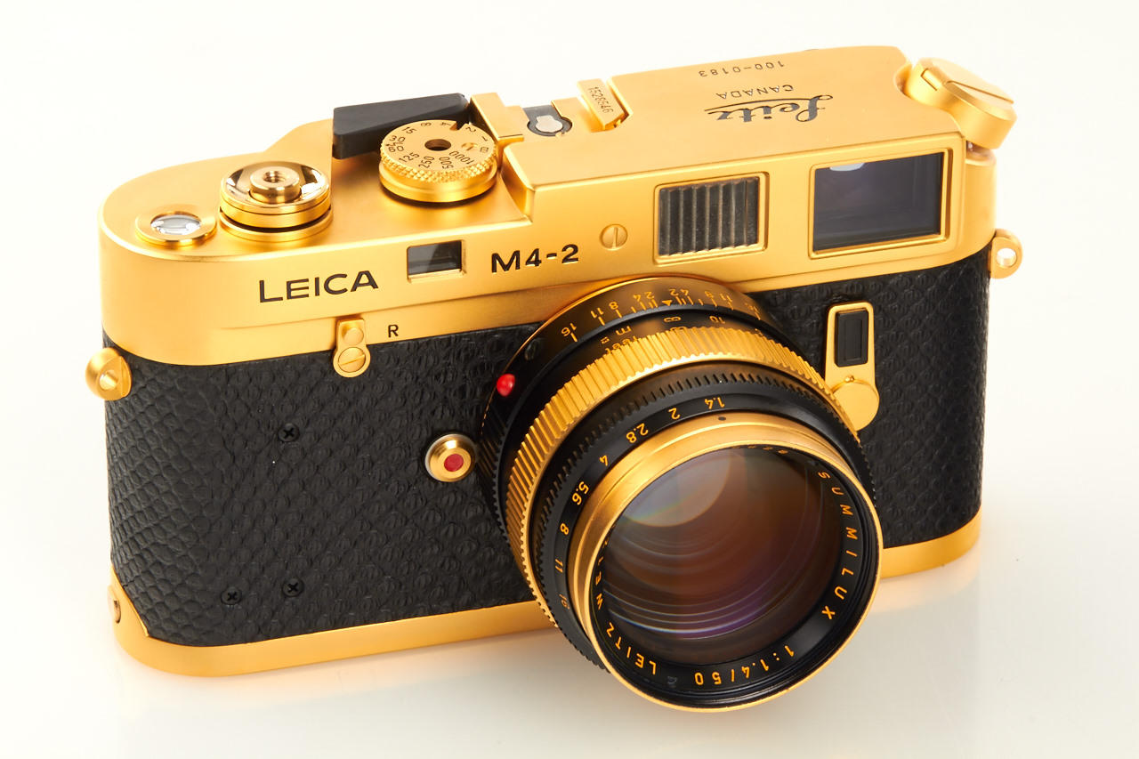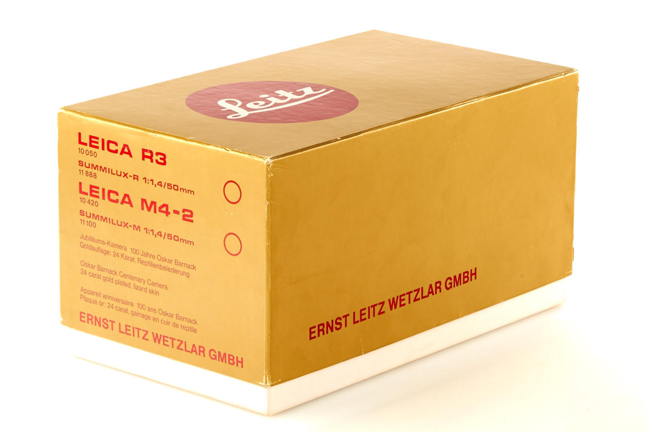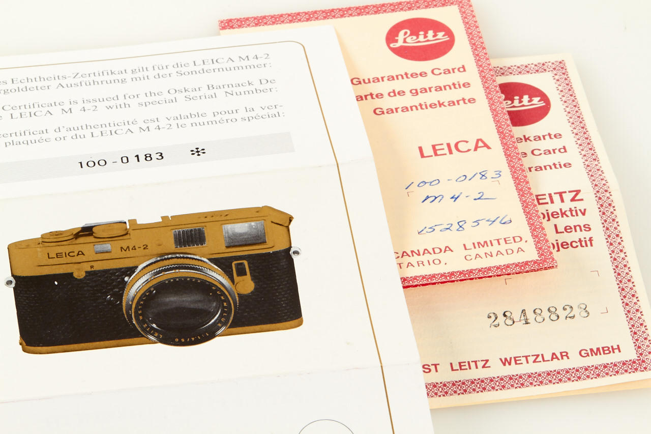 24 carat gold plated M4-2 edition for the 100th birthday of Oskar Barnack, serial no.1527434, special number '100-0183', gold Summilux 1.4/50mm no.2848828, complete with all accessories, wooden box, papers, all maker's boxes, golden edition box
