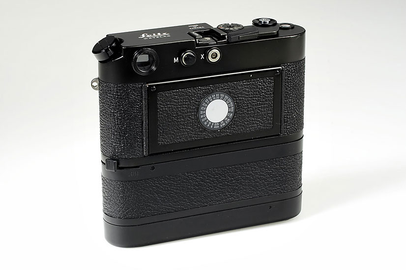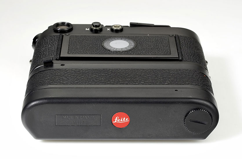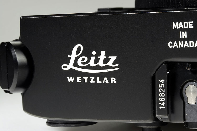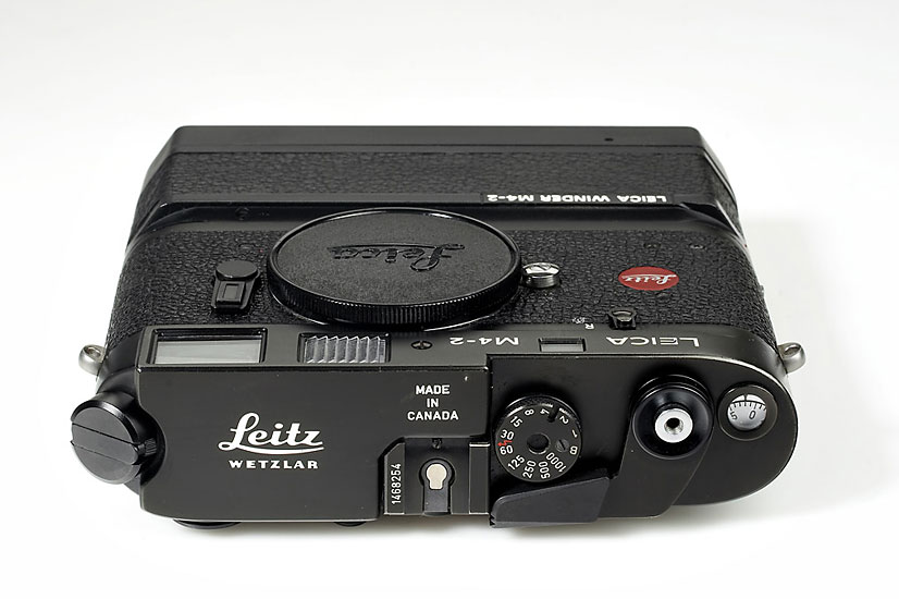 early camera no.254, with both engravings: 'Leitz Wetzlar' and 'Made in Canada' above the accessory shoe, Leitz logo on front, chrome strap lugs, with matching winder M4-2 14214 no.924