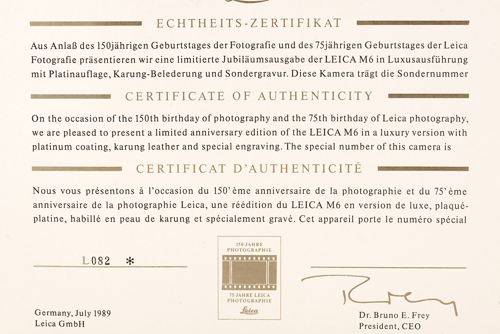 brand new platinum M6 with Summilux-M 1.4/50mm no.3482204 complete with all papers and maker's box, special number L082