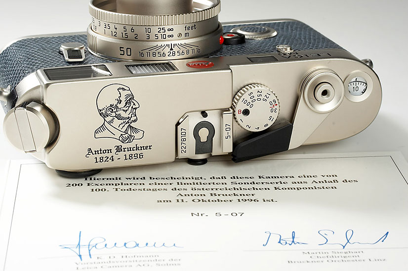 platinum edition of 200 cameras for Anton Bruckner (special number 5-07), with matching Elmar-M 2.8/50mm no.0000507, complete and new with CD in maker's box