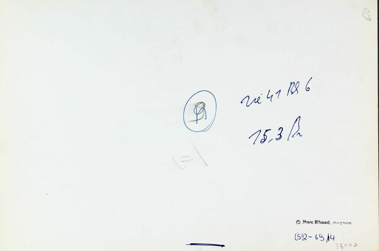 Vintage silver print 16,8 x 25 cm Photographer's agency copyright stamp and several handwritten numerical notations (incl. neg. no. 65-2-69/14) in pencil and ink on the reverse LITERATURE Marc Riboud, Portfolio, Munich 2001, pl. 73; Marc Riboud, The Three Banners of China, London 1966, p. 166-167. Divorce proceedings, the members of the court (president, associate judge and two stenographers) advise the couple to take up their marriage again. Divorce was officially approved by law, but it was executed only very limited. / Ein Scheidungsprozess, die Mitglieder des Gerichts (Präsident, Beisitzender und zwei Stenographen) empfehlen dem Paar das Zusammenleben wieder aufzunehmen. Obgleich die Scheidung offiziell nach dem Gesetz anerkannt ist, wurde sie nur sehr beschränkt angewandt.