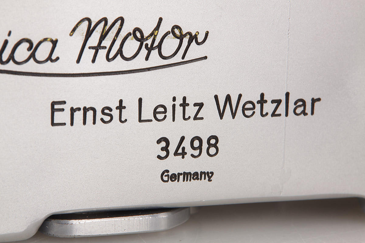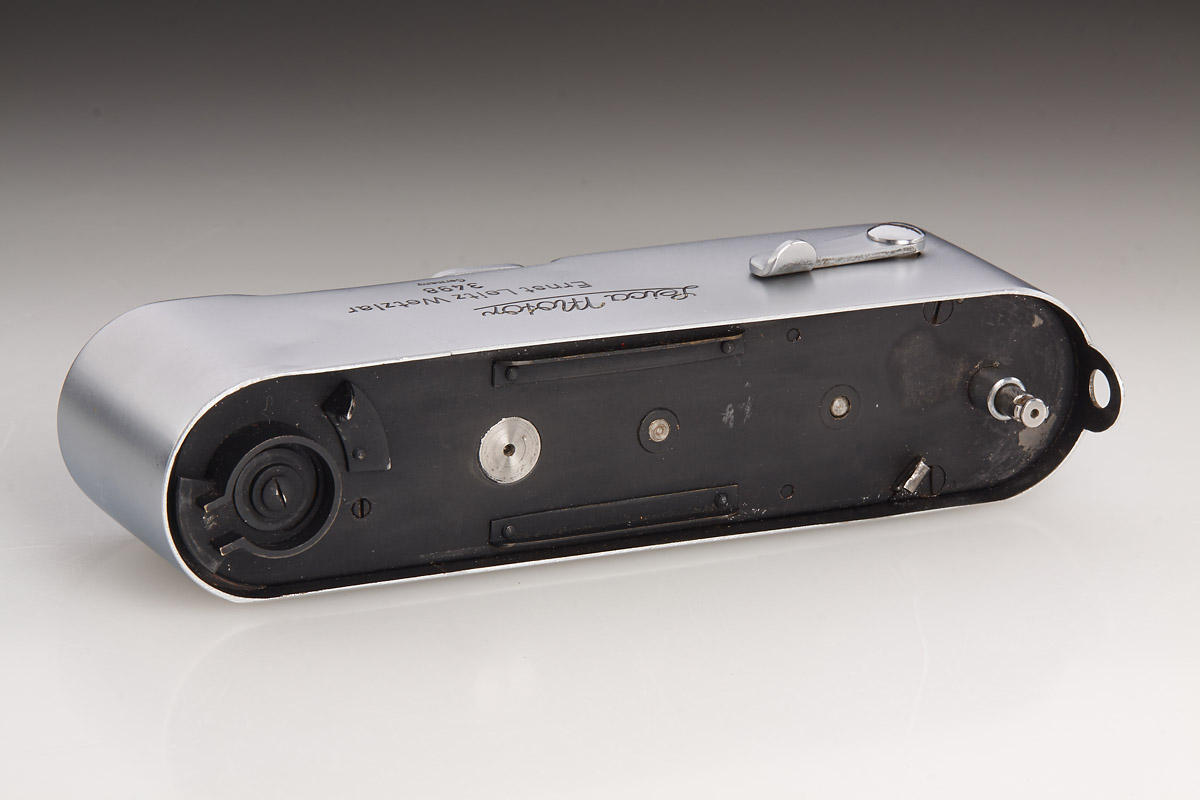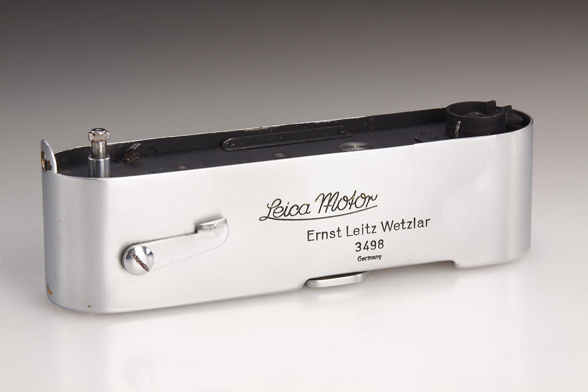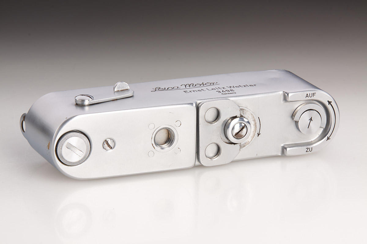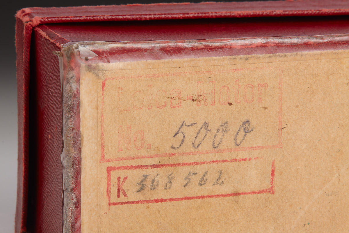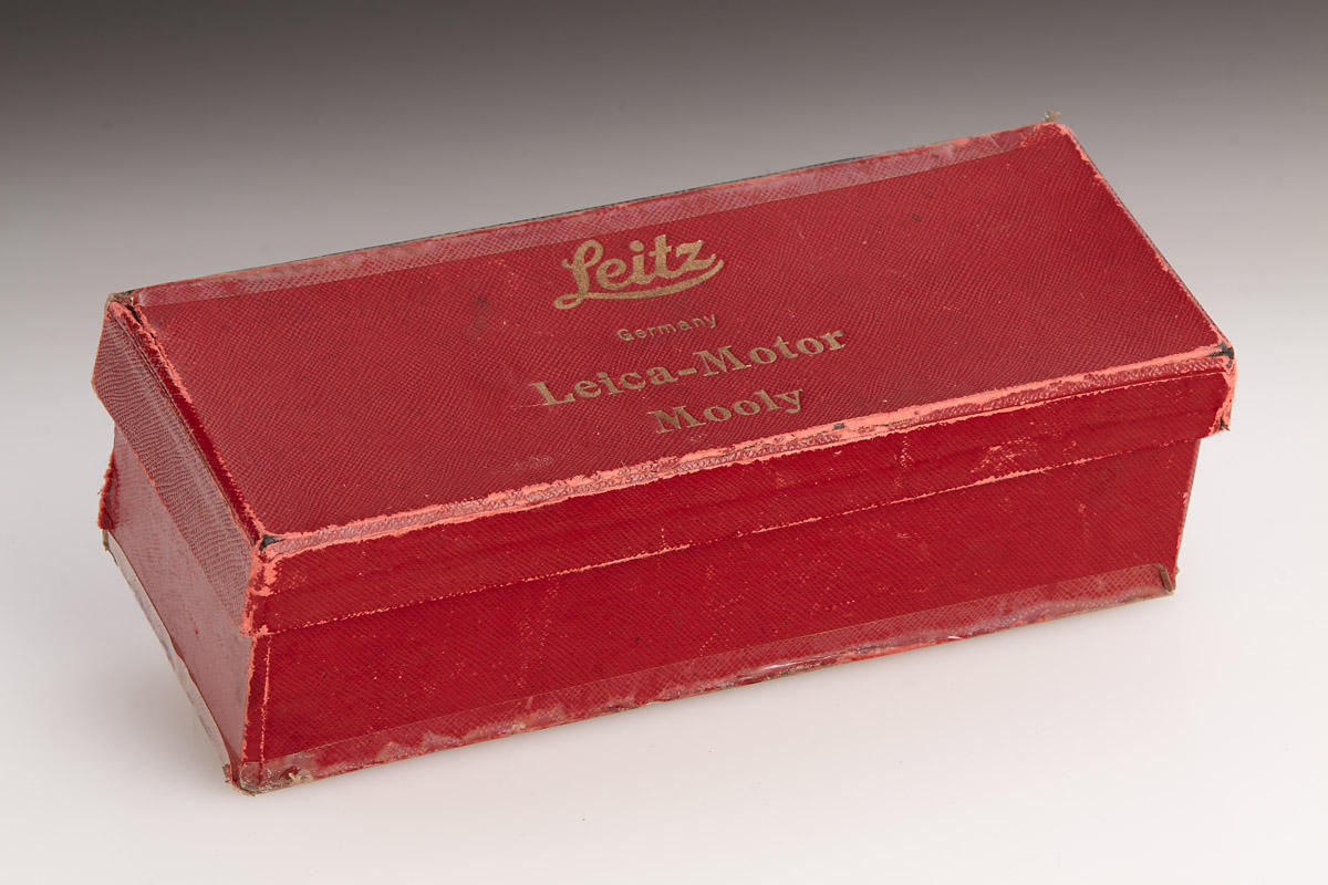 Very rare MOOLY-C from the pre-series, delivered to the Italian Leitz agent Cattaneo on January 17, 1941, with delivery number 20706 (probably used for Italian military), with red maker’s box, marked serial no. 5000 (which was also delivered to Cattaneo at the same date). LITERATURE Heimfert, „Mooly-C Nullserie“ in: 10 Jahre Leica Historica, Leica Historica e.V., 1985, p. 79; Paul-Henry van Hasbroeck (ed.), Leica, a history illustrating every model and accessory, p. 126-132. The springwound Leica Motor was introduced in 1935 under the catalogue code MOOLY. It fitted the “short base” Leica cameras up to model IIIb and had an external linkage to the camera release. After the Leica IIIc with die-cast shutter crate came out in 1940, accessories such as bottomplates, rapidwinders and motors did not fit the new Leica model, which had a width that was elongated by 3 mm, compared to its predecessor. Therefore, a new version of the MOOLY was designed for the Leica IIIc, which then also had an internal coupling. This long base “MOOLY-C” officially started at serial number 5000 (interestingly not at 5001), after a small pre-series was prepared with serial numbers 3495 to 3546. The MOOLY-C is quite rare, as only about 750 units were completed (compared to 3,400 units of the short base version), the majority of which are finished in black paint. A chrome MOOLY-C – besides the grey version – is one of the rarest Leica accessories from the World War II era, a specimen from the pre-series is almost impossible to find. Der Leica Federwerkmotor wurde unter dem Katalognamen MOOLY im Jahr 1935 eingeführt. Er passte an die damaligen Leica-Modelle mit „kurzer Basis“, bis zum Modell IIIb und hatte eine externe Kupplung mit dem Auslöser der Kamera. Nachdem die Leica IIIc im Jahr 1940 herausgekommen war, passten Leica-Bodendeckel, -Schnellaufzüge und -Motoren nicht mehr an das neue Modell, welches eine um 3 mm verlängerte Breite hatte. Aus diesem Grund wurde ein überarbeiteter MOOLY für die Leica IIIc entwickelt, der dann auch über eine interne Kupplung verfügte. Die Seriennummern des „MOOLY-C“ begannen offiziell bei 5000 (interessanterweise nicht bei 5001), nachdem eine kleine Vorserie mit den Nummern 3495 bis 3546 fertig gestellt worden war. Der MOOLY-C ist recht selten, es wurden insgesamt nur etwa 700 Stück hergestellt (im Vergleich zu 3.400 Einheiten der Version mit kurzer Basis), von denen die meisten in schwarz lackiert ausgeführt waren. Der MOOLY-C in chrom zählt – neben der grauen Variante – zu den seltensten Leica Zubehörteilen aus dem Zweiten Weltkrieg, ein Exemplar aus der Vorserie ist praktisch nicht zu finden.
