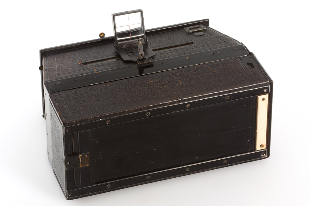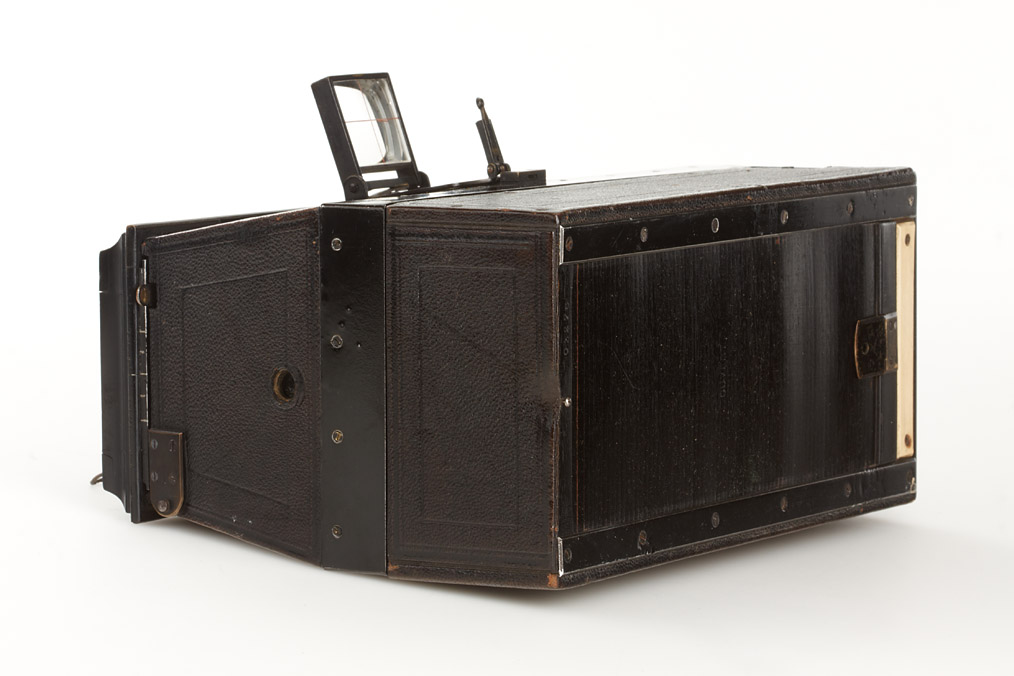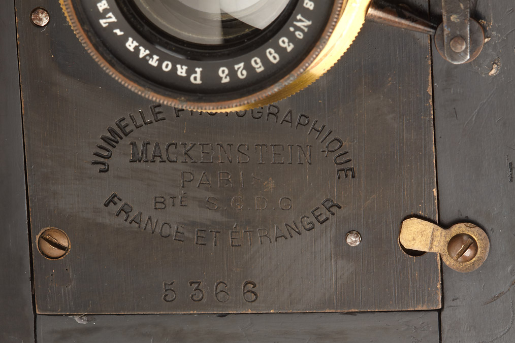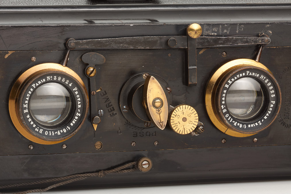 9x18cm, leather covered wood body, with a pair of Zeiss Protar f/6 110mm lenses, guillotine shutter and lateral sliding Newton finder, magazine back