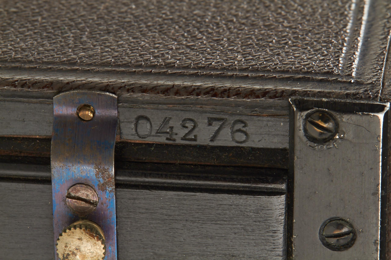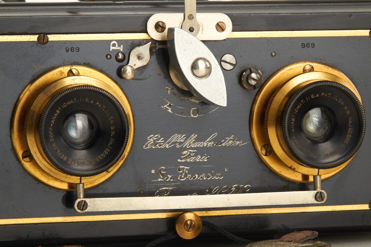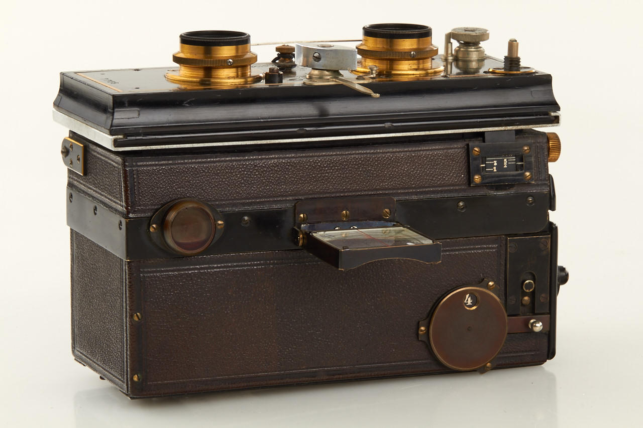 classic French 45x107mm stereo camera, early version with rigid wooden body and focusing front, with dual Goerz Doppel Anastigmat 6.8/54mm no.182696 and 182698, focusing screen with matching serial number and magazine back, excellent condition
