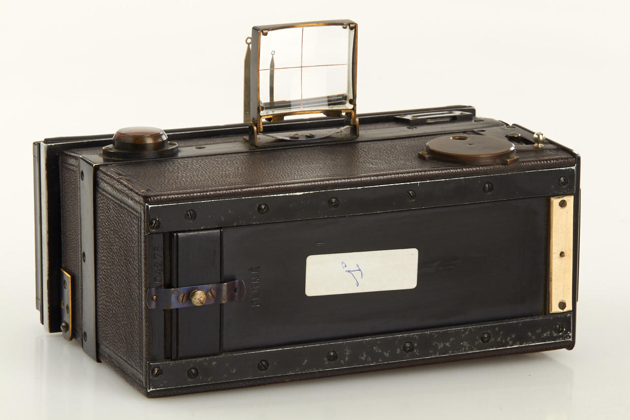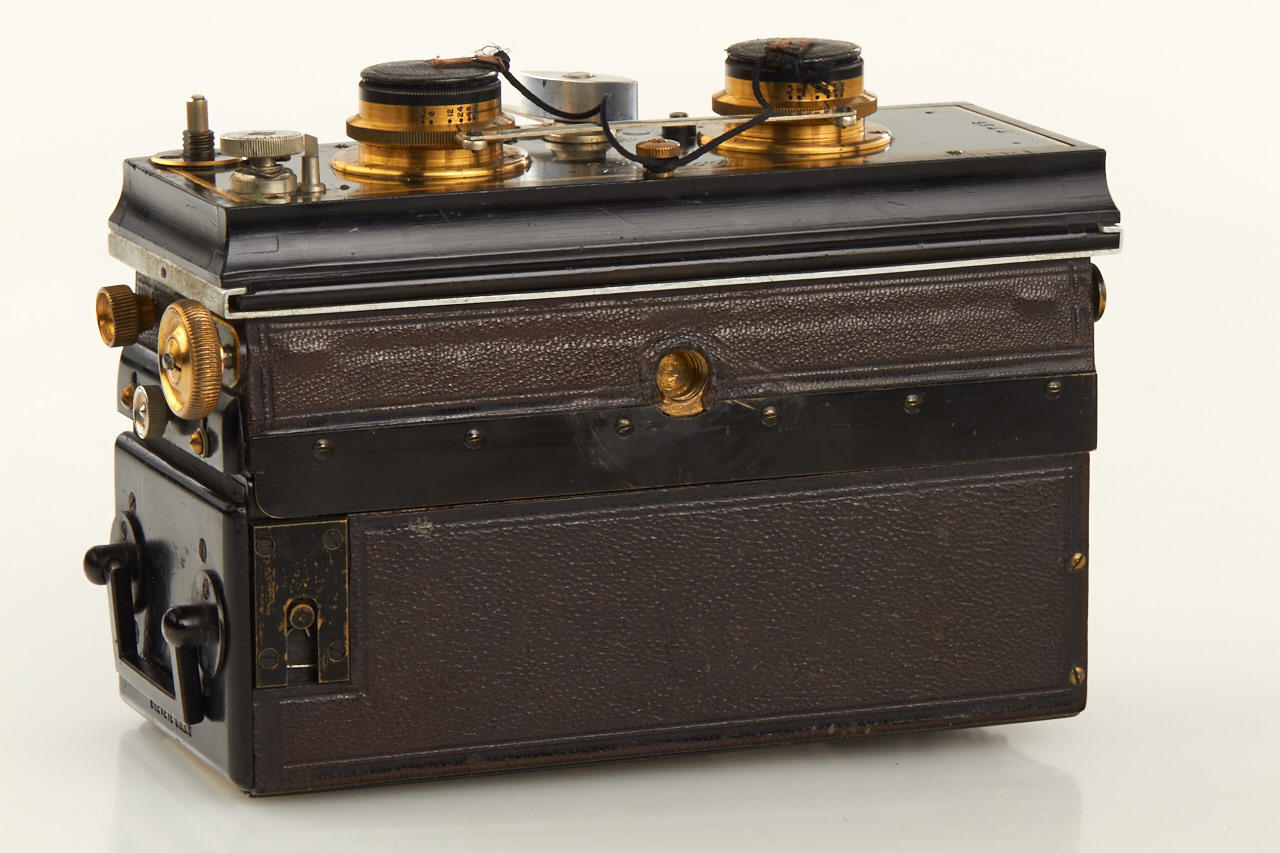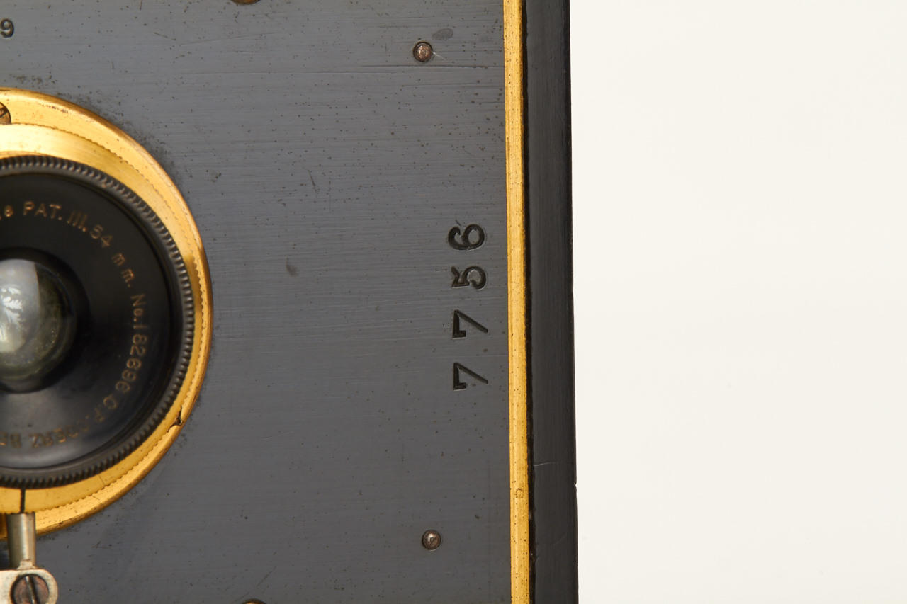 classic French 45x107mm stereo camera, early version with rigid wooden body and focusing front, with dual Goerz Doppel Anastigmat 6.8/54mm no.182696 and 182698, focusing screen with matching serial number and magazine back, excellent condition
