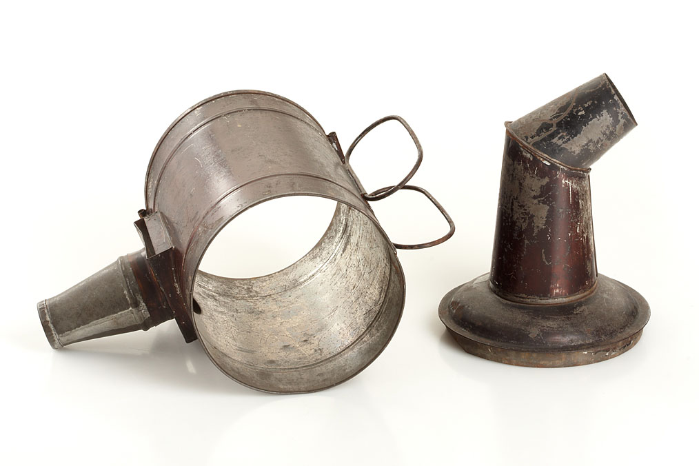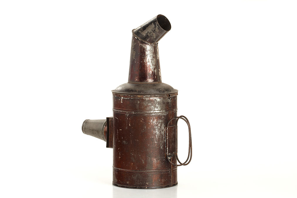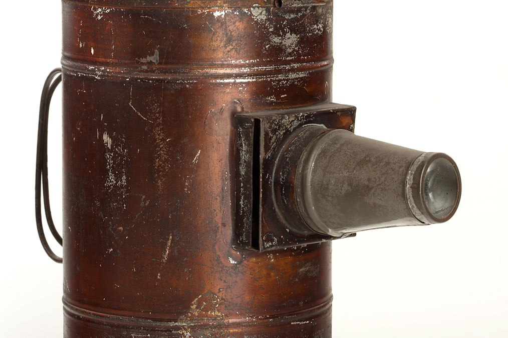 rare American lantern by an unknown maker, cylindrical tin body with the original chimney and two handles made of bound wire on the rear, original copper tone finish, the base plate is missing otherwise in original condition with beautiful patina. An almost identical lantern presumably by the same maker is depicted in Hrabalek page 156 which is labeled “Patent August 1882”, height: 30cm