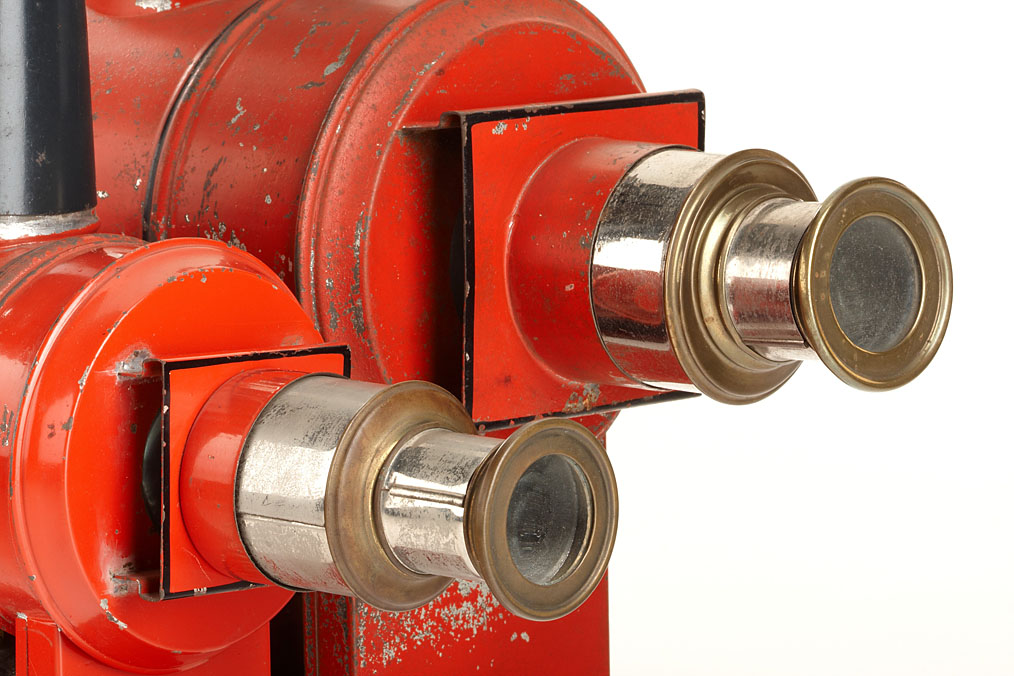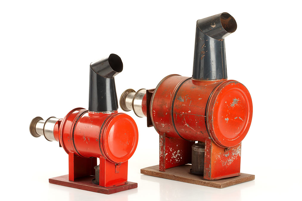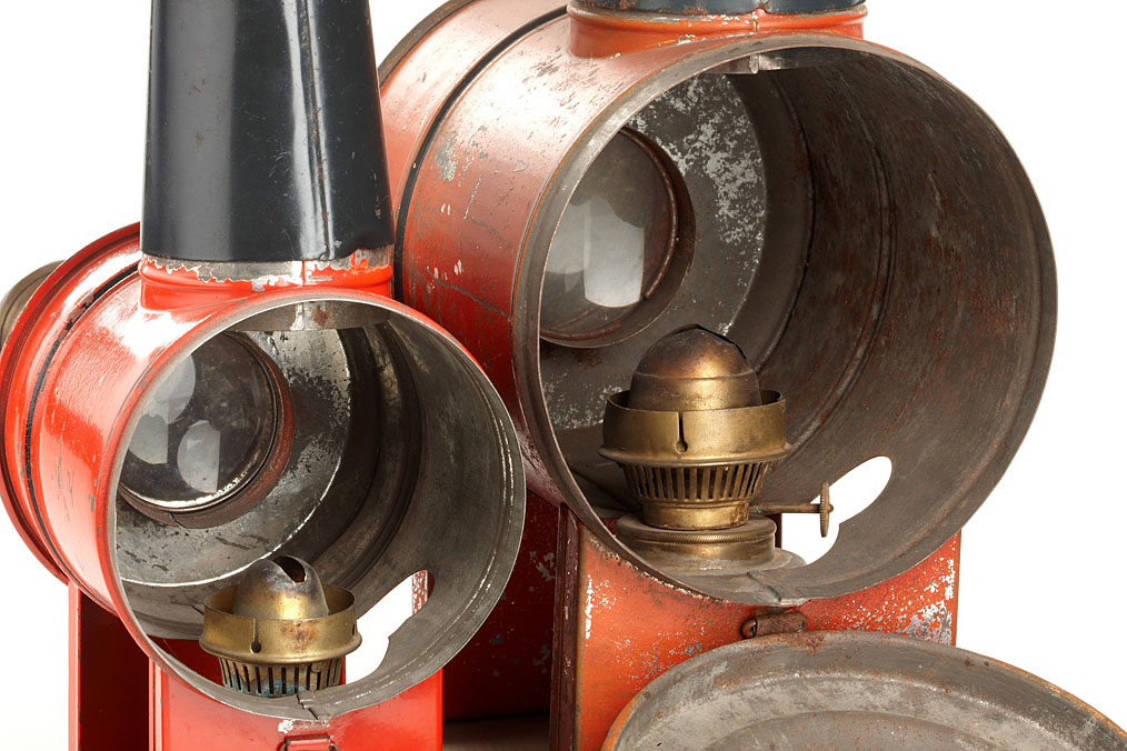 set of barrel-shaped lanterns in two different sizes, red painted tin-body mounted on a wooden panel, both lanterns in very nice original condition and complete with the original lenses, black chimneys and petroleum burners. The lanterns are unlabeled, but according to Hrabalek this model has been produced by George Carette and later by Jean Falk, both well known German makers located in Nuremberg. The larger lantern has a height of 34cm