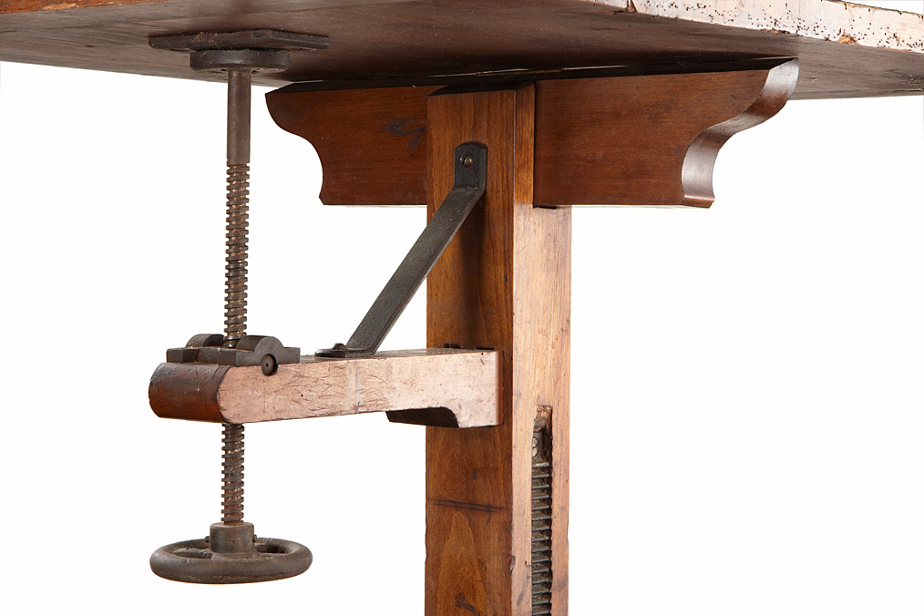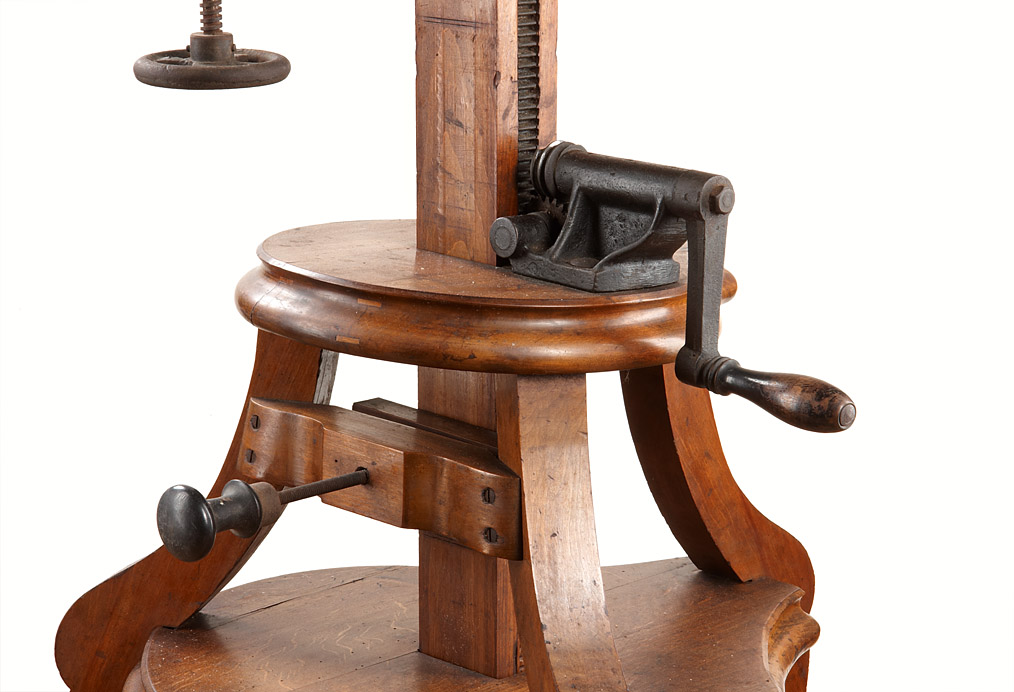 early an beautifully crafted studio tripod made of nutwood, height adjustable with crank from 89cm to 123cm, platform at top 52 x 67cm with tilt adjustment. According to the previous owner the tripod was part of an Austrian photographers studio, hard to find in this exceptionally good condition.