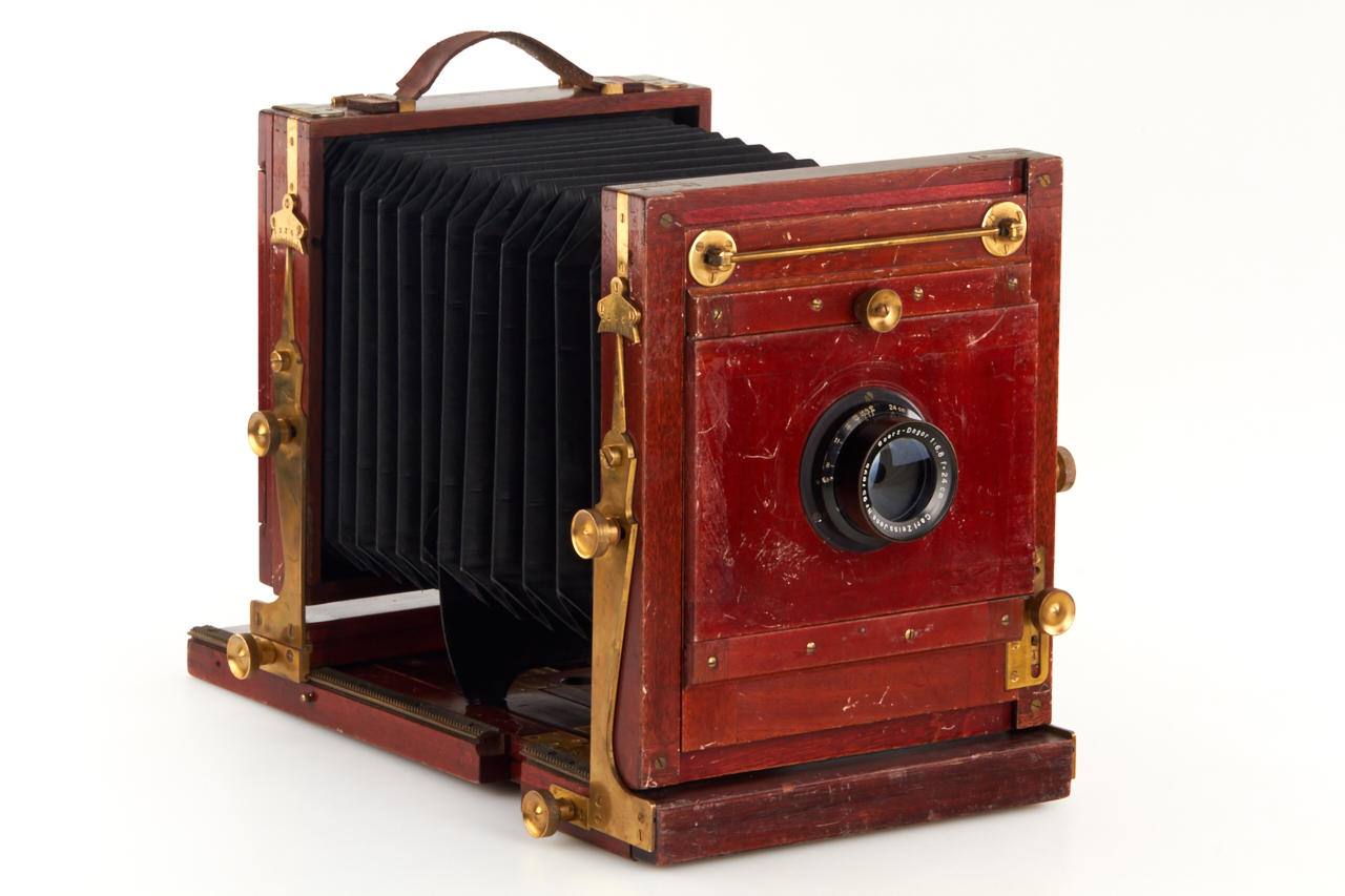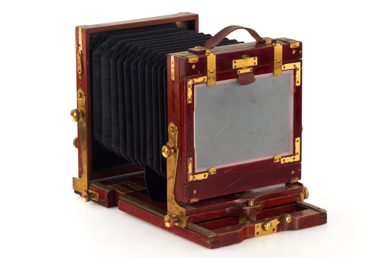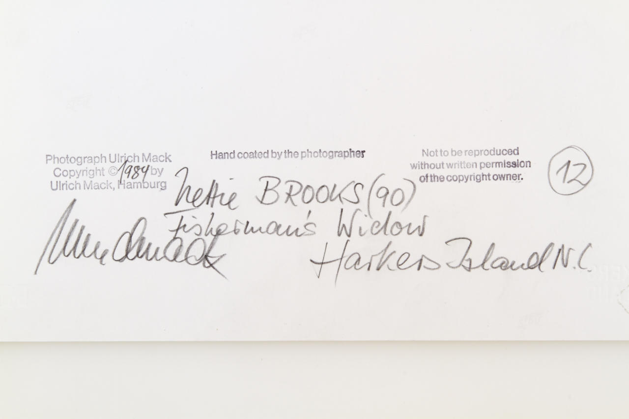 Unmarked large format Mahogany Camera owned and used by Ulrich Mack, with Carl Zeiss Jena Göerz-Dagor 6.8/24cm no.957896, 12 matching mahogany double film holders. With exhibition catalogue 'Mack 60 Photographien' for Ulrich Mack's 60th Anniversary exhibition showing the photographer with this camera on the front cover. Together with a Gelatine silver print, 22.5x19cm, later print, signed, annotated and dated by the photographer in pencil on the reverse, his blind stamp in the margin and copyright stamps on the reverse. Fisherman’s widow Netti M. Brook, 90 years old, Harkers Island, North Carolina 1984. Mack is among Germany's most esteemed photographers. The present image is part of his extensive photo project ‘Inselmenschen - Island People’, which was published in 1995 in the same-named award winning book. The series was taken in two isolated fishing communities: Pellworm, off the coast of Germany, and Harkers Island, North Carolina. There he documented the everyday life and inhabitants of the two different islands. Mack took the stunning images with this antique mahogany field camera.