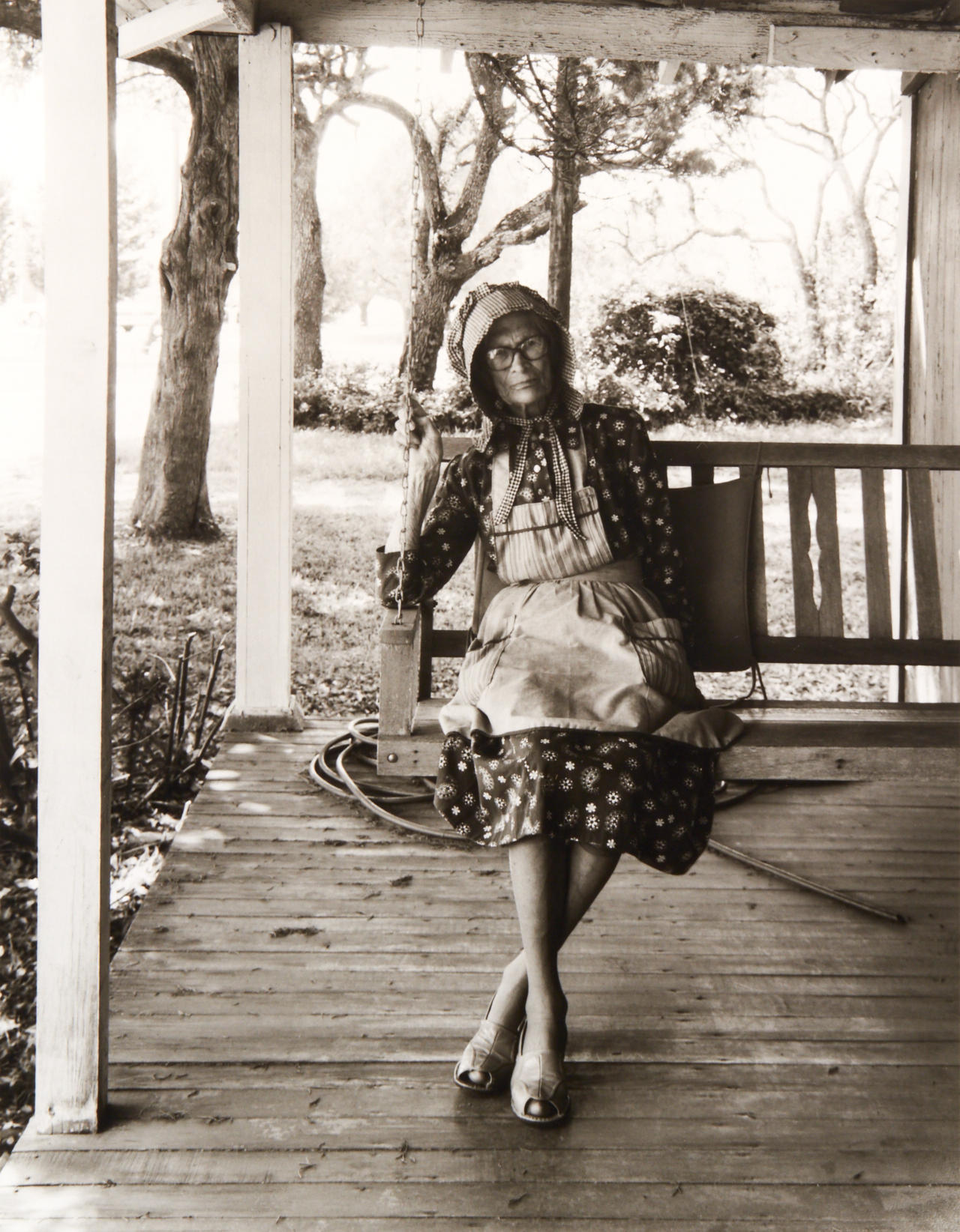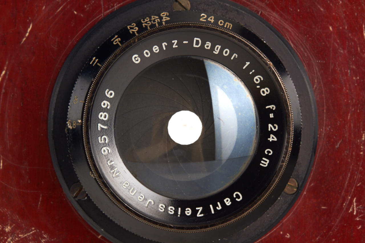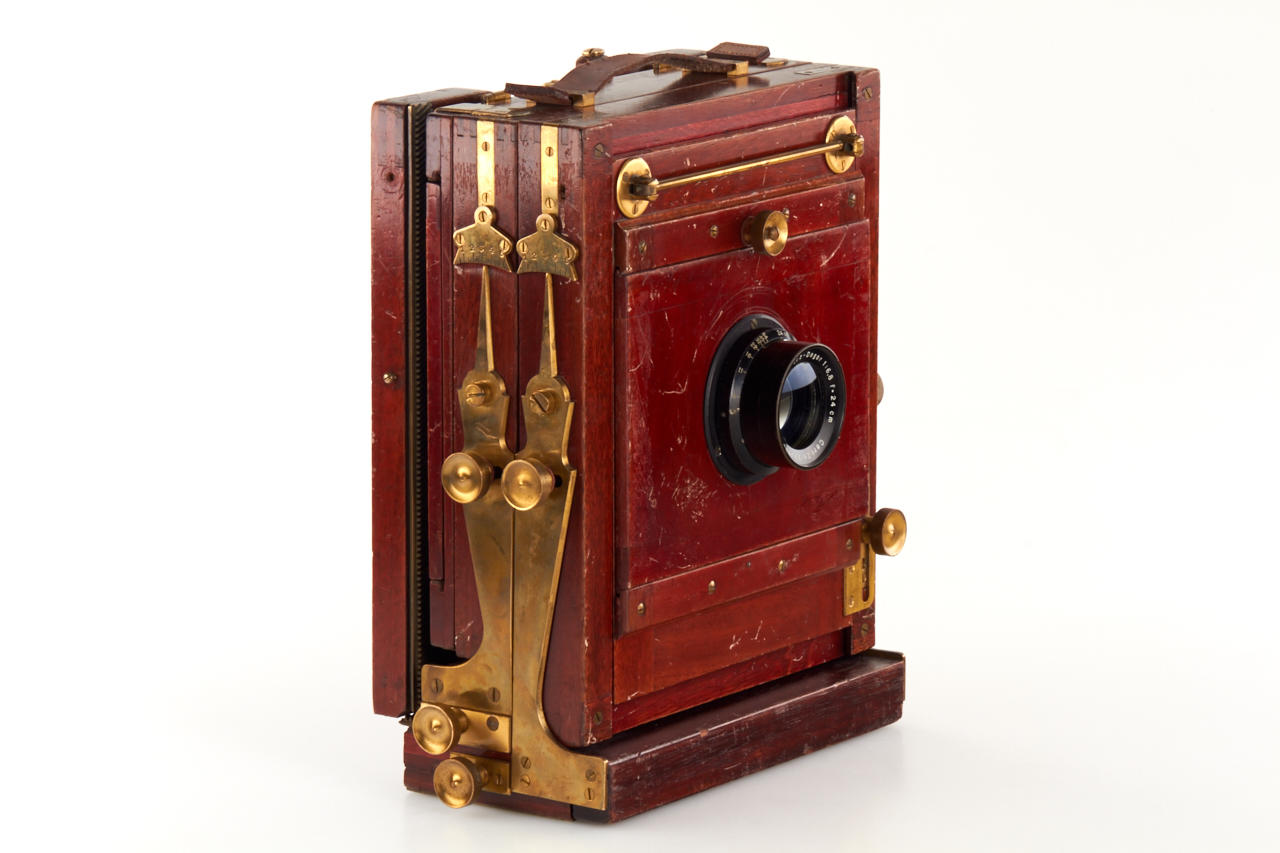 Unmarked large format Mahogany Camera owned and used by Ulrich Mack, with Carl Zeiss Jena Göerz-Dagor 6.8/24cm no.957896, 12 matching mahogany double film holders. With exhibition catalogue 'Mack 60 Photographien' for Ulrich Mack's 60th Anniversary exhibition showing the photographer with this camera on the front cover. Together with a Gelatine silver print, 22.5x19cm, later print, signed, annotated and dated by the photographer in pencil on the reverse, his blind stamp in the margin and copyright stamps on the reverse. Fisherman’s widow Netti M. Brook, 90 years old, Harkers Island, North Carolina 1984. Mack is among Germany's most esteemed photographers. The present image is part of his extensive photo project ‘Inselmenschen - Island People’, which was published in 1995 in the same-named award winning book. The series was taken in two isolated fishing communities: Pellworm, off the coast of Germany, and Harkers Island, North Carolina. There he documented the everyday life and inhabitants of the two different islands. Mack took the stunning images with this antique mahogany field camera.