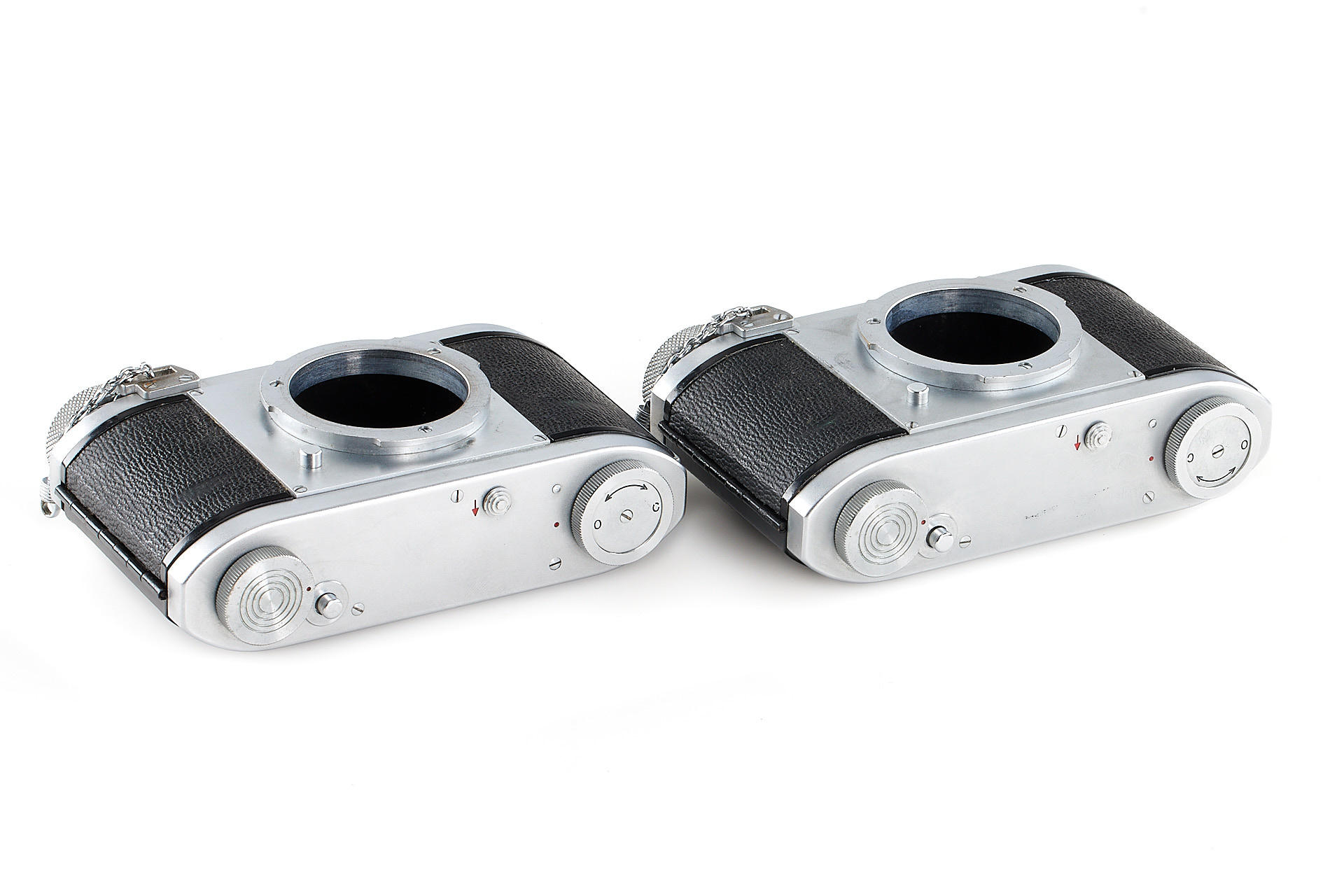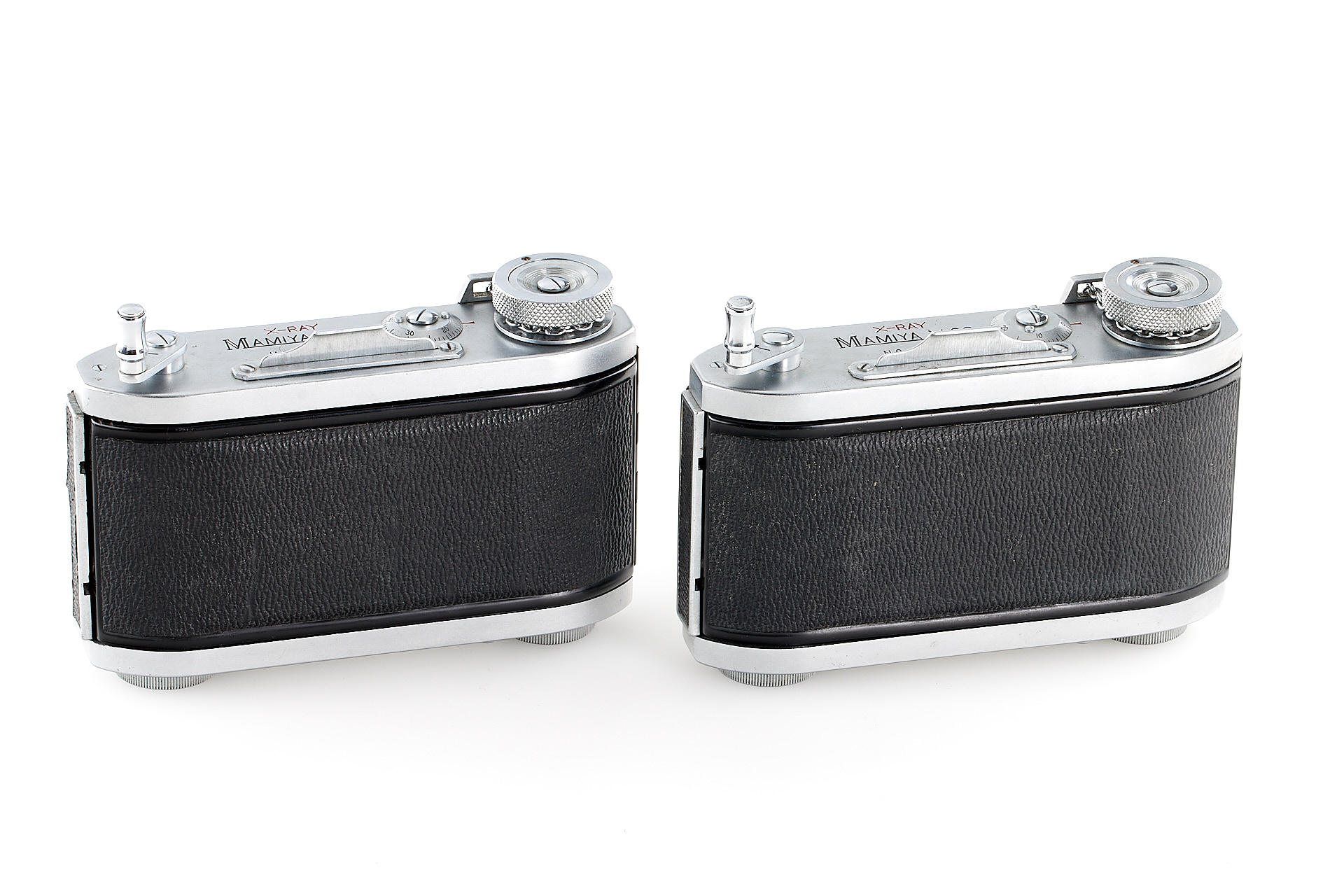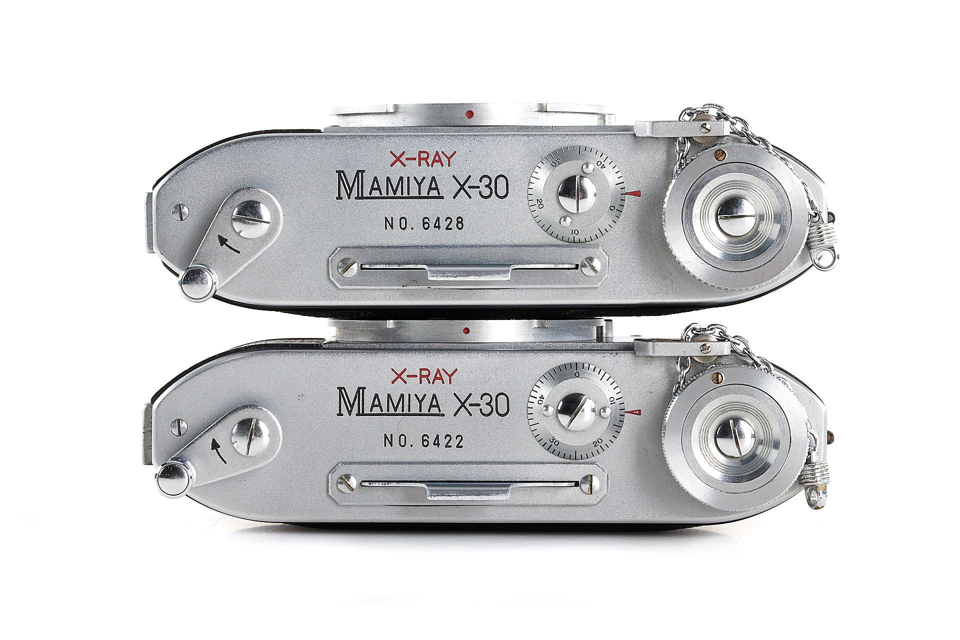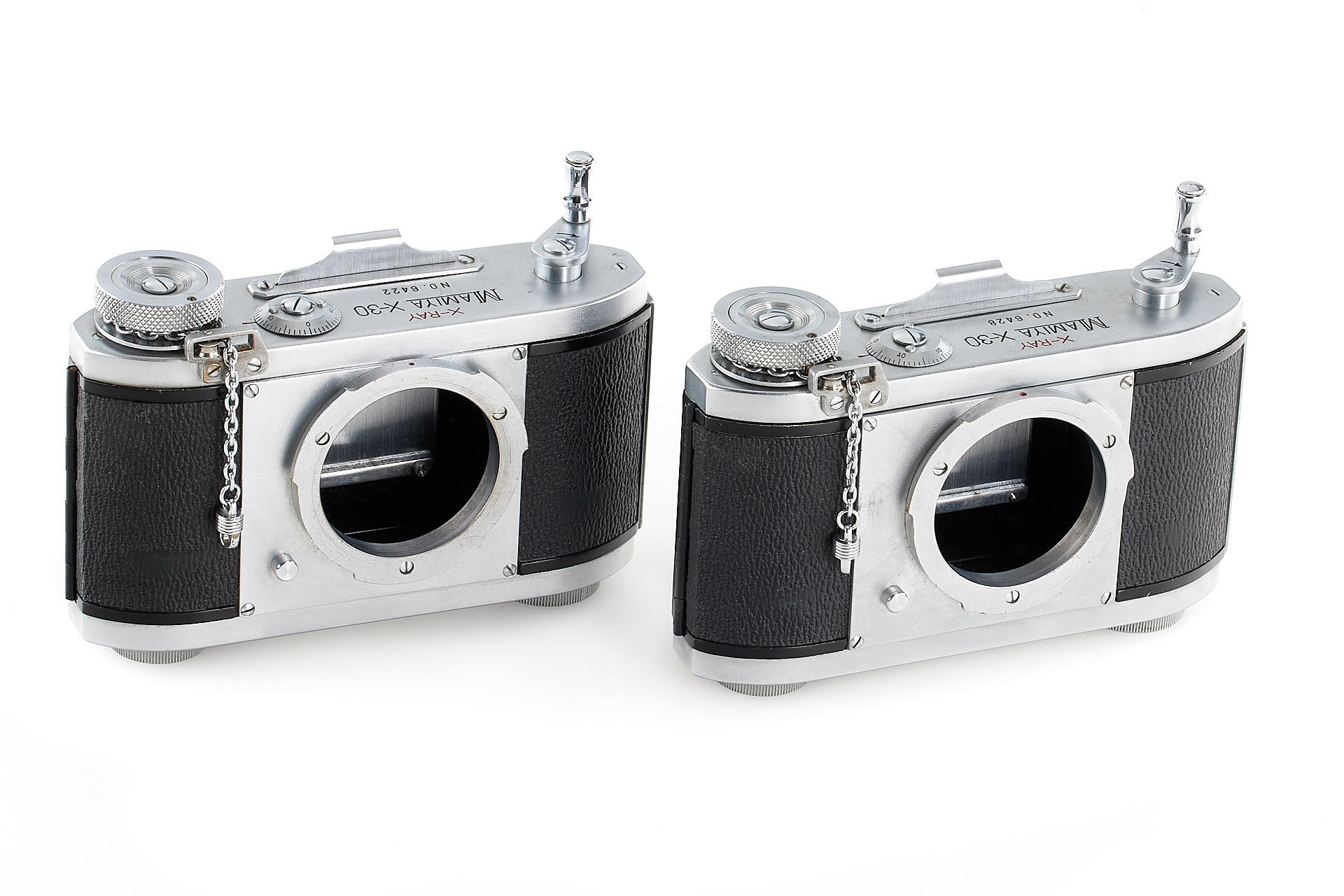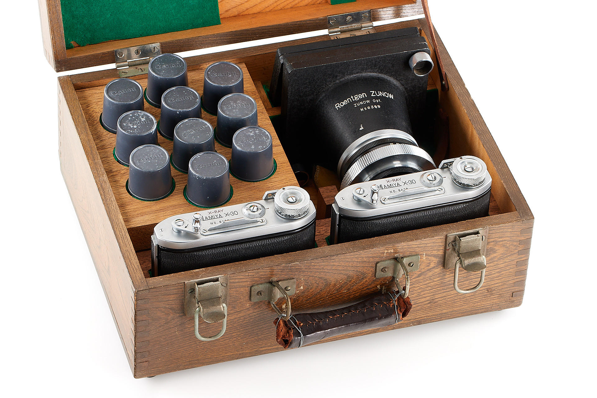 a very rare complete outfit consisting of two Mamiya X-30 bodies no.6422 and no.6428 in near mint condition, a special fast Roentgen-Zunow 1.4/6.5cm no.60351 known for its smooth bokeh, showing some cleaning marks, no iris diaphragm, rear lens cap, 2x platine adapters, front lens protection, 10 Canon film spools, with original wooden carrying case