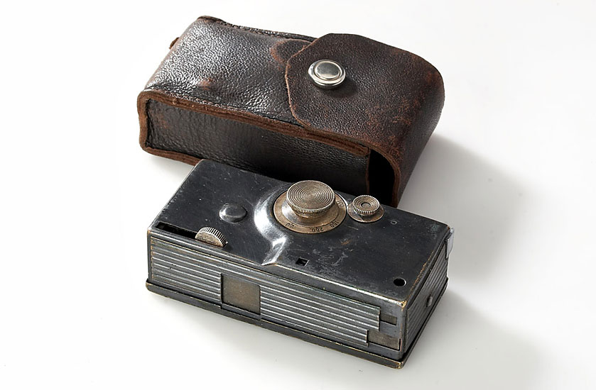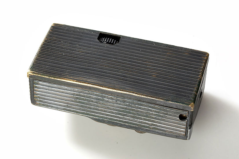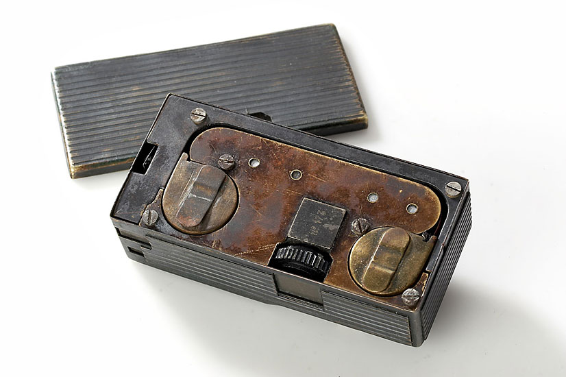 almost unknown 'Matchbox' camera for secret service during WW2 for Minox film, 2 spools, focal-plane shutter 1/20-1/250, counter, illustrated in: H. Keith Melton ULTIMATIVE SPY page 84 and described as World War II French Matchbox Camera, in complete but inoperable original condition with matching case