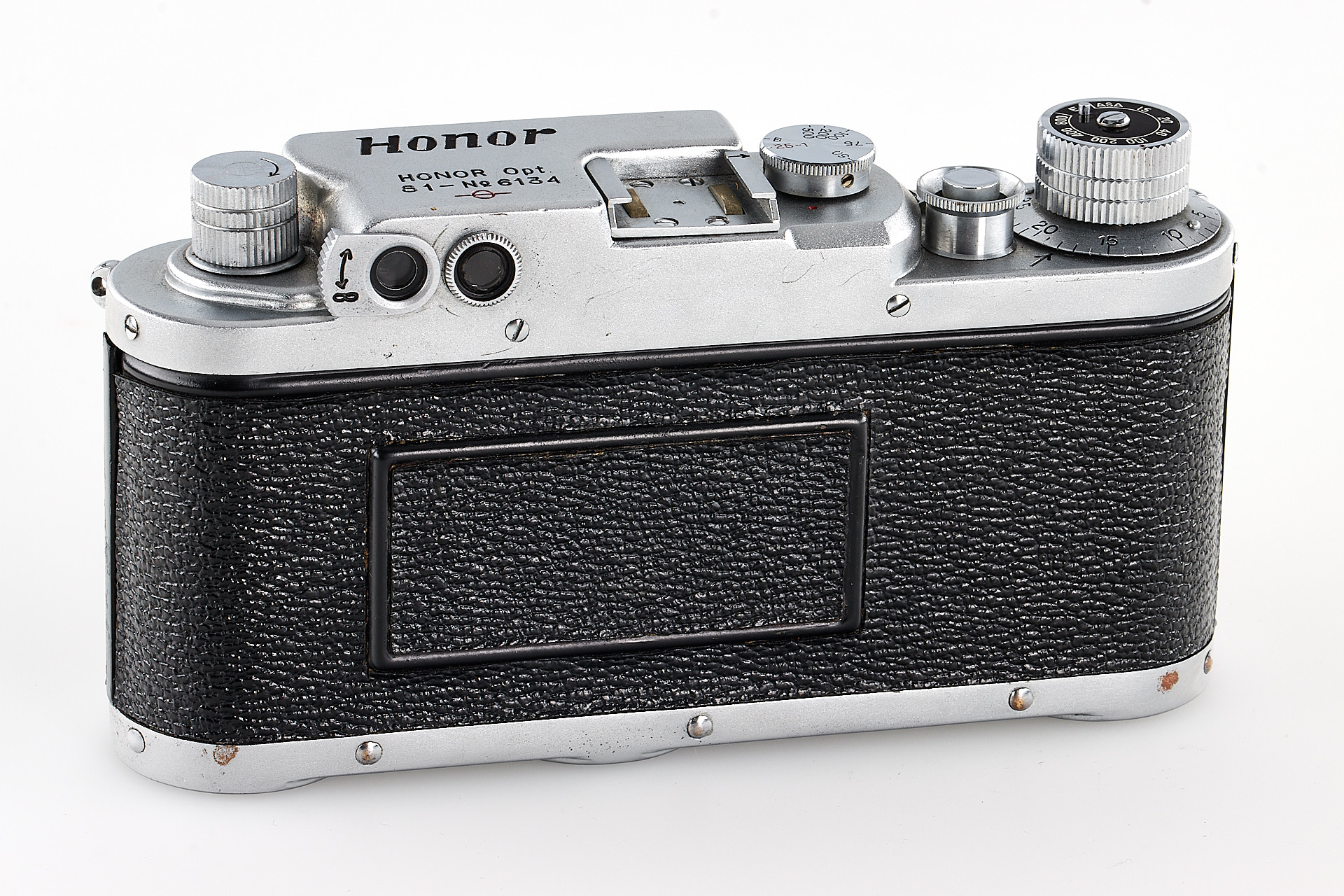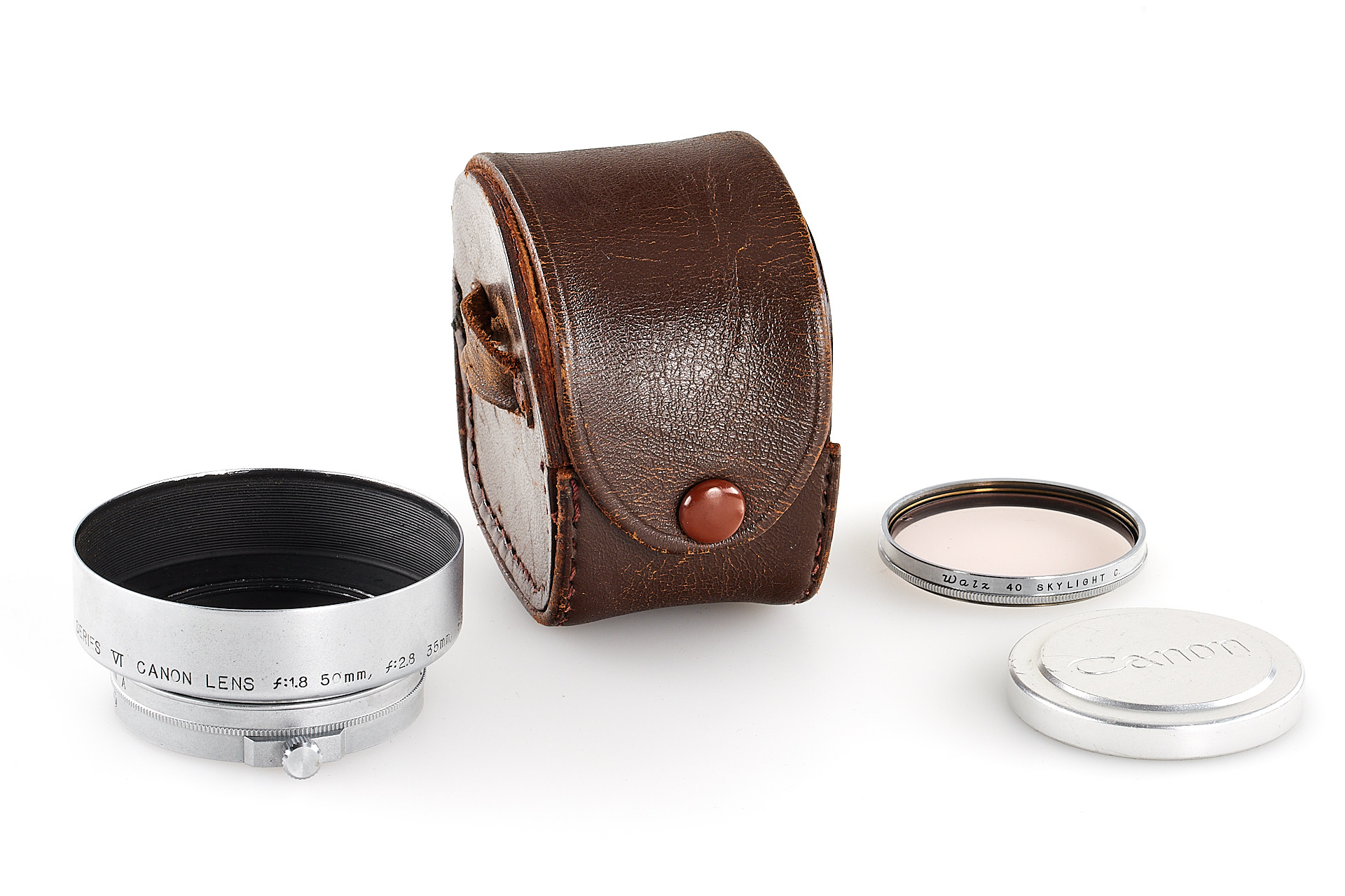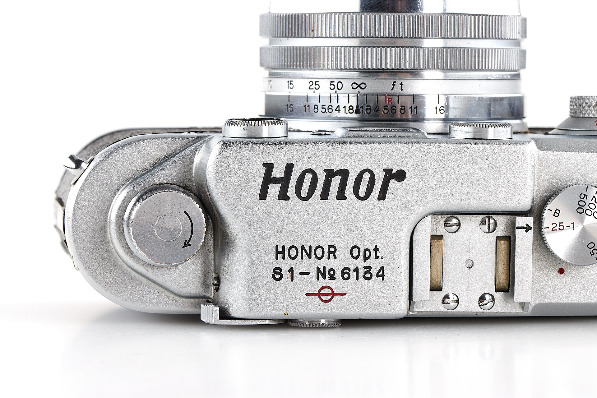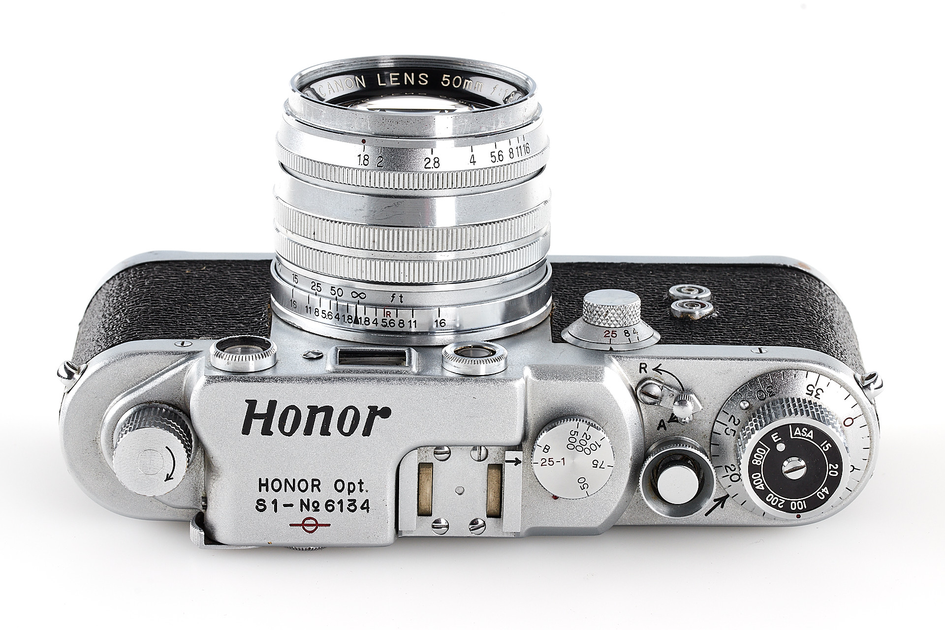Very rare and early version, with 'Honor Opt.' and bold 'Honor' engravings, 1/500sec, in near mint condition, the shutter needs attention, with interesting Canon 1.8/50mm f. Leica M39 (matching serial number no.134), with filter, lens cap and hood (leather case).