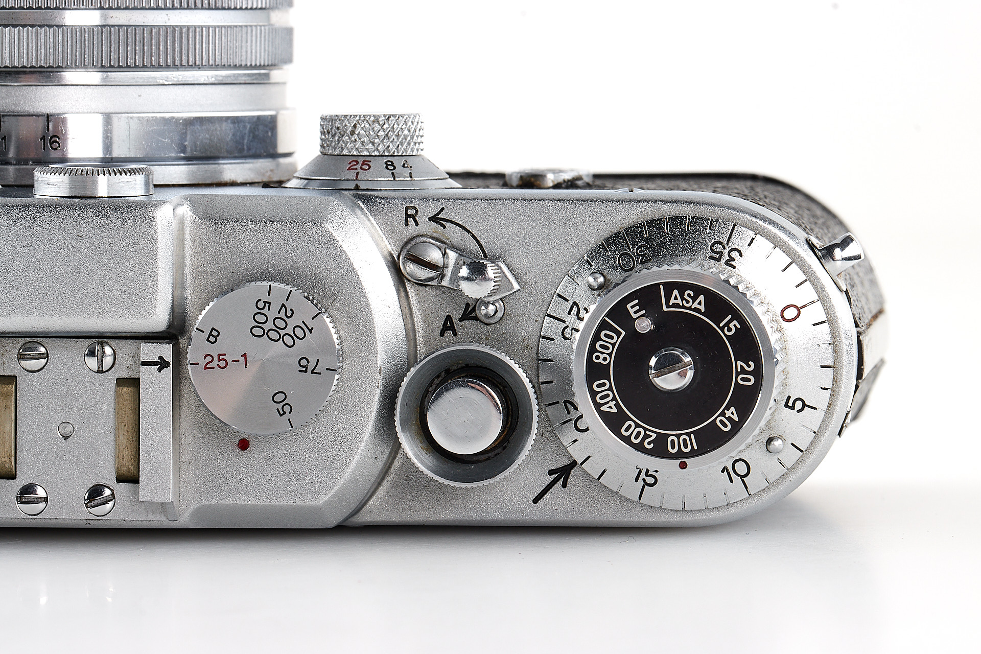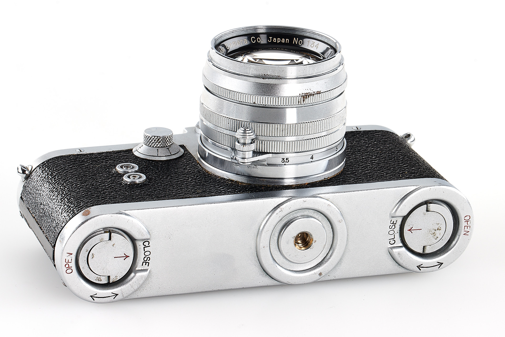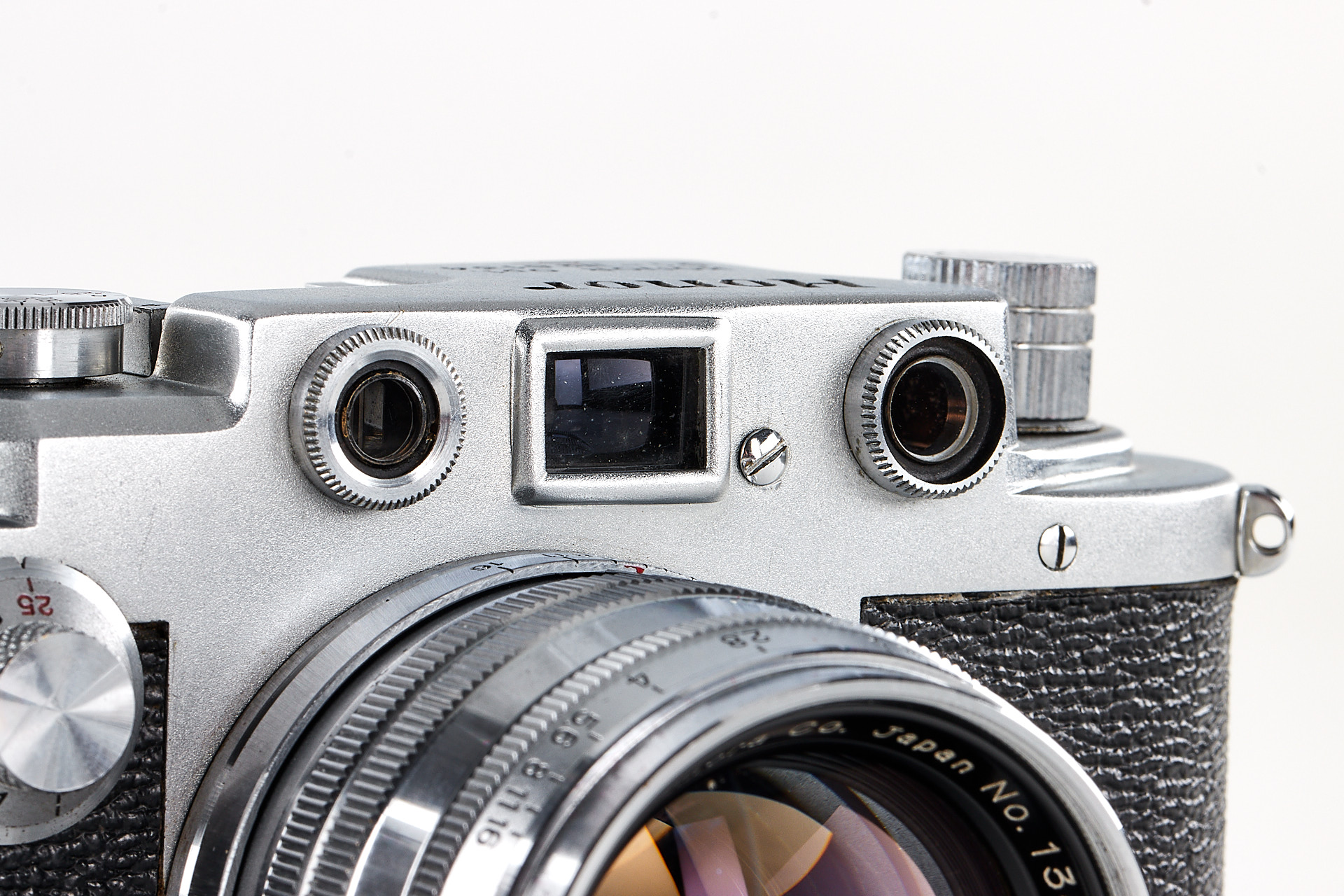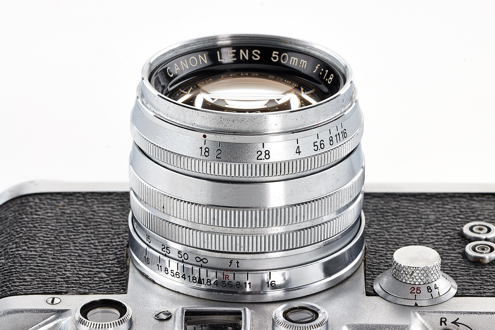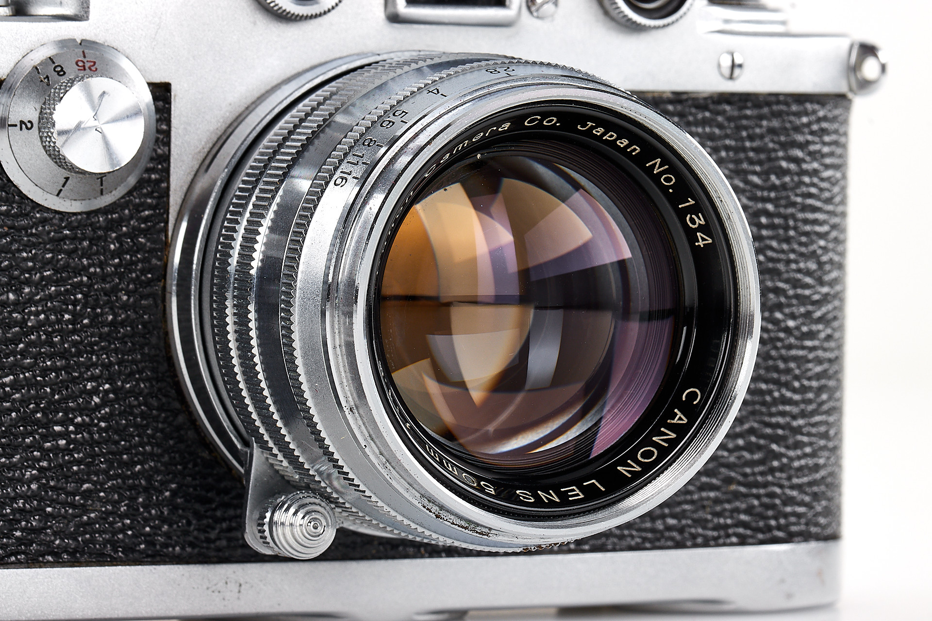 Very rare and early version, with 'Honor Opt.' and bold 'Honor' engravings, 1/500sec, in near mint condition, the shutter needs attention, with interesting Canon 1.8/50mm f. Leica M39 (matching serial number no.134), with filter, lens cap and hood (leather case).