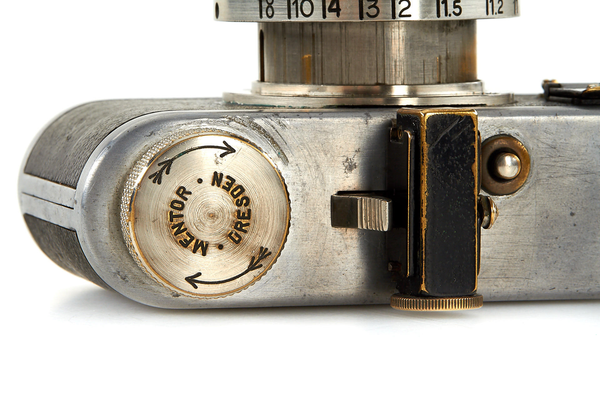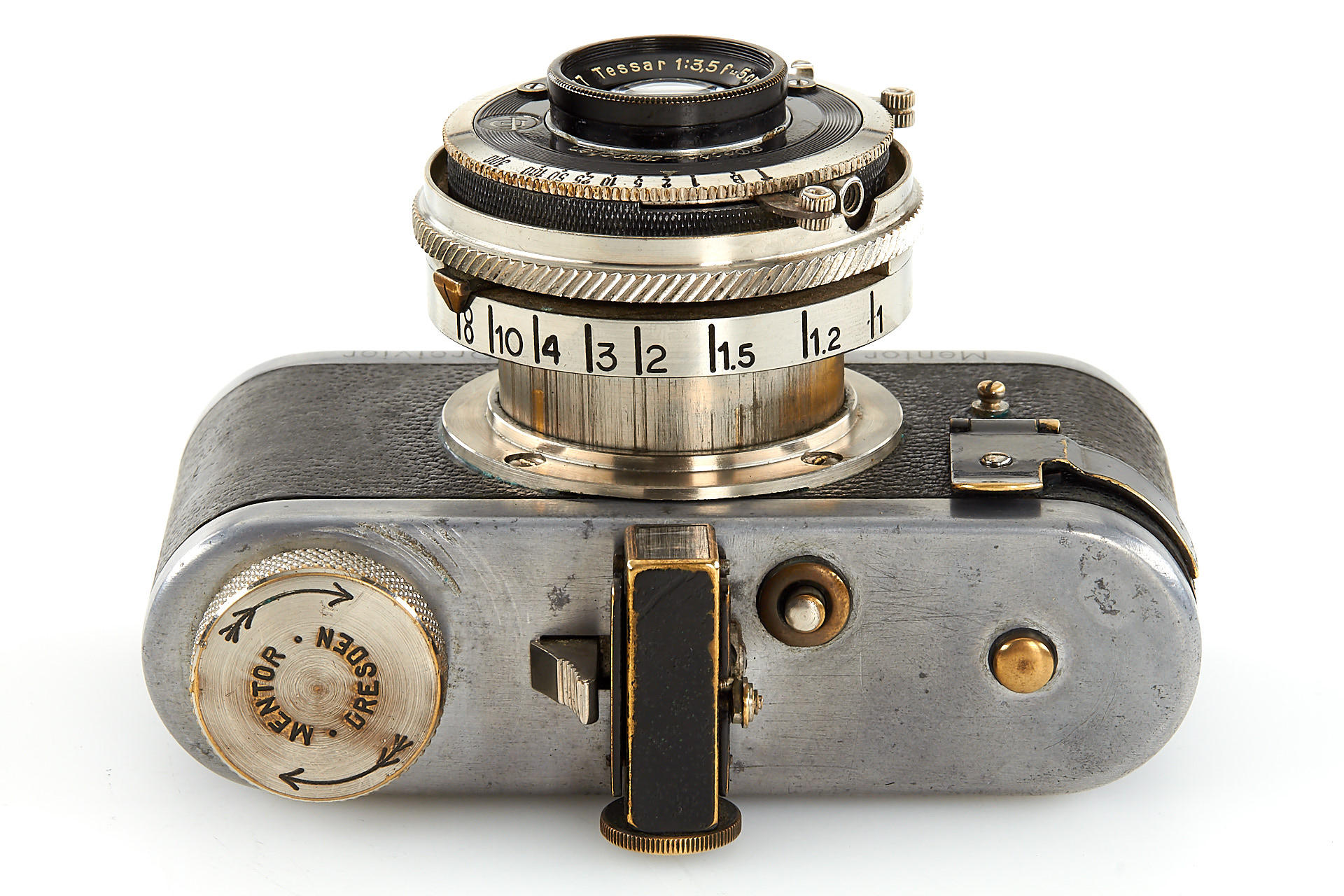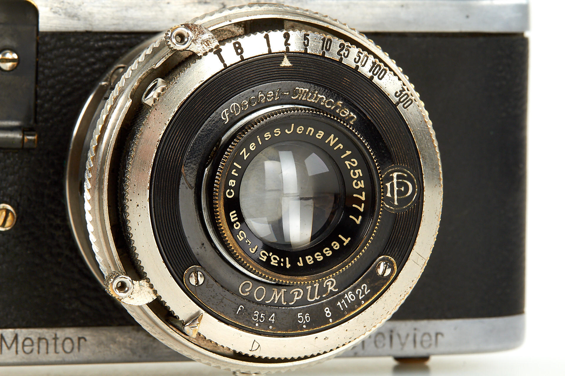 very rare chrome-plated Mentor Dreivier, in fine condition (original chrome plating now almost entirely gone, showing the bare aluminum), with Tessar 3.5/5cm no.1253777