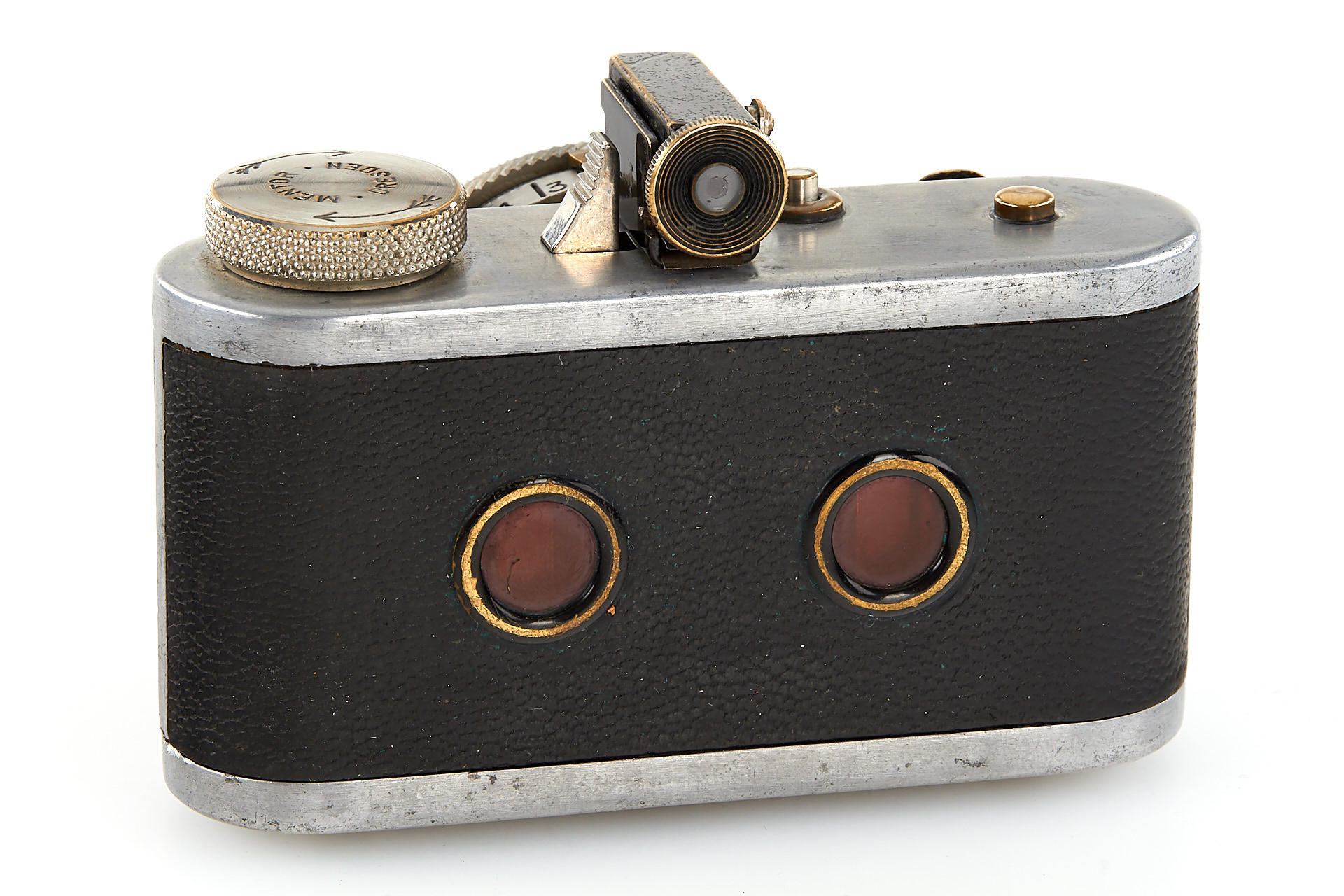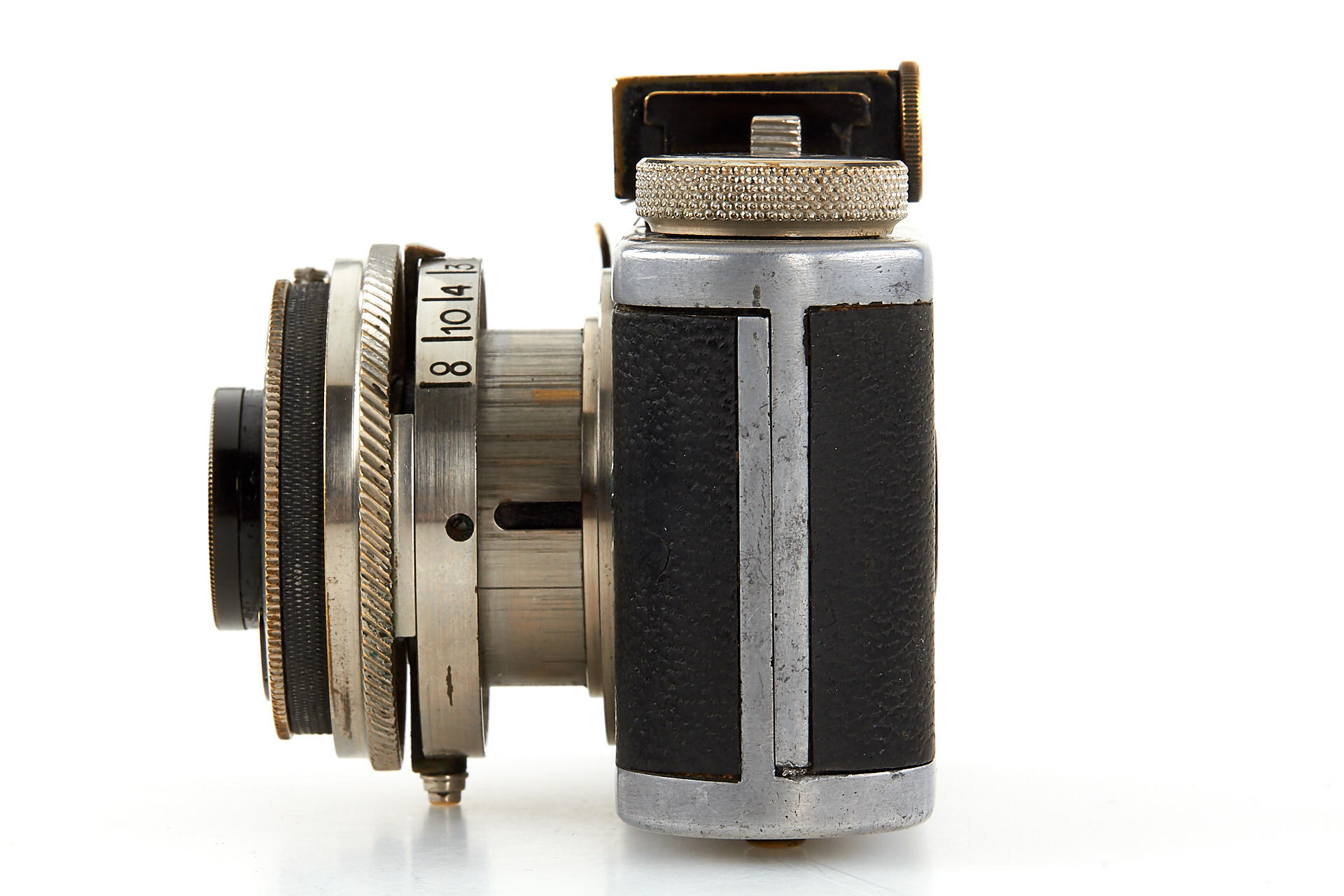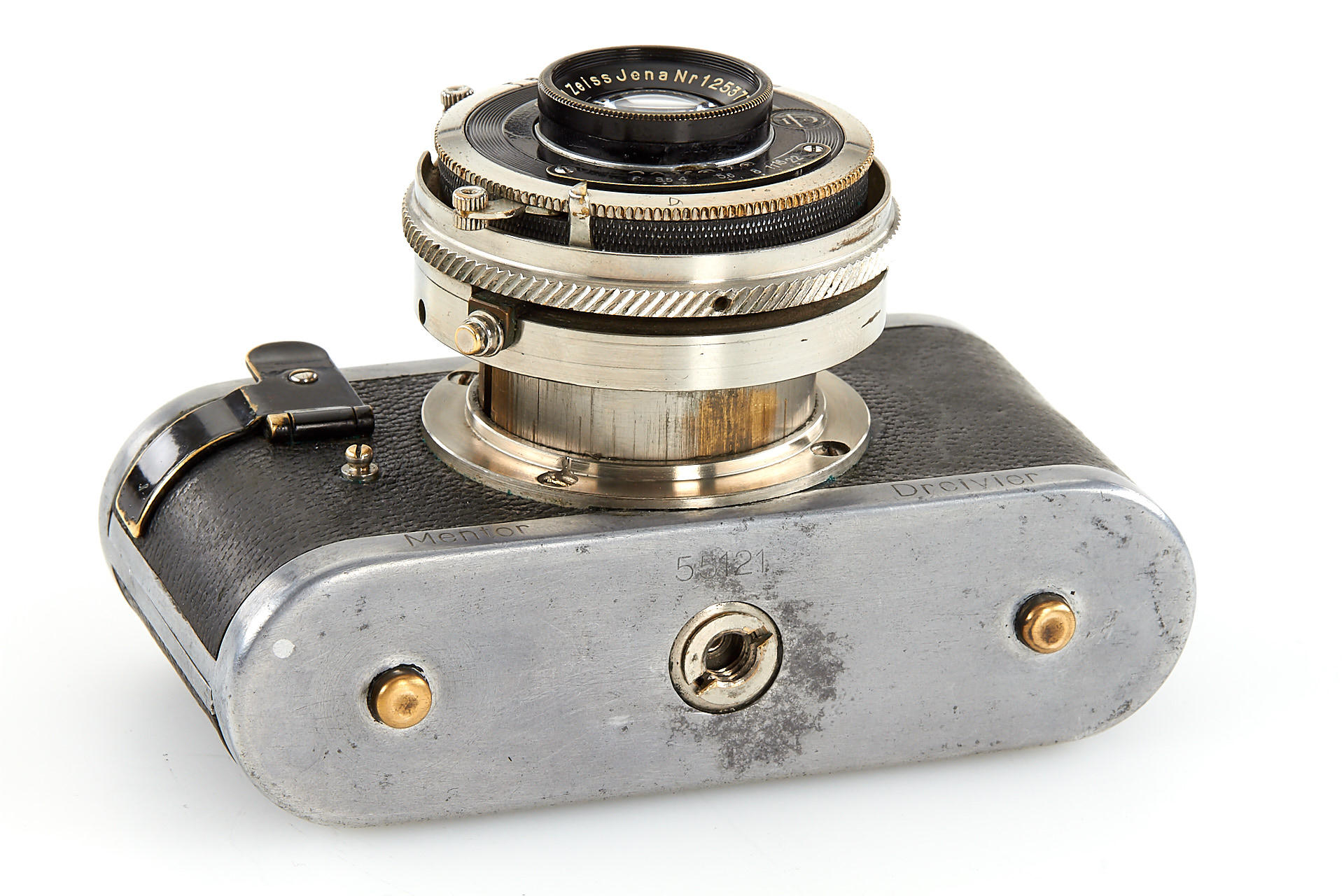 very rare chrome-plated Mentor Dreivier, in fine condition (original chrome plating now almost entirely gone, showing the bare aluminum), with Tessar 3.5/5cm no.1253777