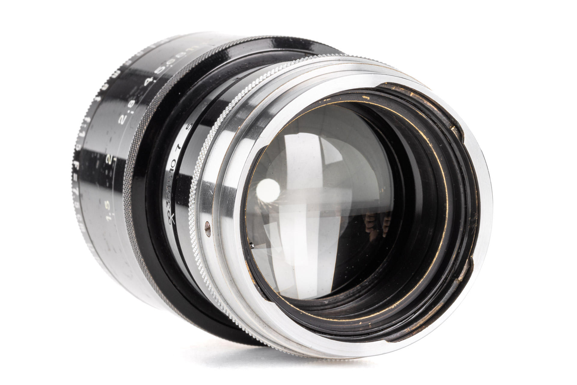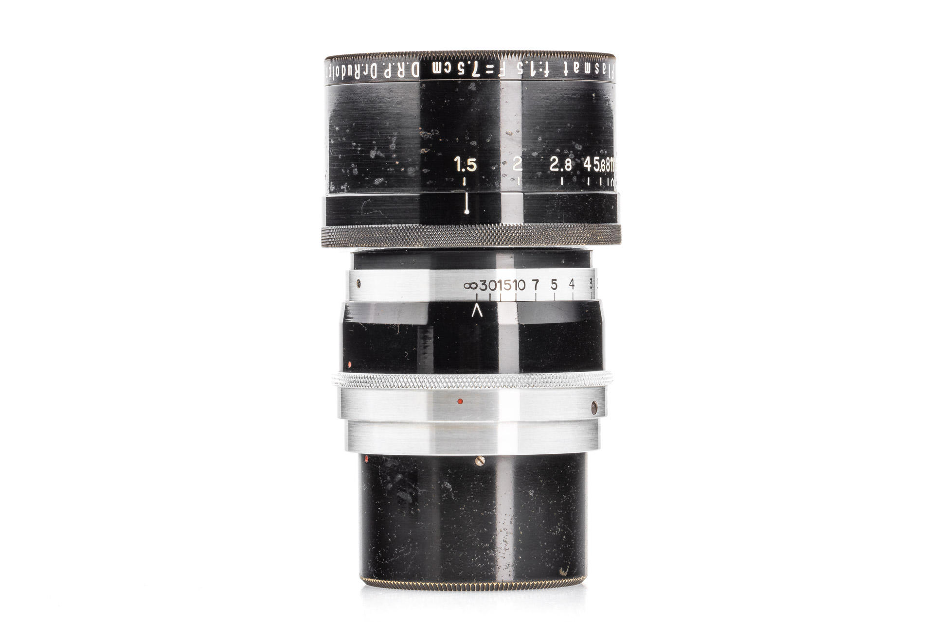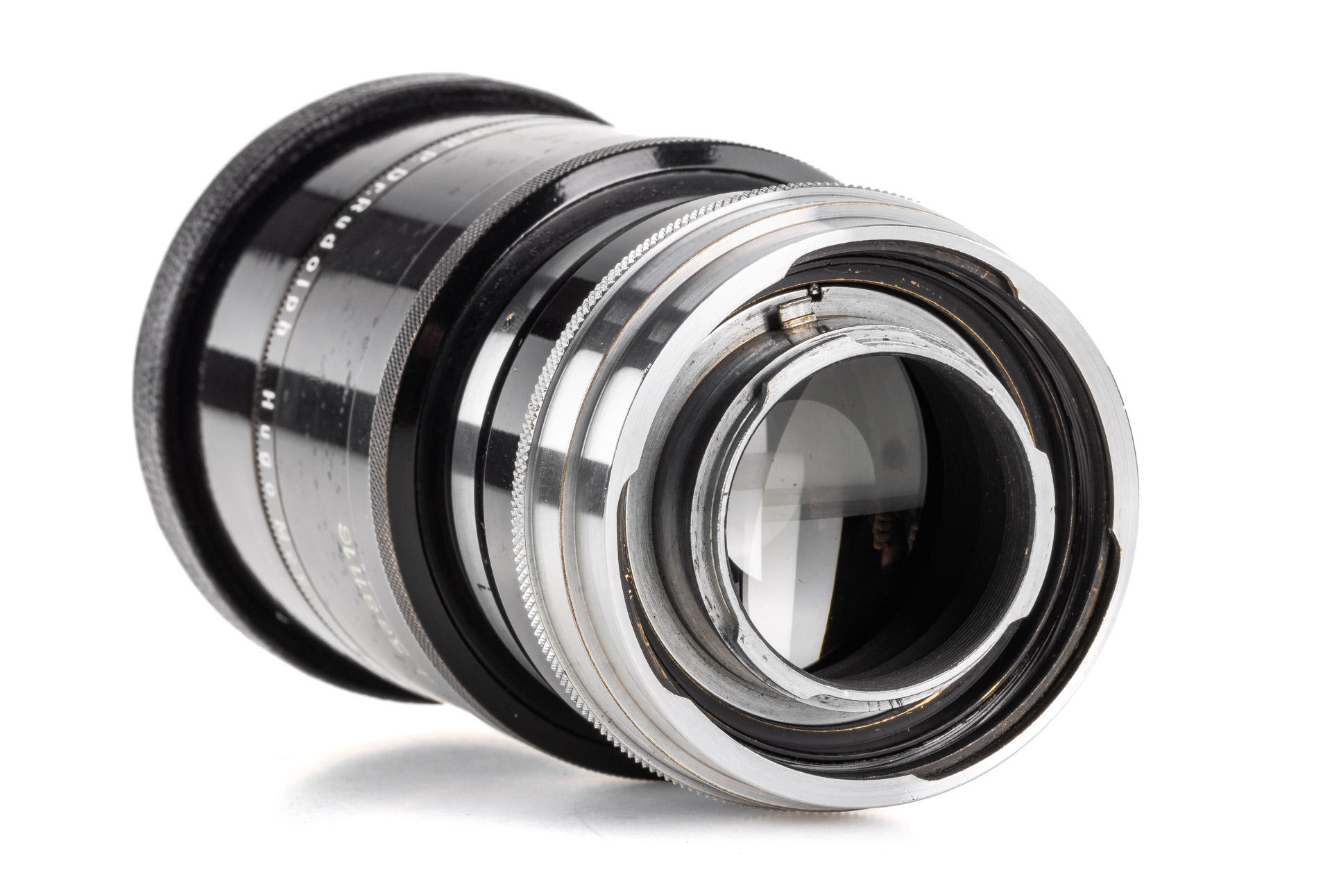 an extremely rare Kino Plasmat 7.5cm in original Contax mount, designed to be mounted on both inner and outer Contax mount simultaneously (!), the outer mount ensures an optimal stability of this heavy lens, the inner mount is responsible for the focus coupling. The lens is in beautiful condition, with very good optics, and comes with a hood and both caps. Only a few examples of this rare lens are known to exist - this may well be the best preserved one.