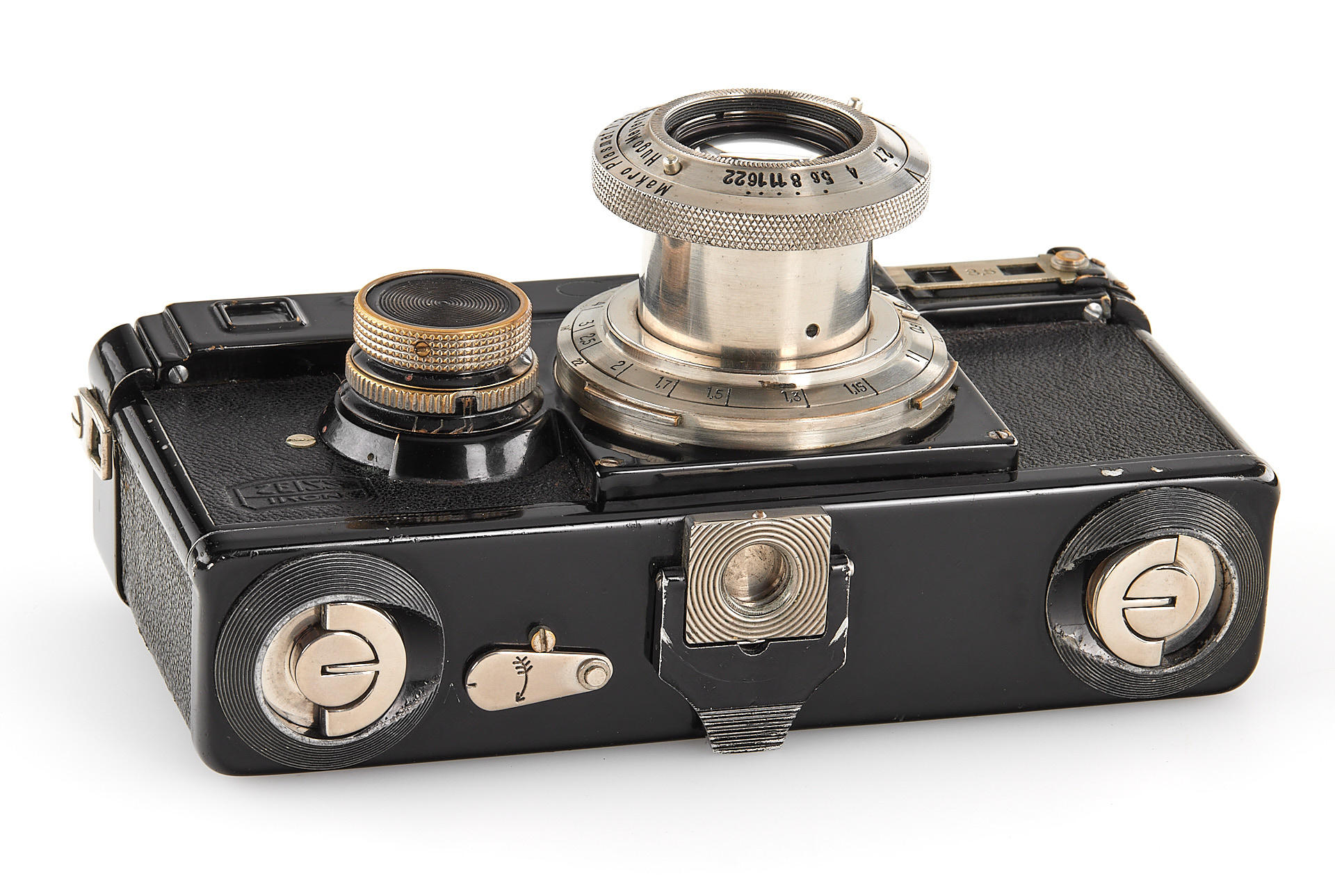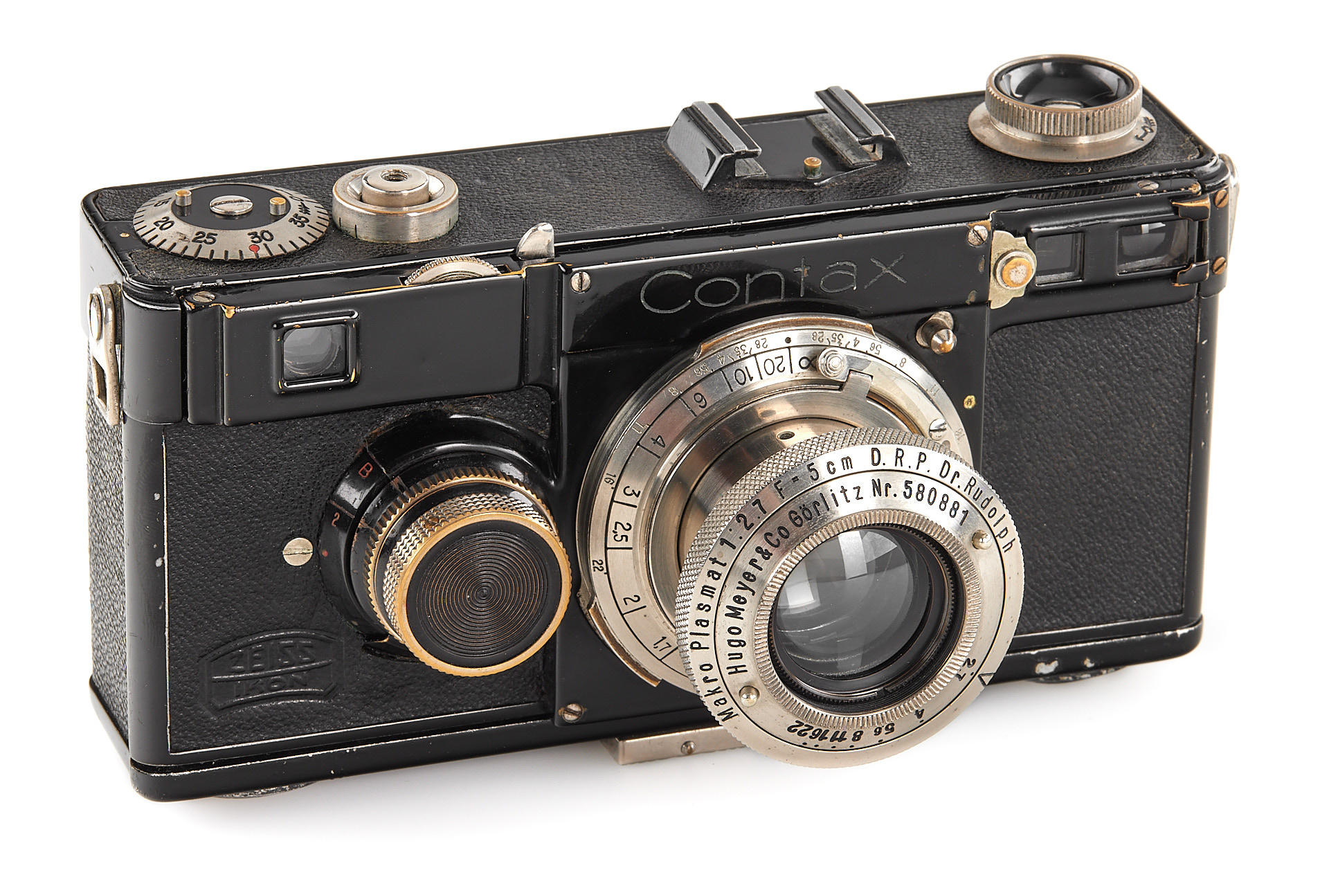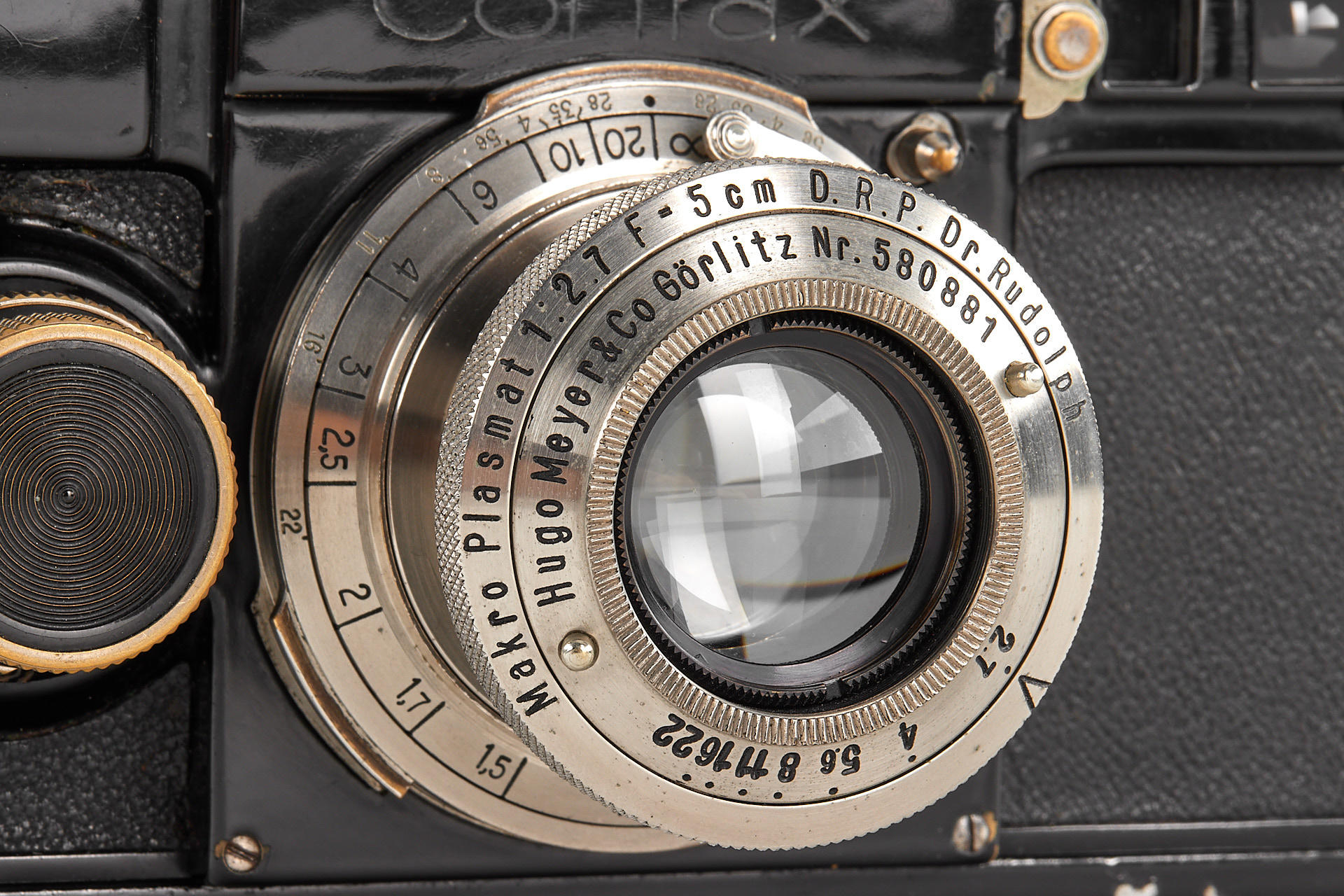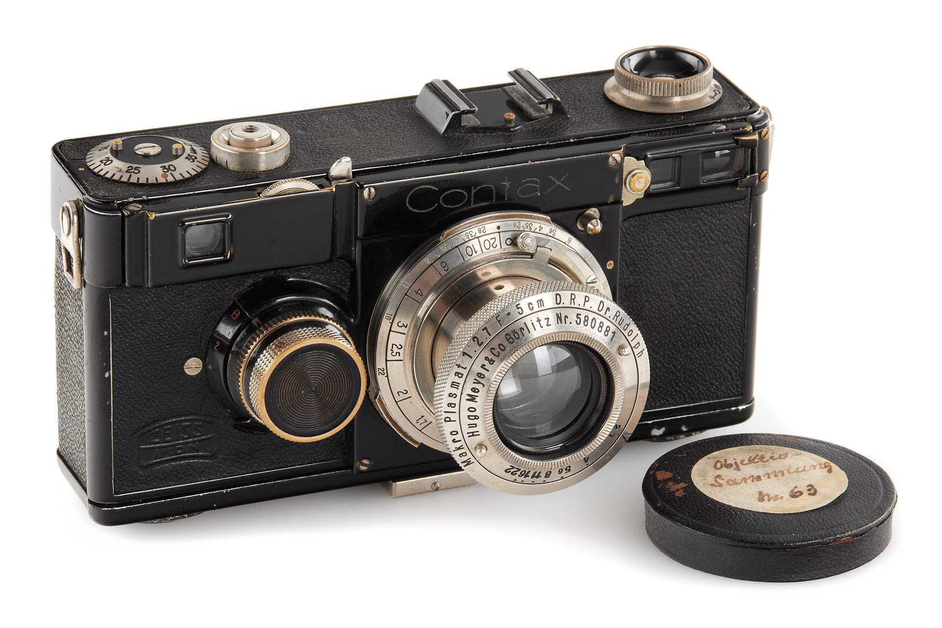 The only known example of the nickel-finished Makro Plasmat 2.7/5cm in original Contax I mount. Probably made for presentation purposes or as a prototype. With special leather front cap with an inventory sticker from a pre-war Carl Zeiss Jena Museum 'Objektiv Sammlung Nr.63' (lens collection no.63, - also see more Zeiss museum pieces in the Zeiss category). In near-mint condition with very good optics, mounted on a Contax I Version 5 body in very good working condition.