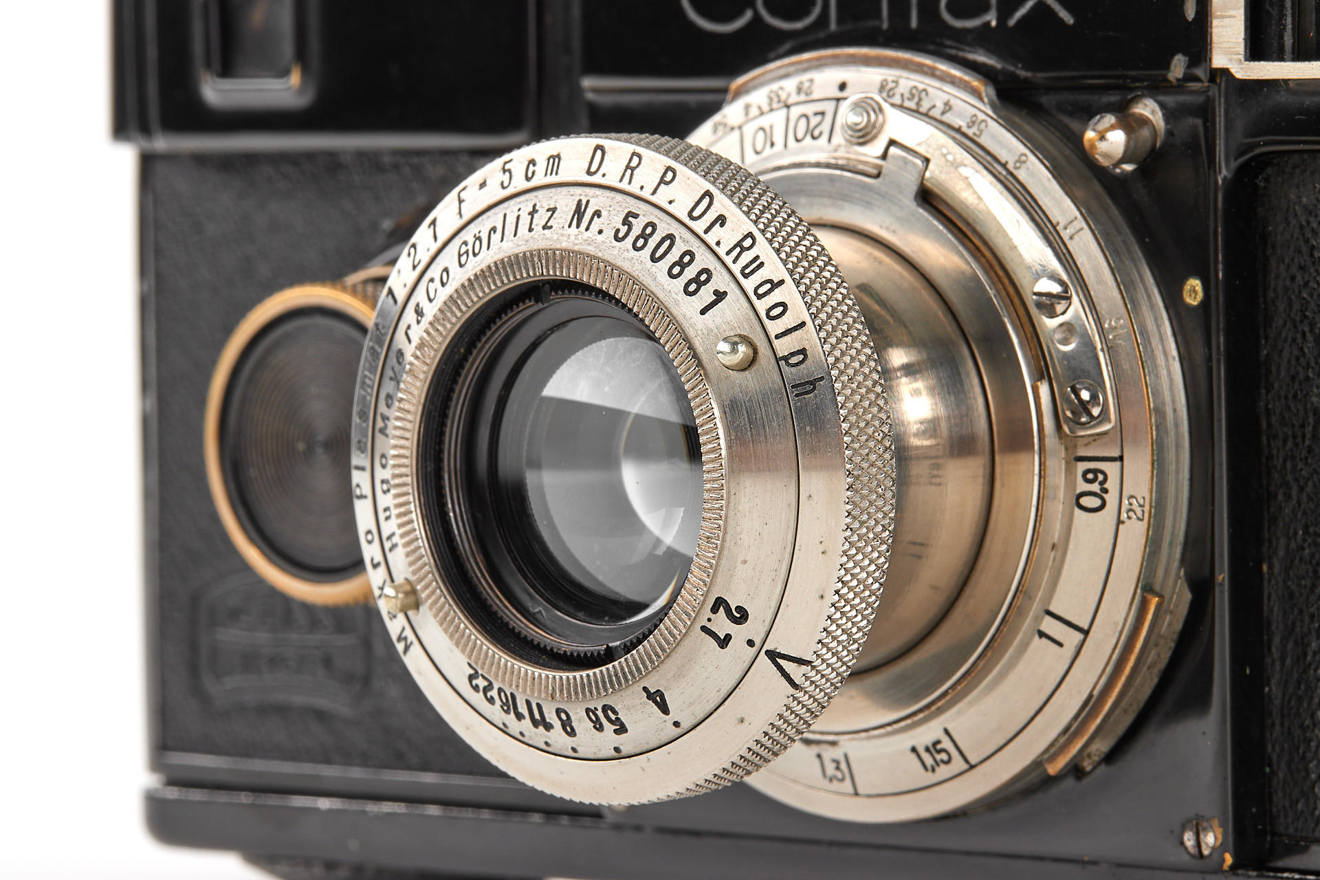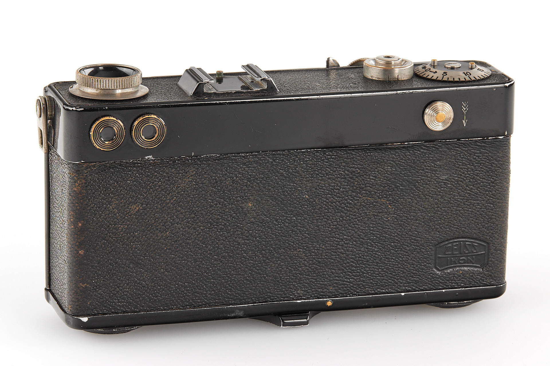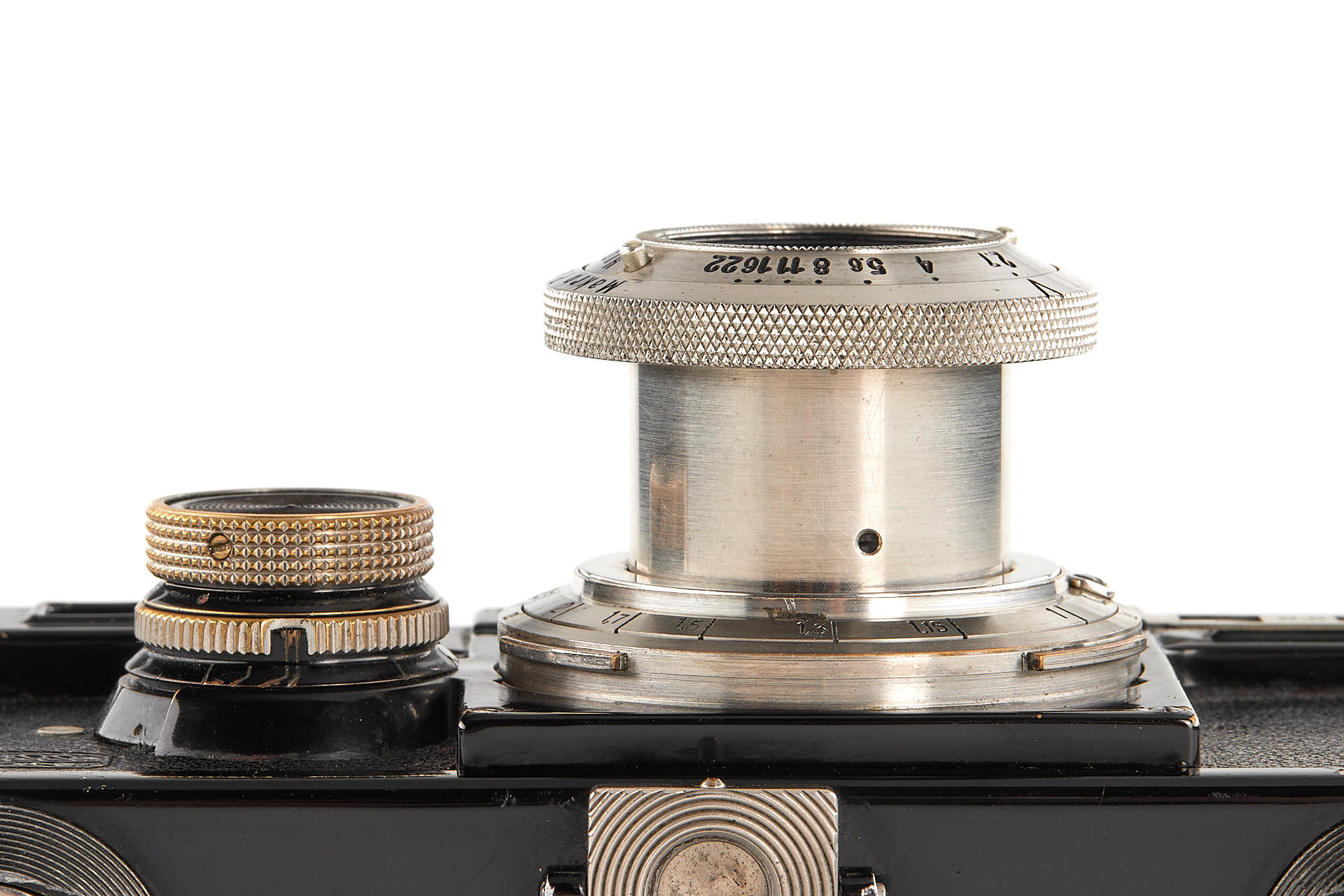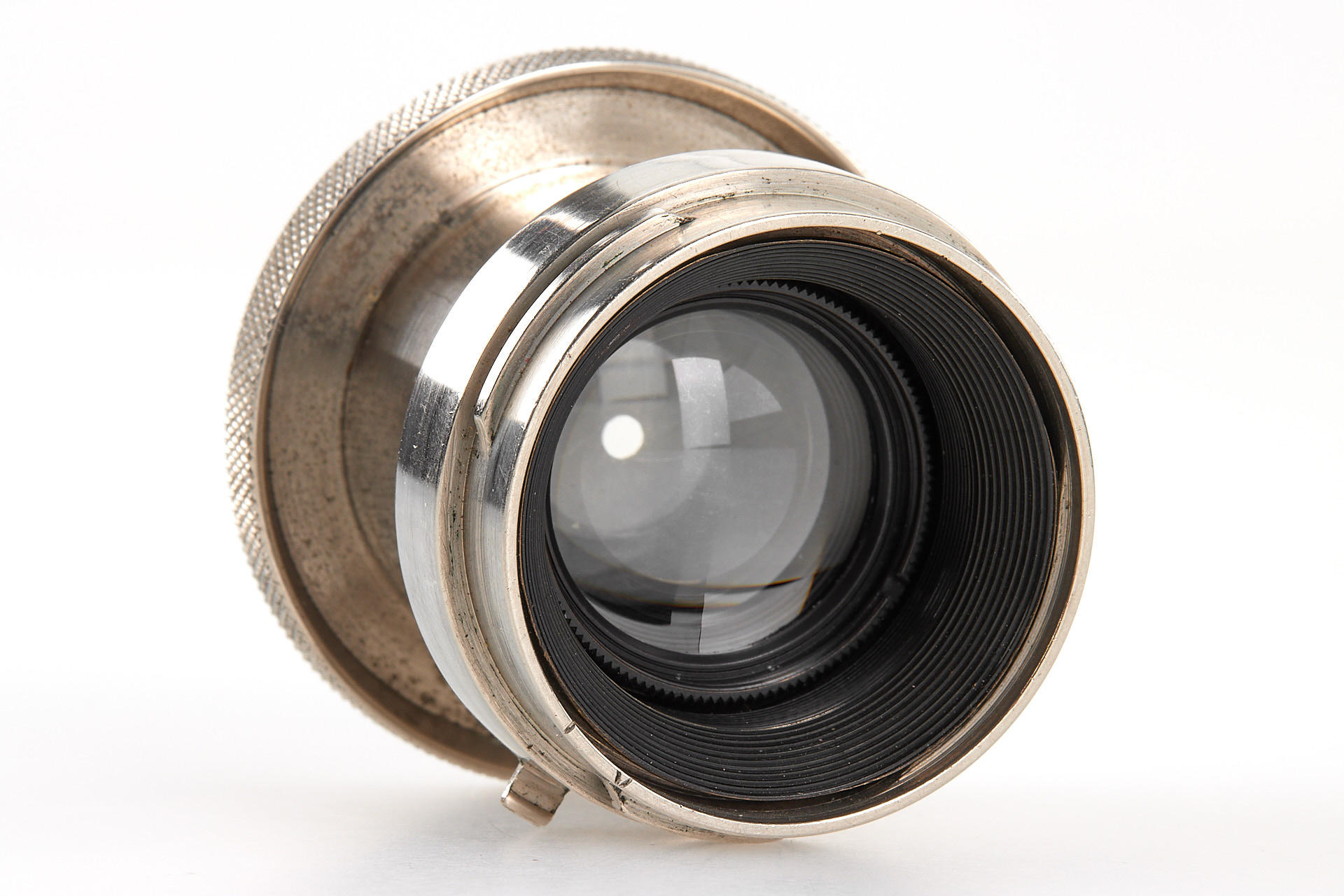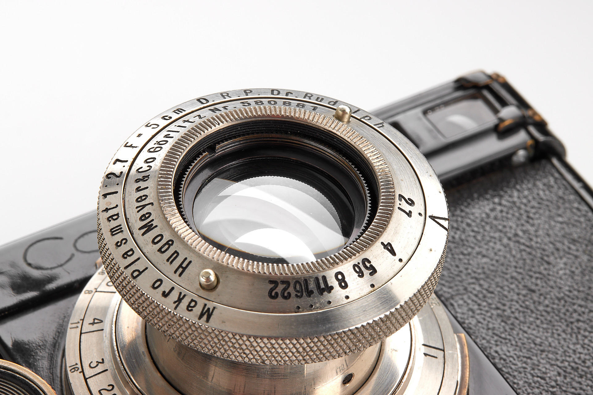 The only known example of the nickel-finished Makro Plasmat 2.7/5cm in original Contax I mount. Probably made for presentation purposes or as a prototype. With special leather front cap with an inventory sticker from a pre-war Carl Zeiss Jena Museum 'Objektiv Sammlung Nr.63' (lens collection no.63, - also see more Zeiss museum pieces in the Zeiss category). In near-mint condition with very good optics, mounted on a Contax I Version 5 body in very good working condition.