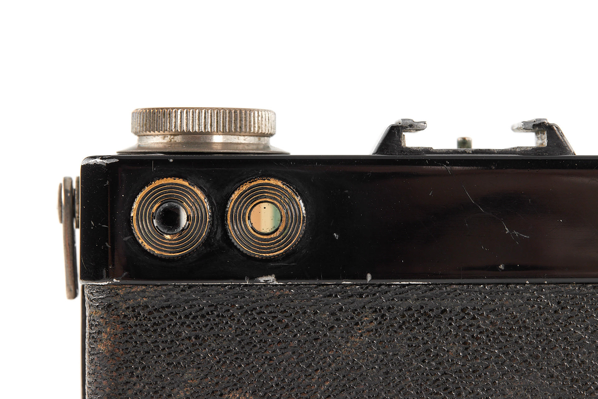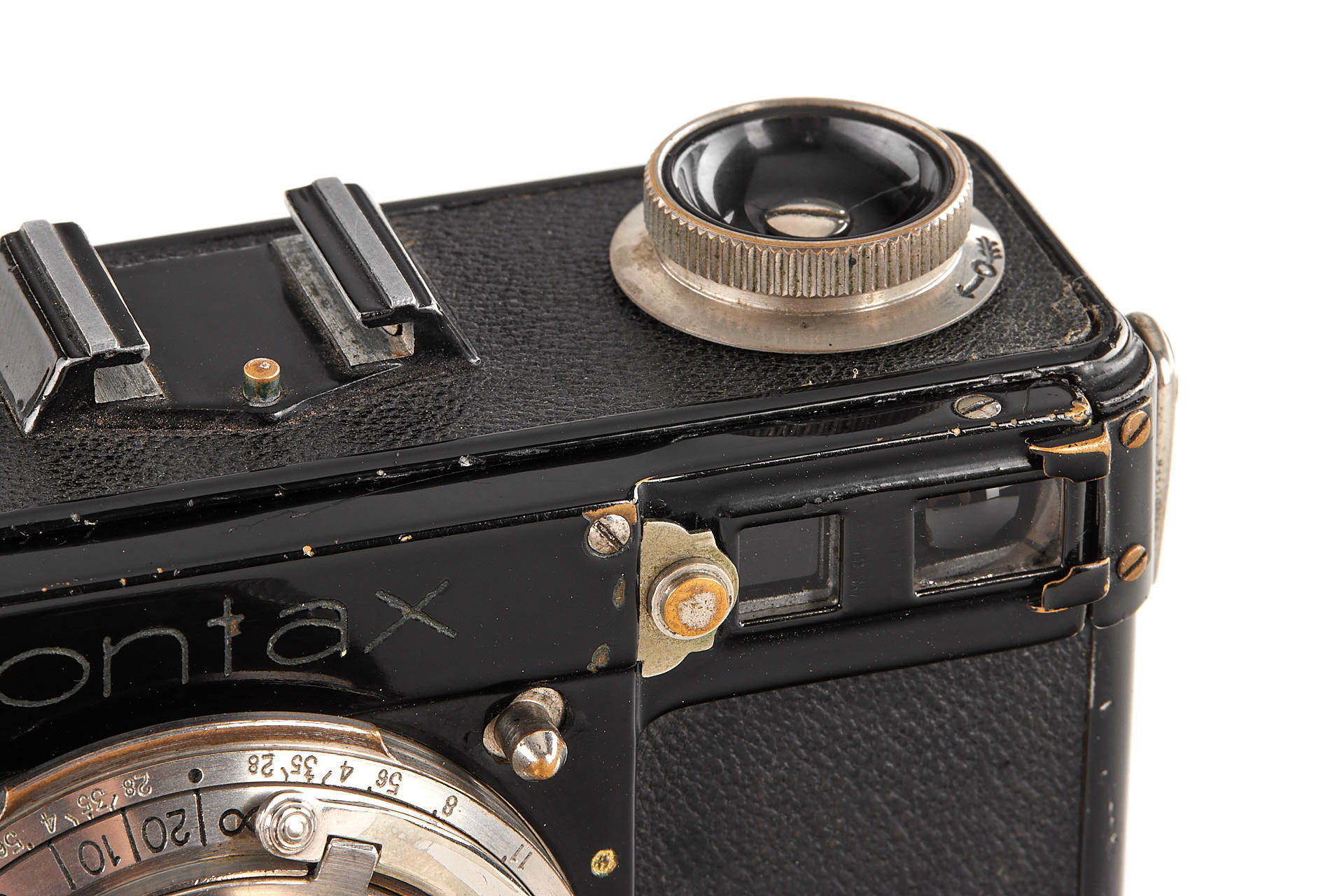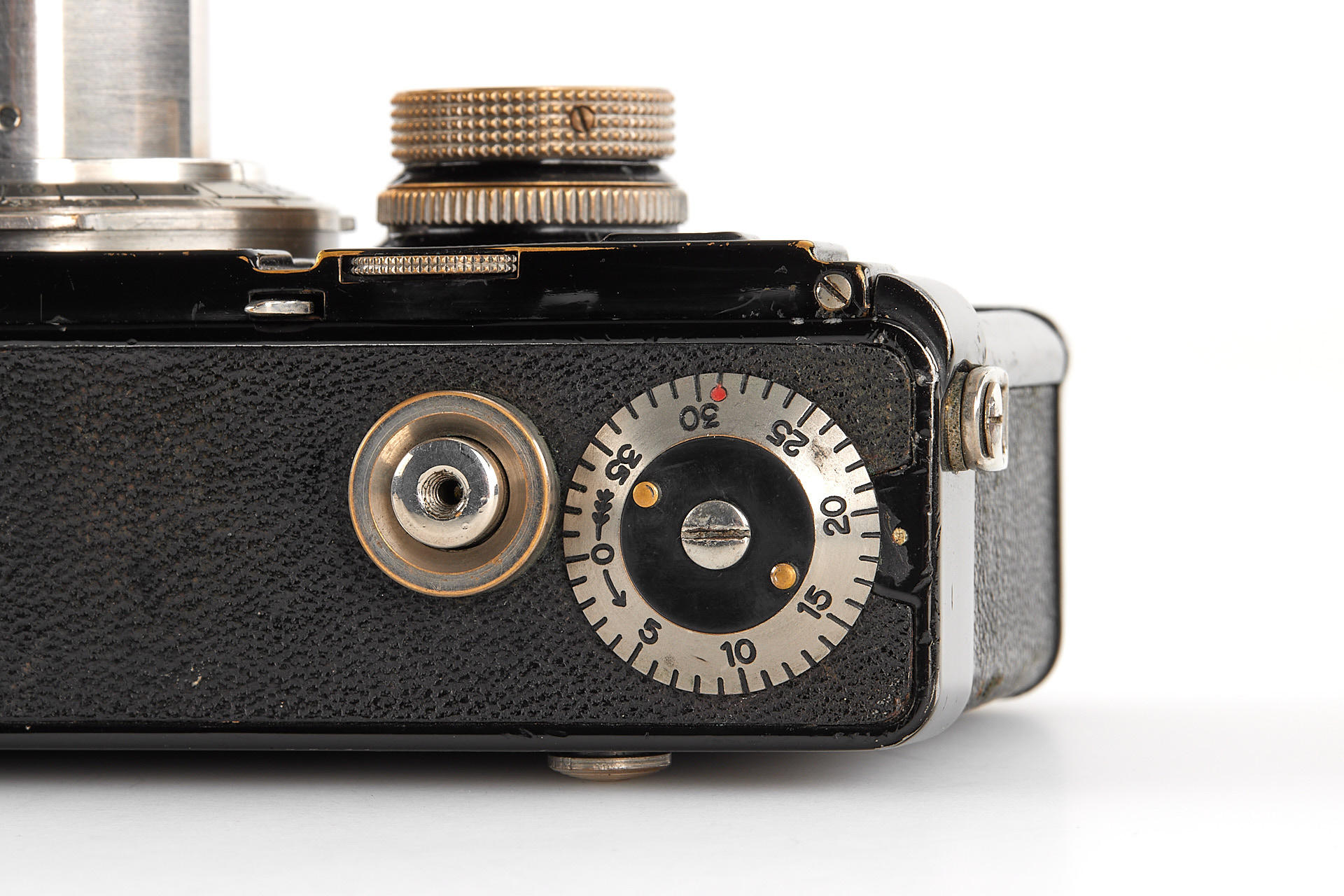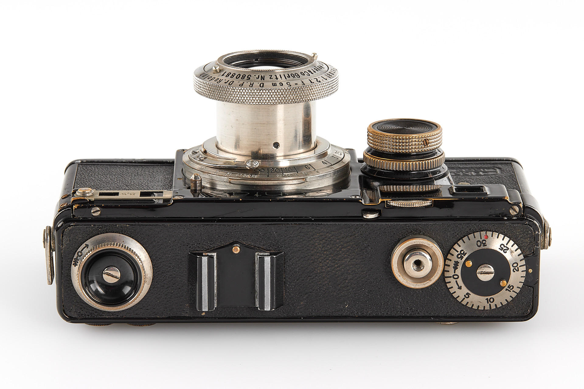 The only known example of the nickel-finished Makro Plasmat 2.7/5cm in original Contax I mount. Probably made for presentation purposes or as a prototype. With special leather front cap with an inventory sticker from a pre-war Carl Zeiss Jena Museum 'Objektiv Sammlung Nr.63' (lens collection no.63, - also see more Zeiss museum pieces in the Zeiss category). In near-mint condition with very good optics, mounted on a Contax I Version 5 body in very good working condition.