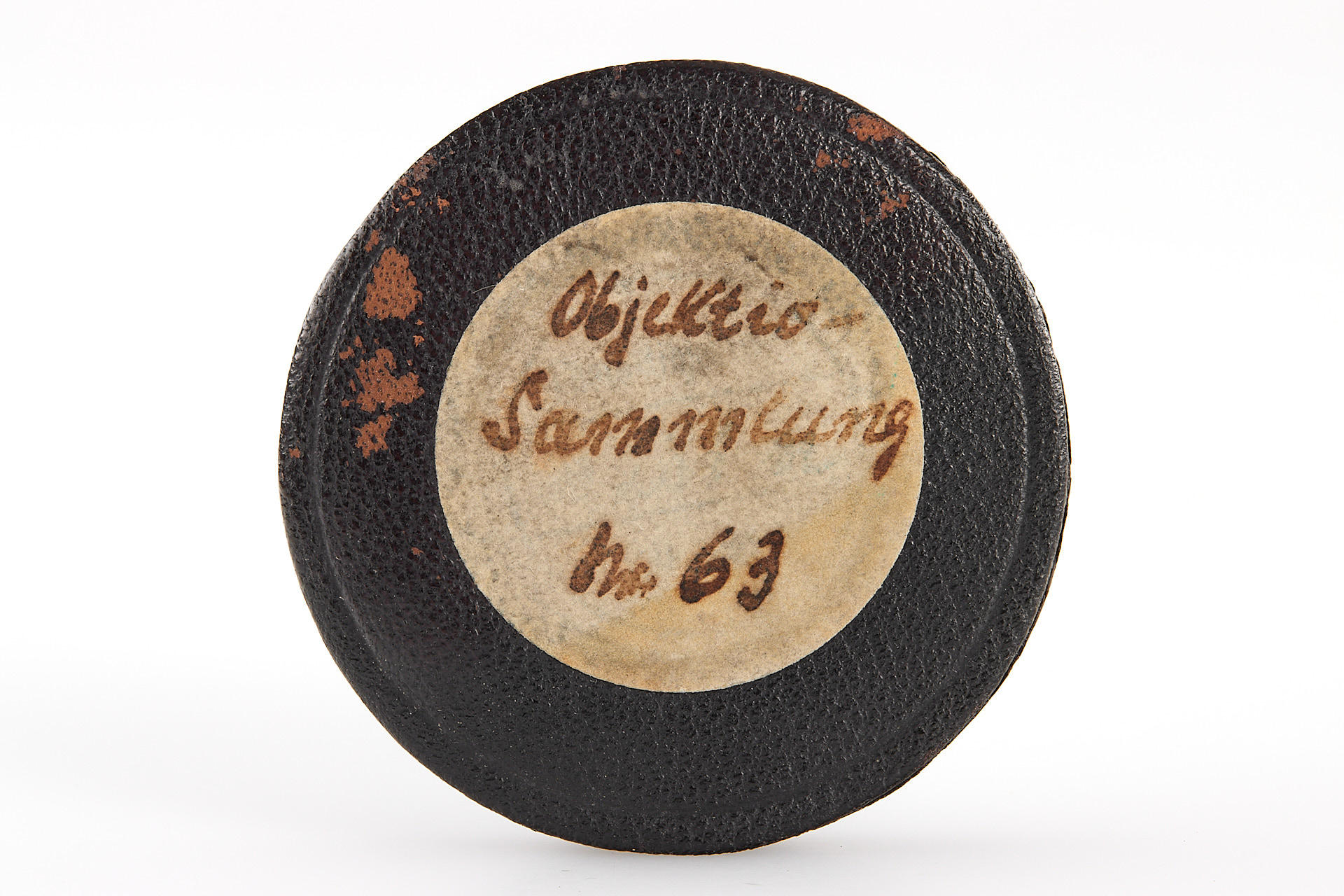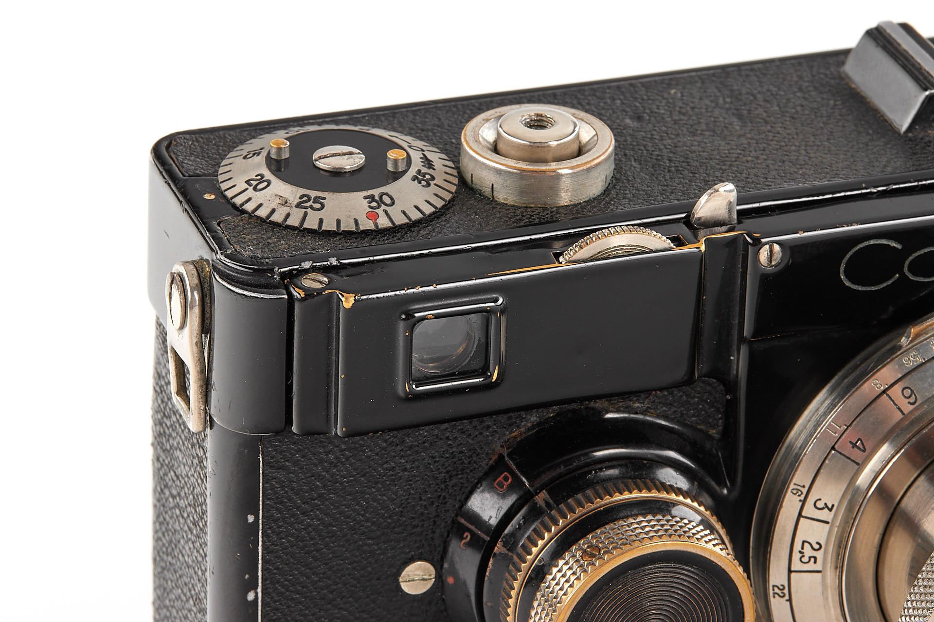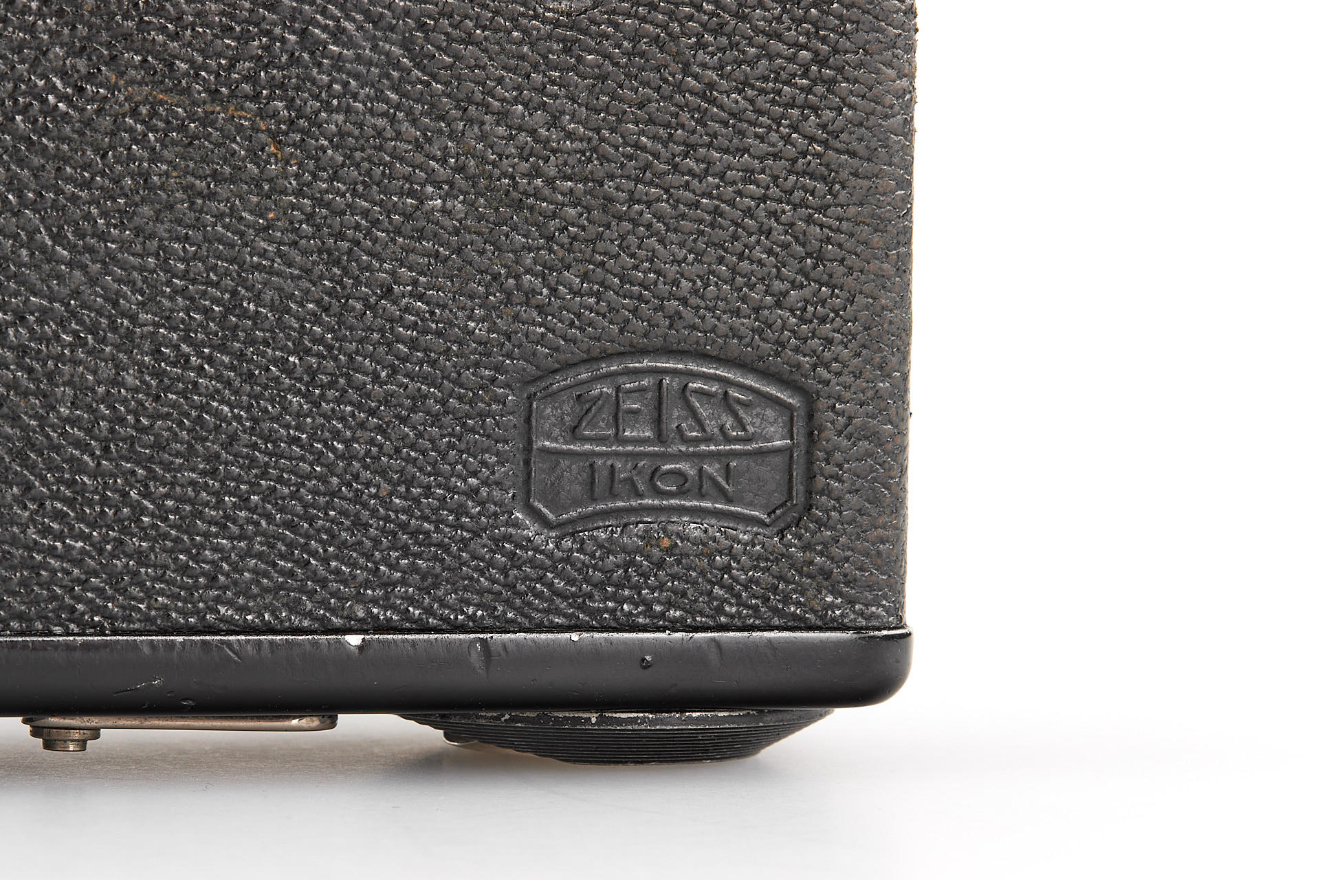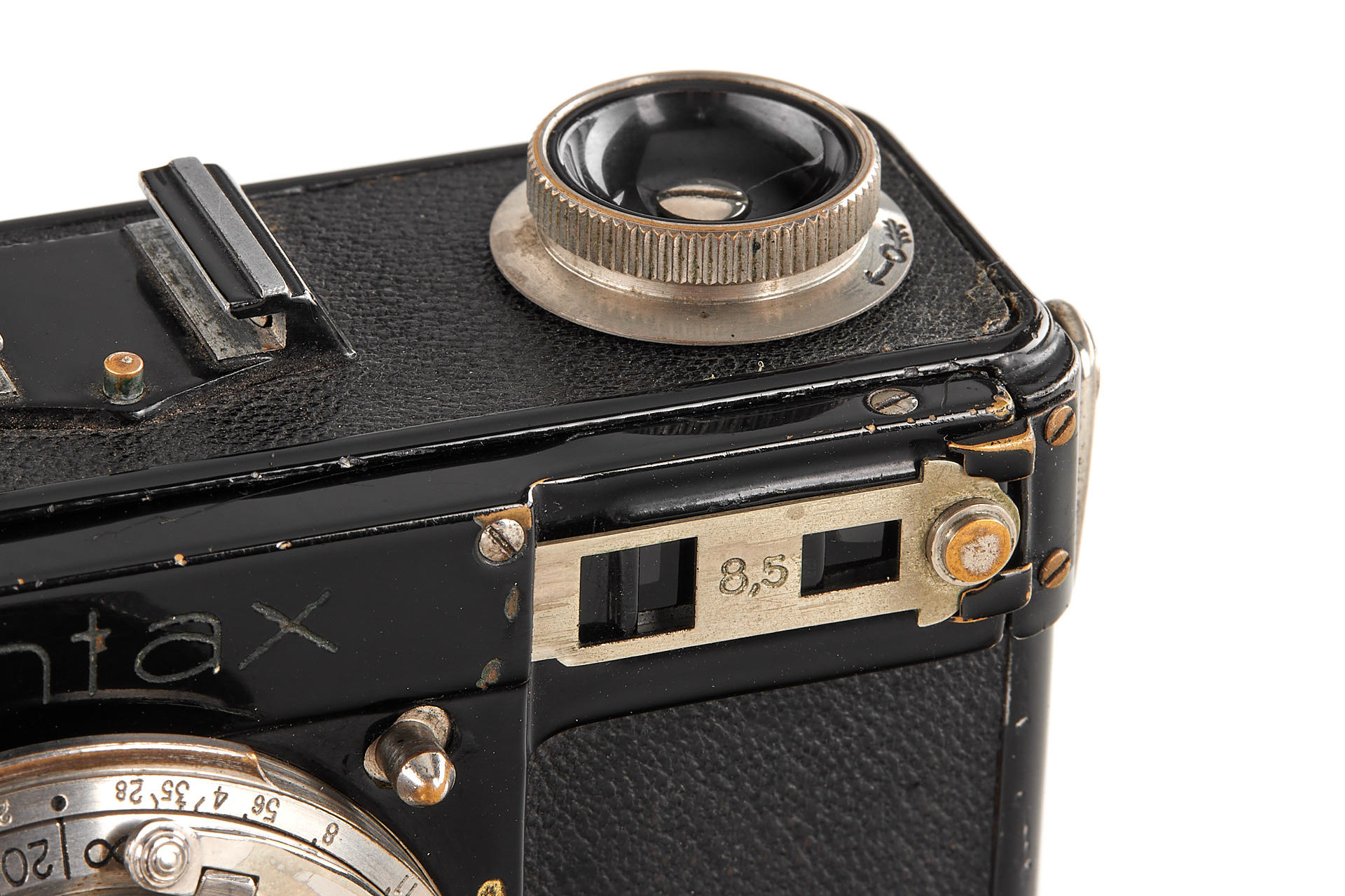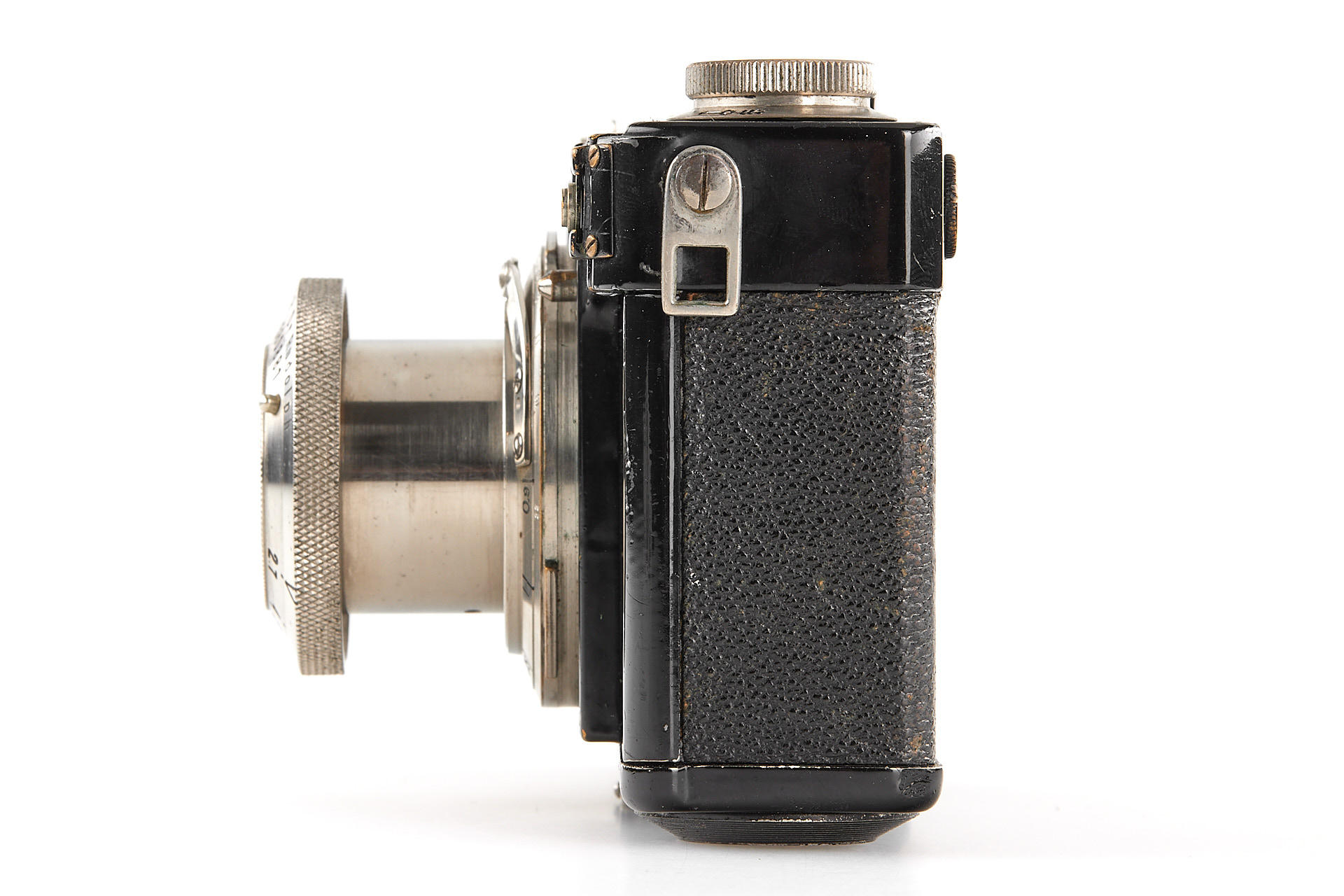 The only known example of the nickel-finished Makro Plasmat 2.7/5cm in original Contax I mount. Probably made for presentation purposes or as a prototype. With special leather front cap with an inventory sticker from a pre-war Carl Zeiss Jena Museum 'Objektiv Sammlung Nr.63' (lens collection no.63, - also see more Zeiss museum pieces in the Zeiss category). In near-mint condition with very good optics, mounted on a Contax I Version 5 body in very good working condition.