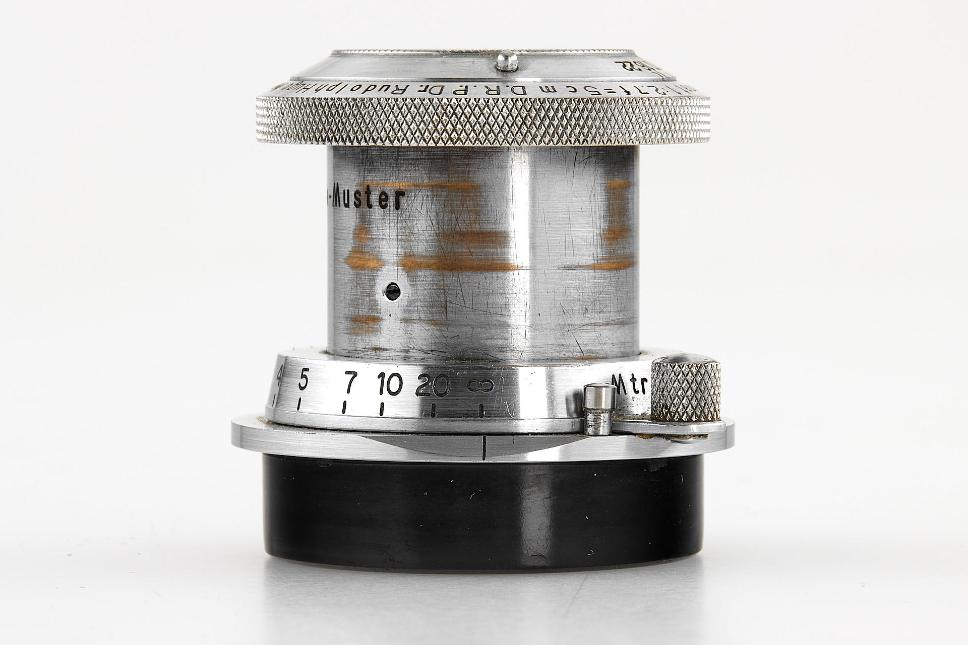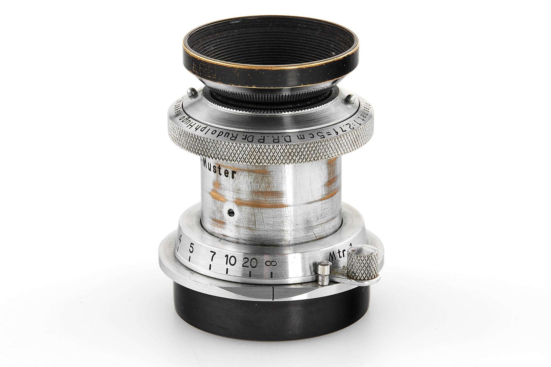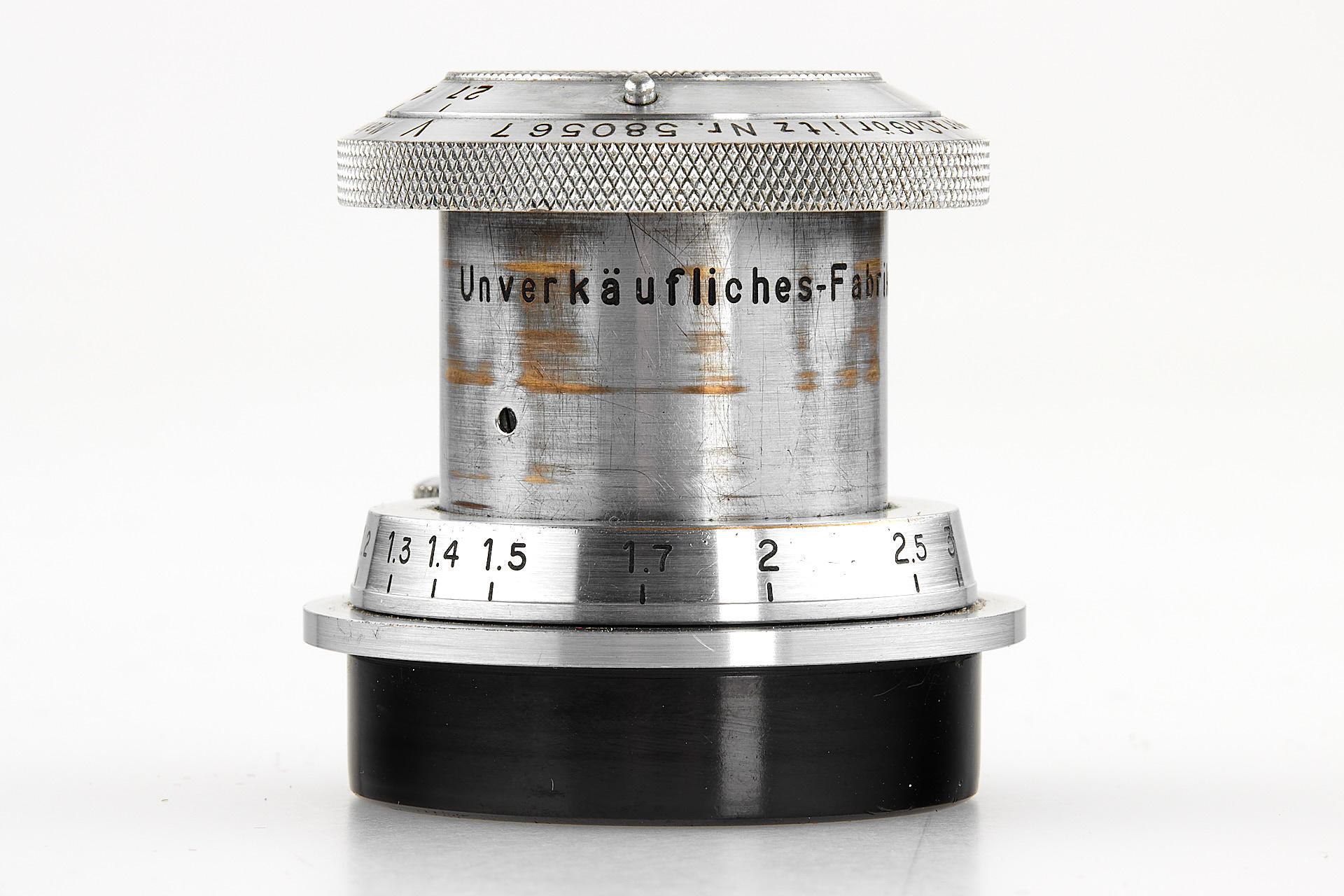 an extremely rare and sought-after Makro Plasmat in original, collapsible rangefinder-coupled Leica M39 mount, engraved on the barrel with 'Unverkäufliches-Fabrik-Muster' (factory sample not for sale), in excellent condition (some wear on the collapsible barrel), very good optics (only minimal flaws), with matching brass hood