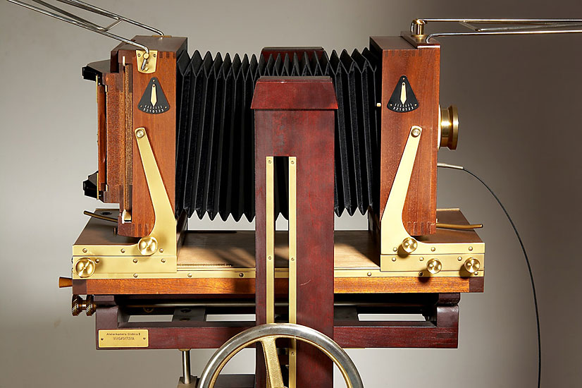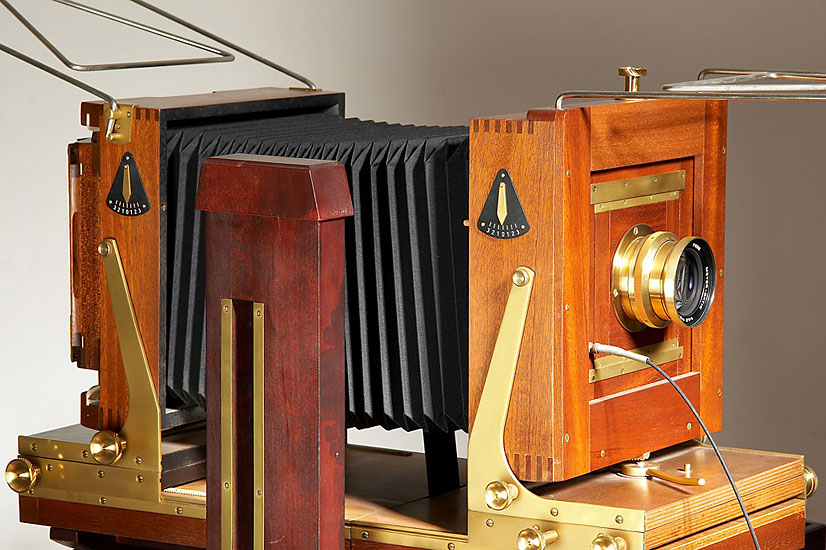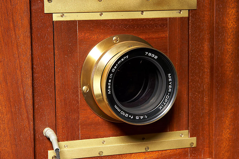 13x18cm luxury studio camera, mahogany body and stable fork-type stand, brass fittings, brass Meyer-Optik 4.5/210mm lens no.7932, silent bellows shutter (Grundner), 3 mahogany double plate holders 13x18cm with folded inserts, tray holder, tray, dark-dent, accessories, papers, impressive, decorative and beautifully manufactured camera from a series of only 40 examples