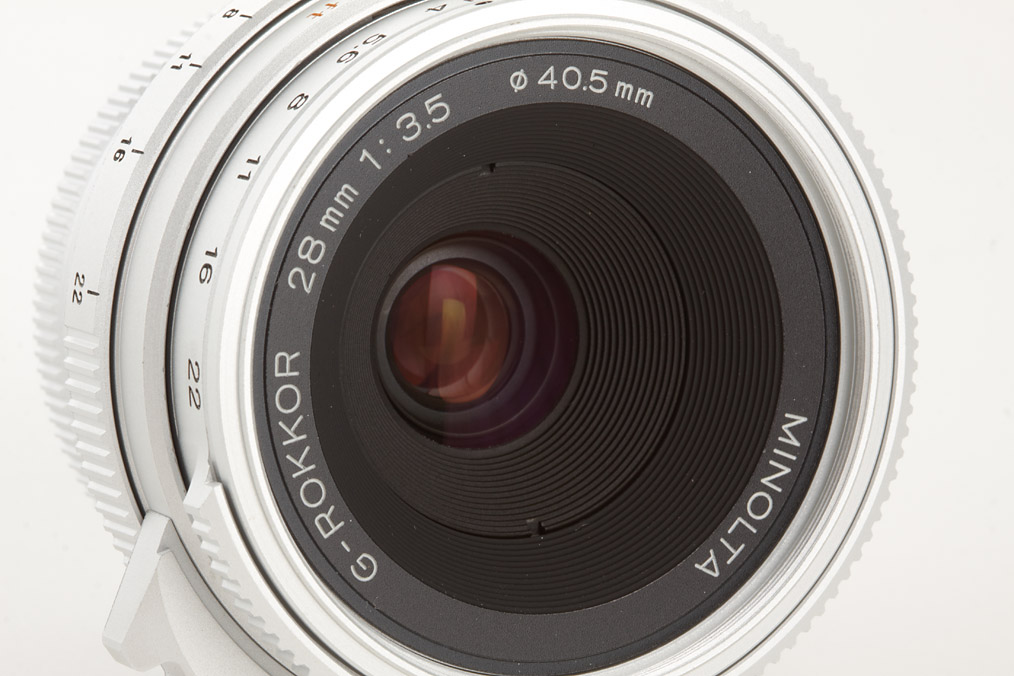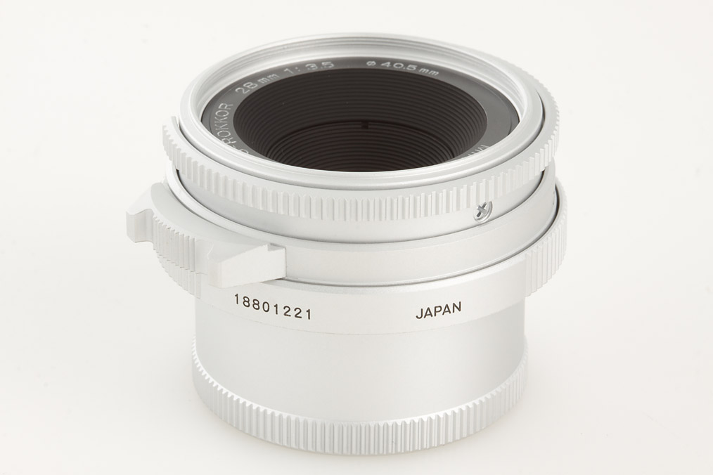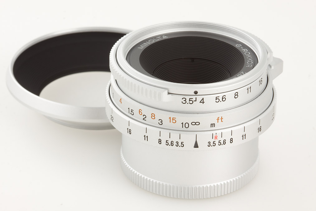 like new, high quality Minolta M39 lens with hood, caps, papers and maker's box