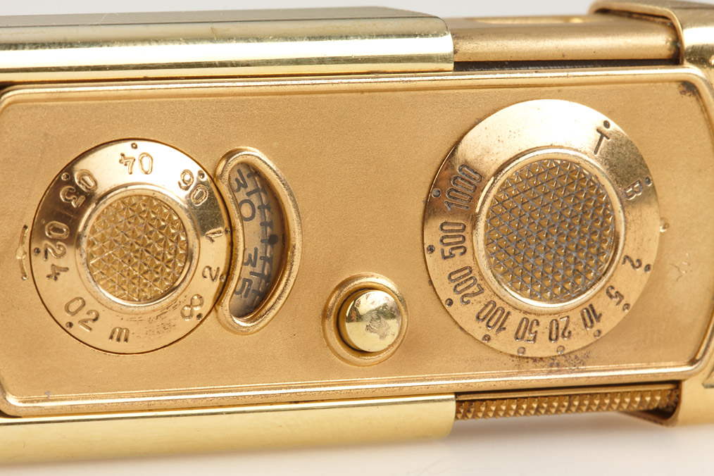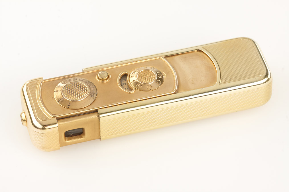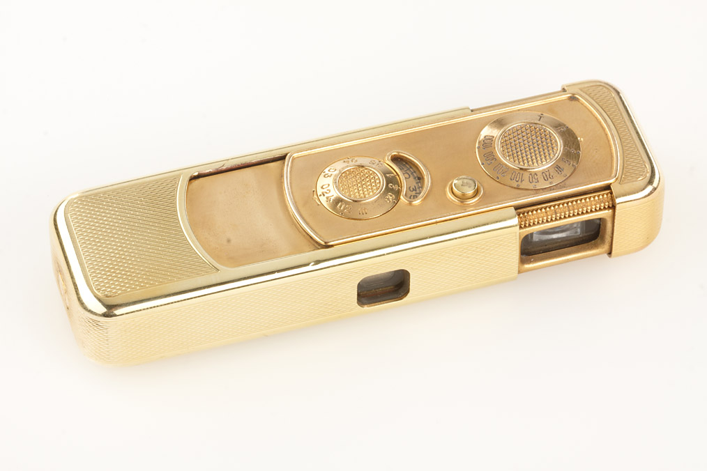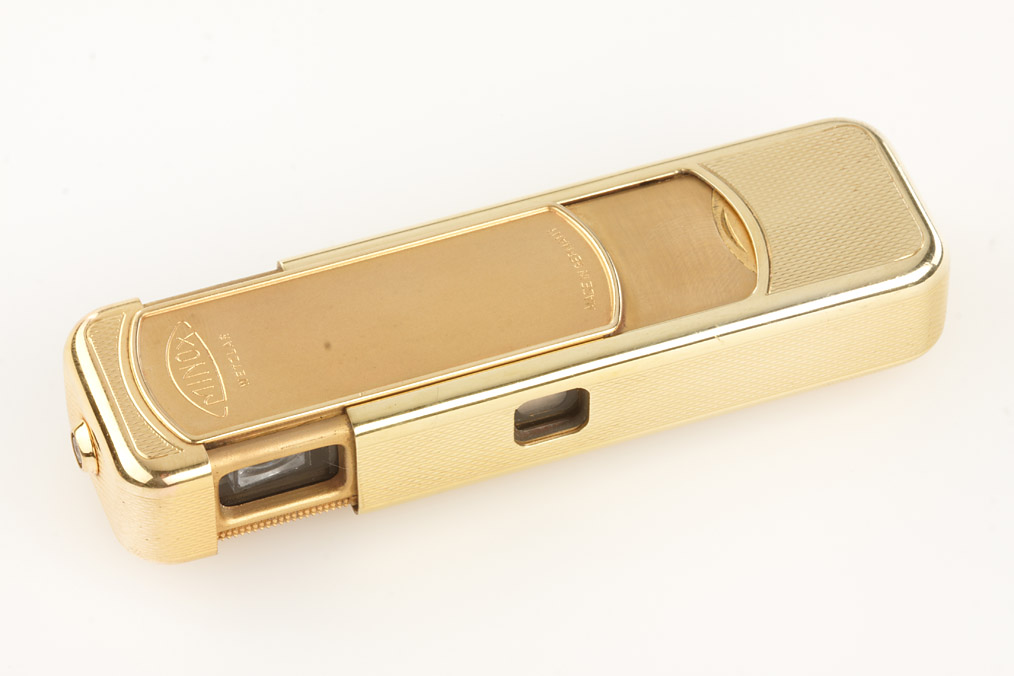 Minox A engraved Wetzlar, in meter, synchronised, gold-plated, brass body (only gold-plated cameras had the over 100g in weight brass body). Optically and technically in very good condition. Early gold-plated Minox are extremely rare. With gold-plated chain and a beautiful snake-skin slip case