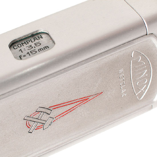 chrome, engraved on the back with pick axe and hammer emblem within a rounded V- symbol, engraving with red infill, with the aid of special equipment Minox cameras were sometimes used to photograph inside shafts that were drilled for various types of surveying, it is possible the logo engraving is that of a mining or surveying company