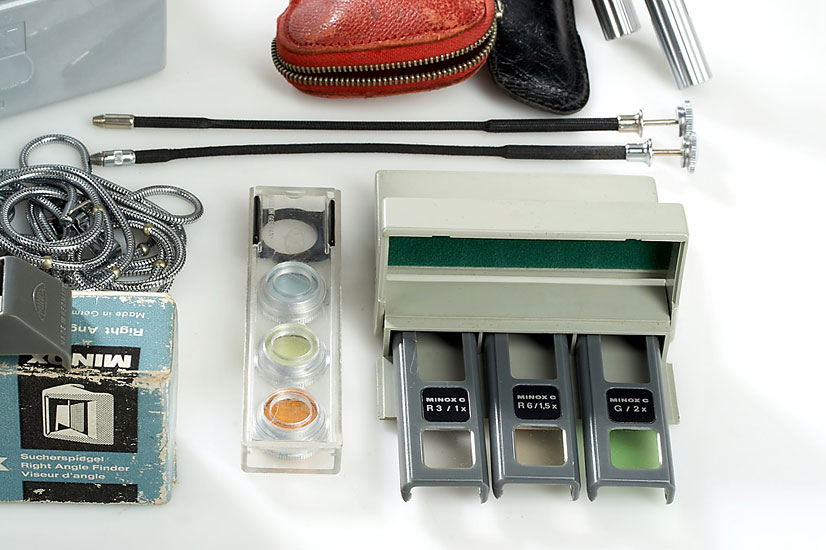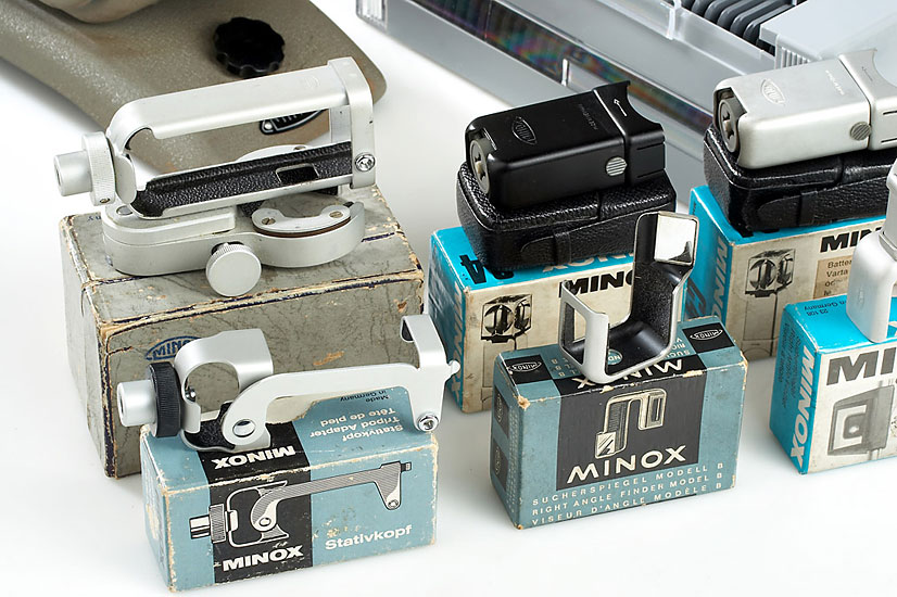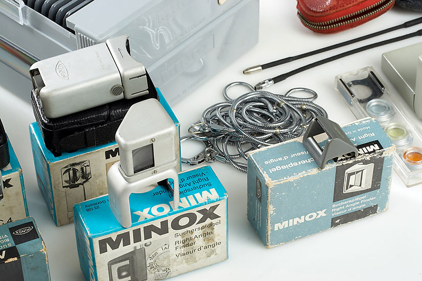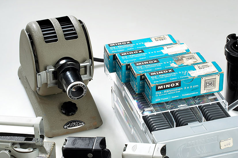 Minox developing tank, Universal-Binocular-Attachment with instructions in maker's box, 3 filter attachments for Minox C in plastic box, 3 filters with adapter, 3 different versions of right angle finders in maker's boxes, 2 cube flasher C4 in black and chrome with instructions in maker's boxes, 2 tripod adapters (1 in maker's box), 3 chains, 2 tripods with cable release in cases, 4 boxes of slide frames 3x3cm, 2 boxes for storage of slide frames, Slide projector type 3001 no.7046 with 2.8/35mm lens in maker's case (23)