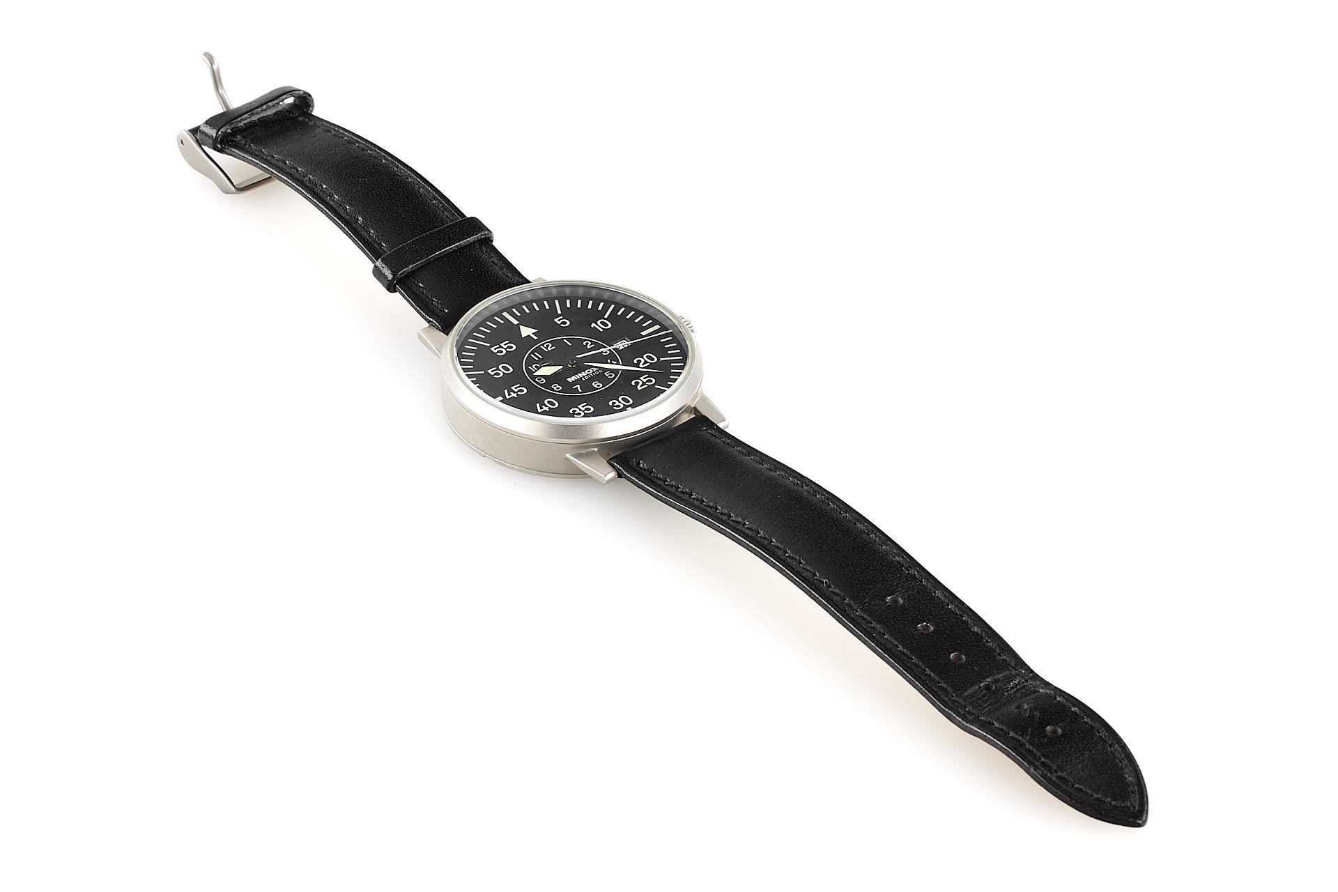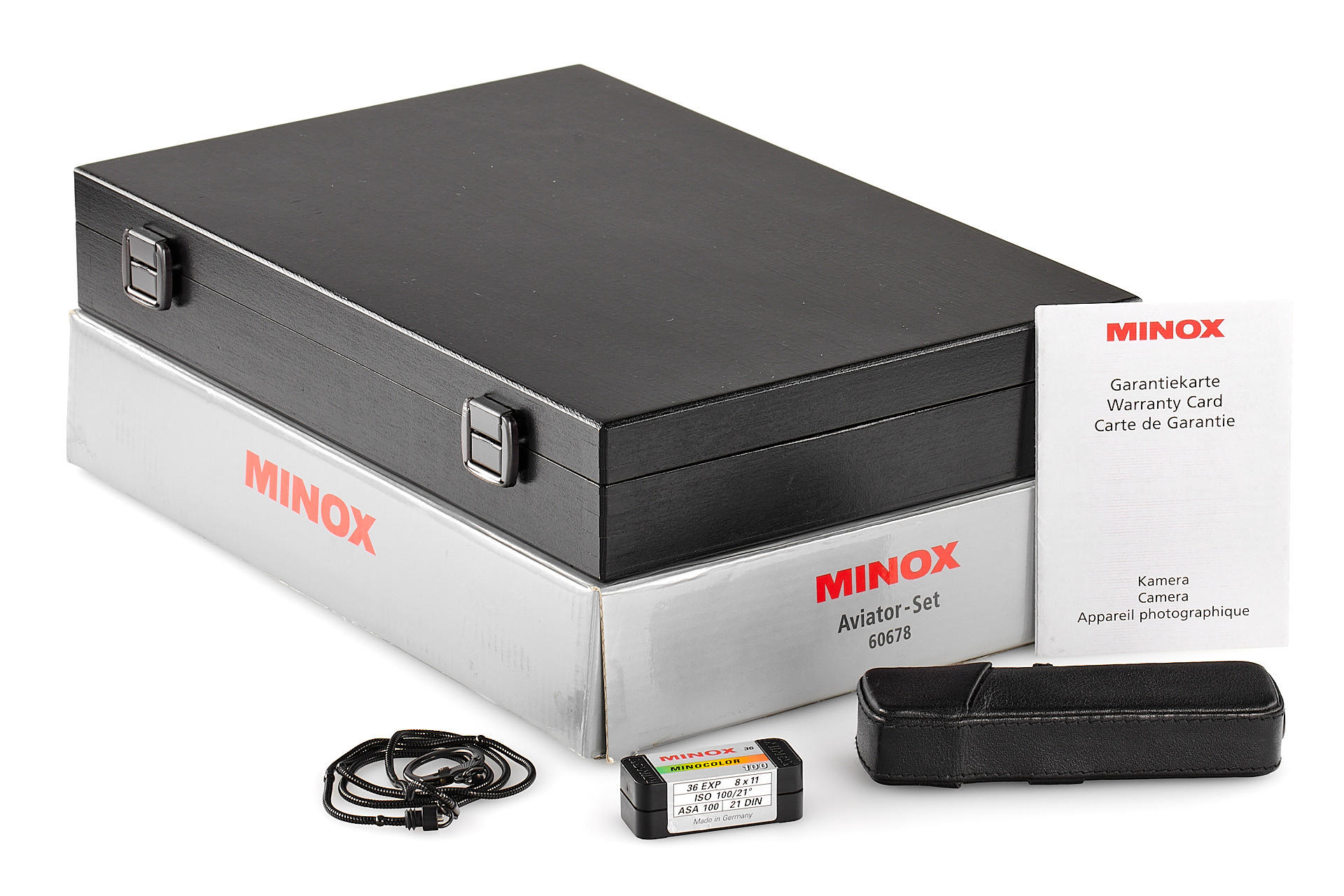 Limited edition Minox LX black 'Aviator Set' in mint condition, complete with leather case, chain, special edition Laco 'Fliegeruhr' automatic watch, papers, warranty card, wooden box and maker's box