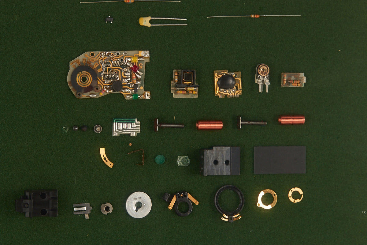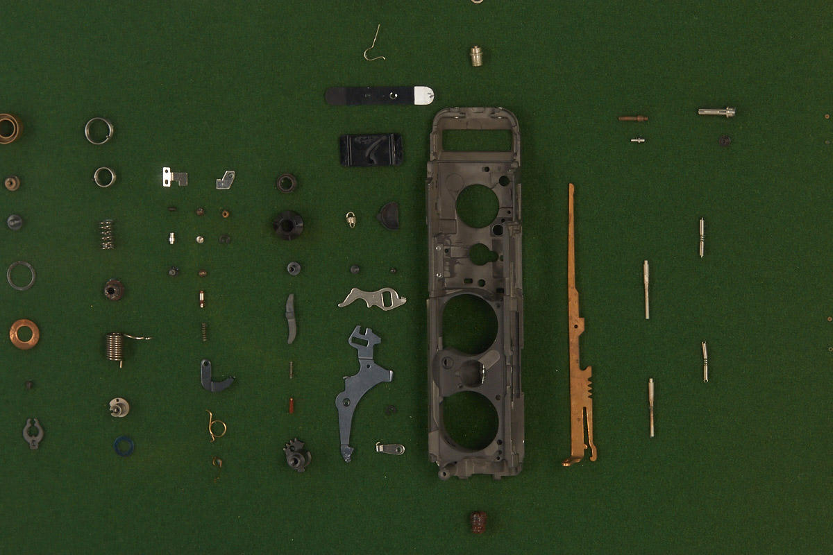 completely disassembled Minox LX, the parts mounted in order on a felt covered board in a framed and glazed display case