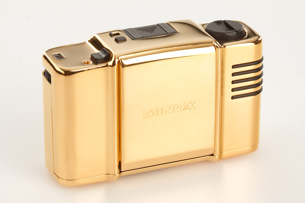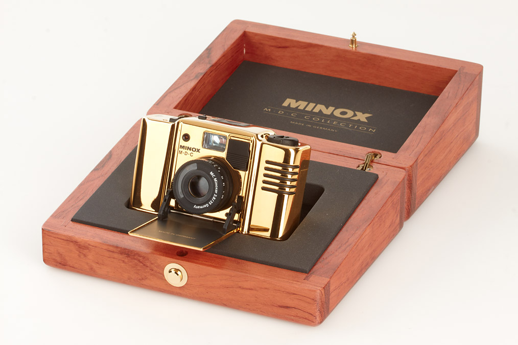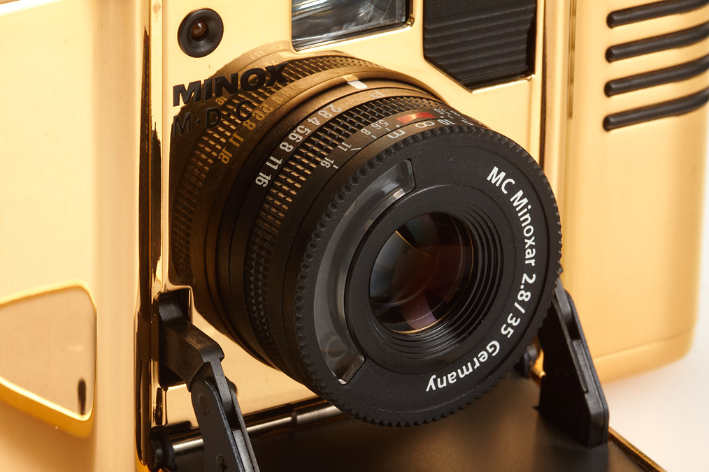 edition of 555 gold-plated cameras, MC Minoxar 2.8/35mm, wooden presentation box, papers, maker's box