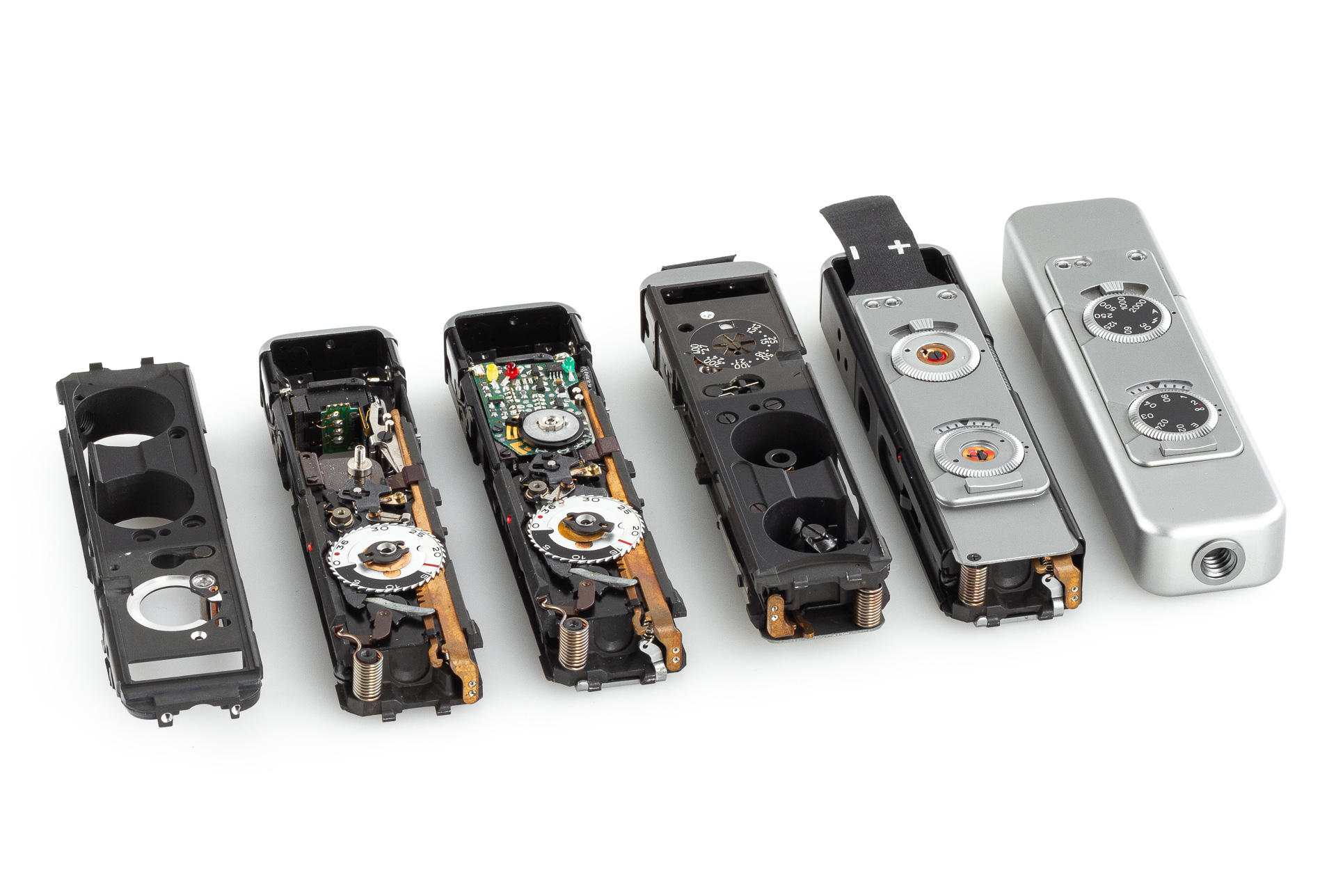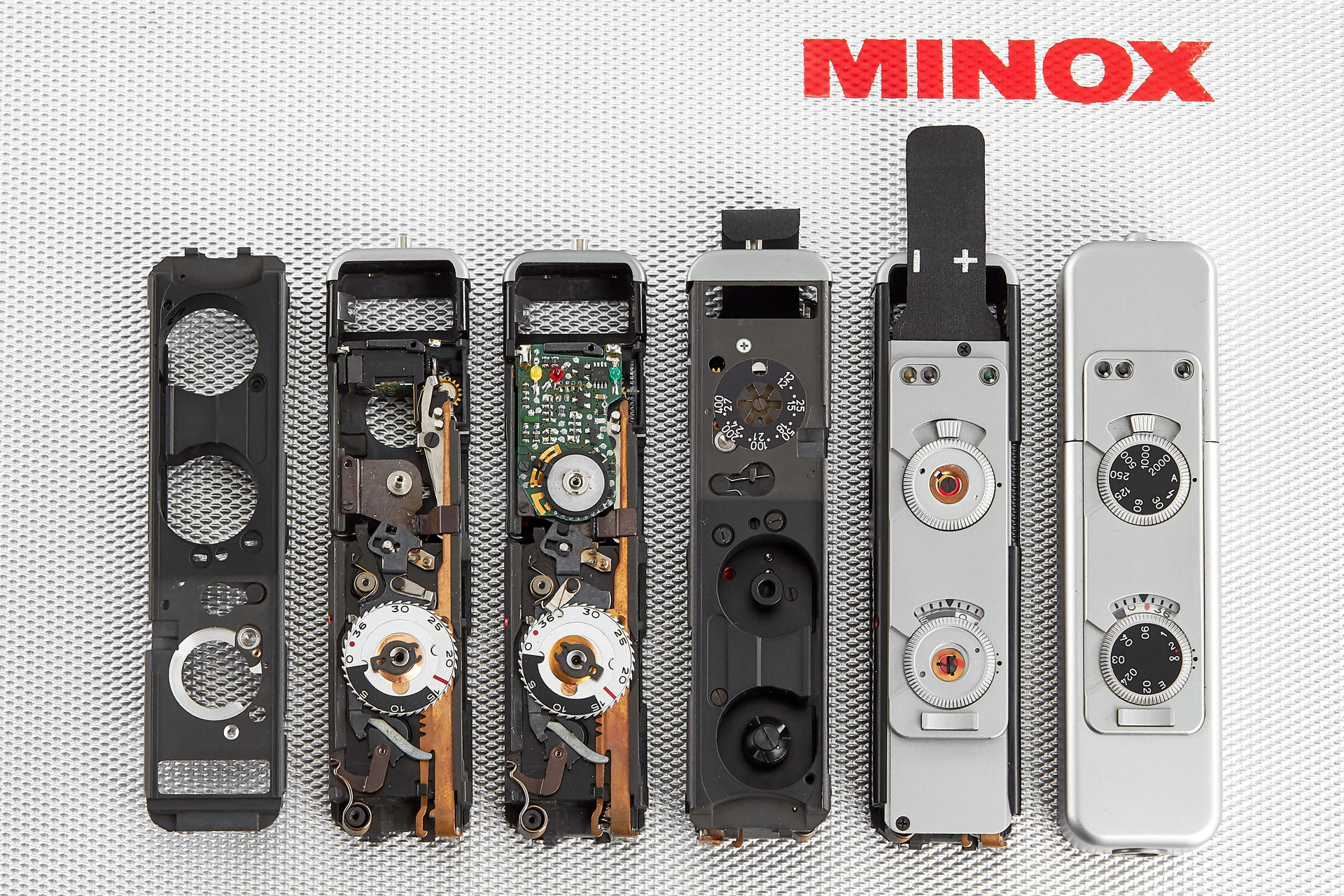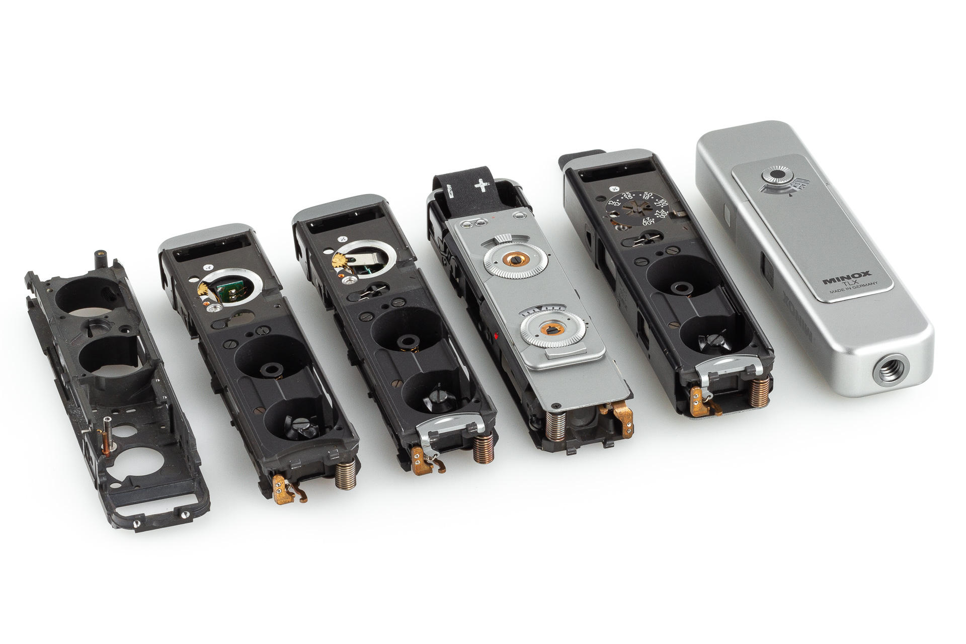 very rare, original Minox display case, showing a Minox TLX in various stages of production, excellent condition