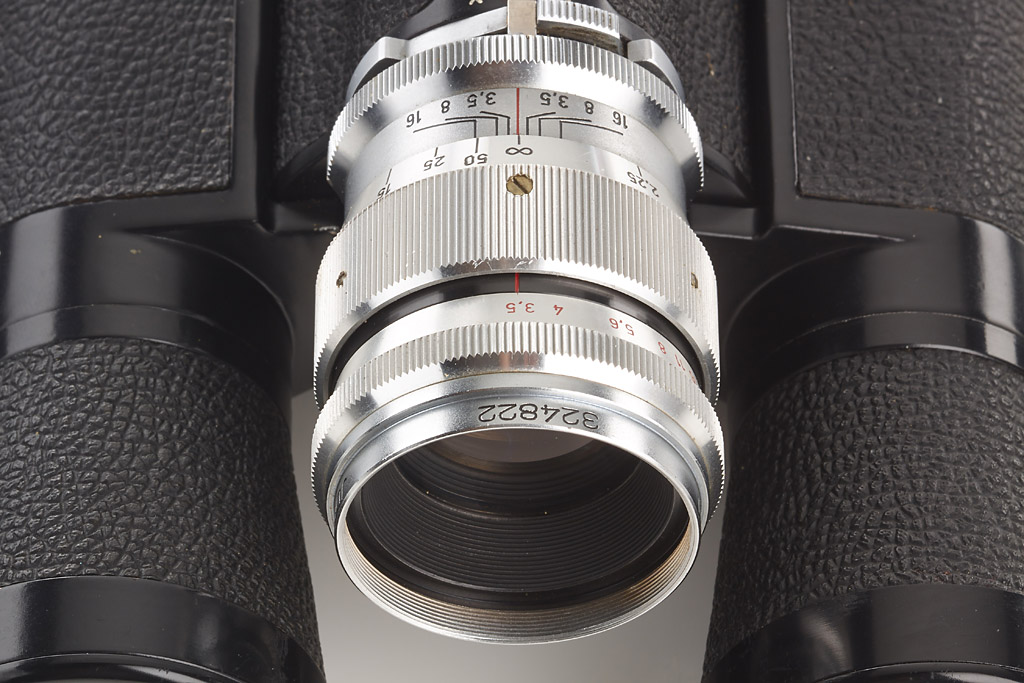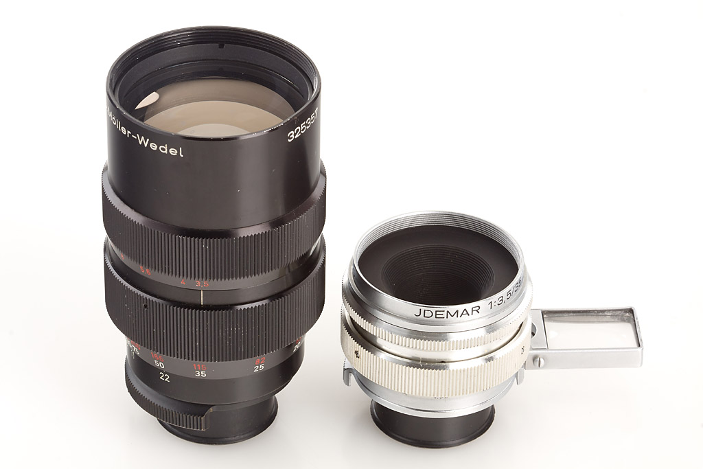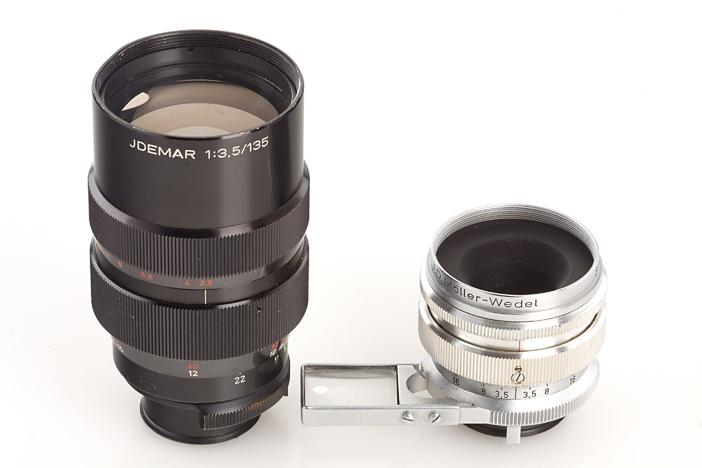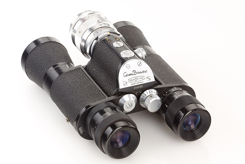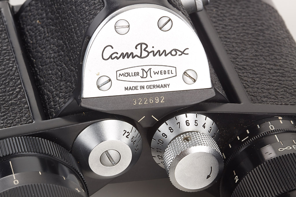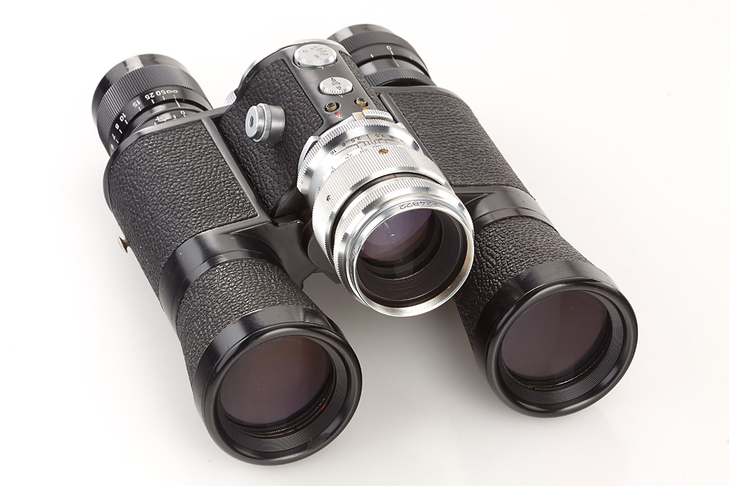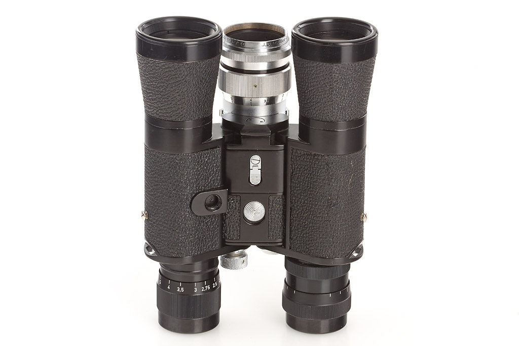 binocular camera for 10x14mm exposures on 16mm film in excellent condition, with Jdemar 3.5/90mm no.324822, case, Jdemar 3.5/35mm no.325110 (caps), Jdemar 3.5/135mm no.325357 (small dent, cap), case, these cameras were used by BND (German Secret Service)
