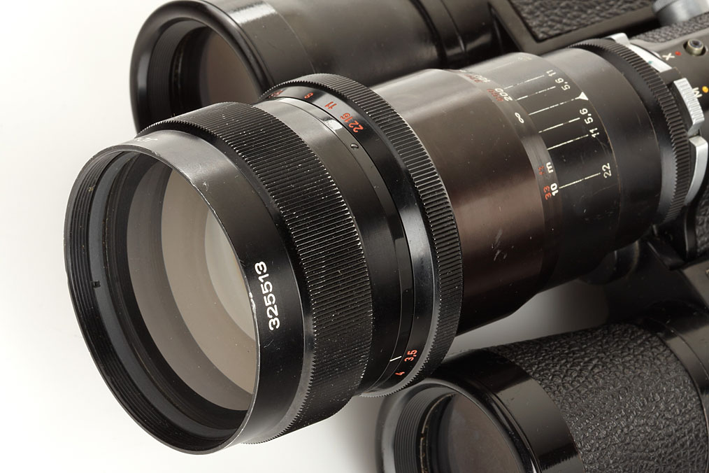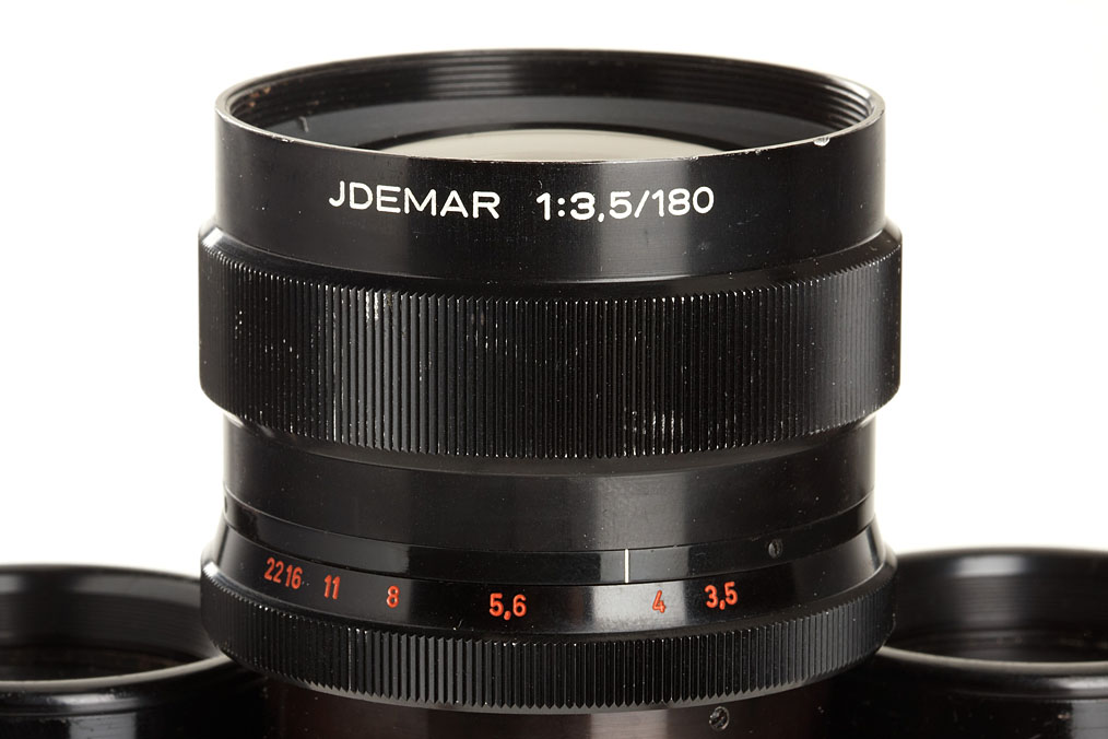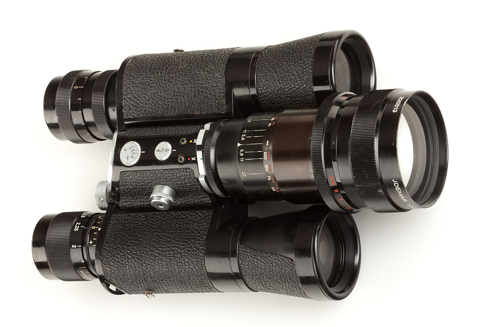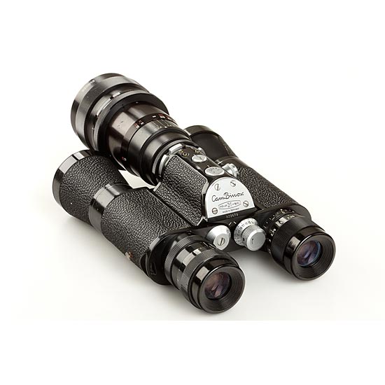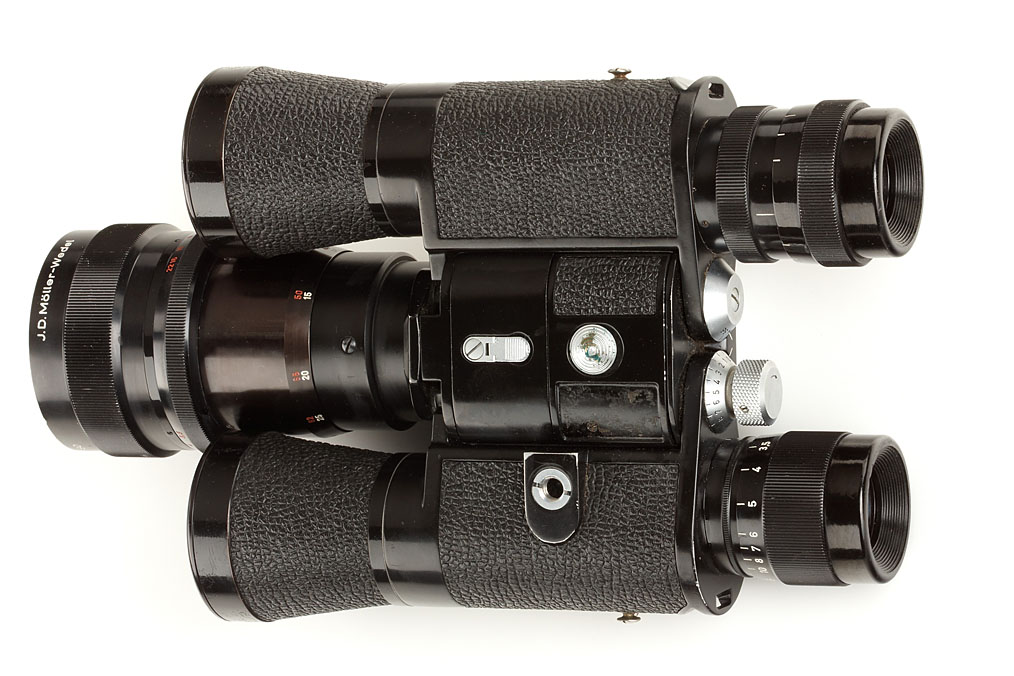 binocular camera for 10x14mm exposures on 16mm film in excellent condition, very rare black Jdemar 3.5/180mm no.325513, original strap, these cameras were used by BND (German Secret Service)