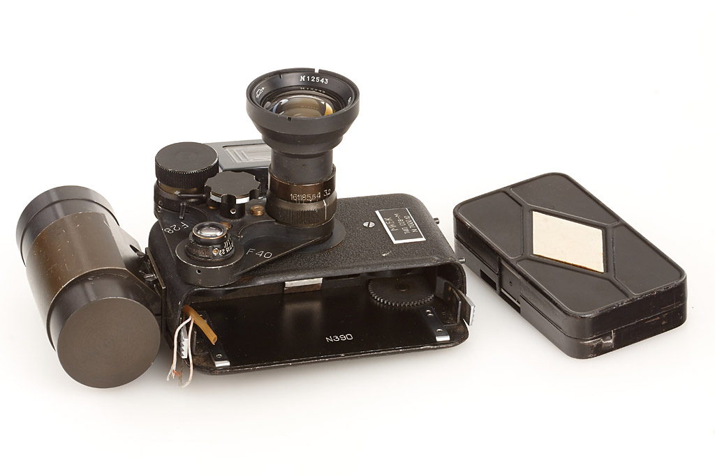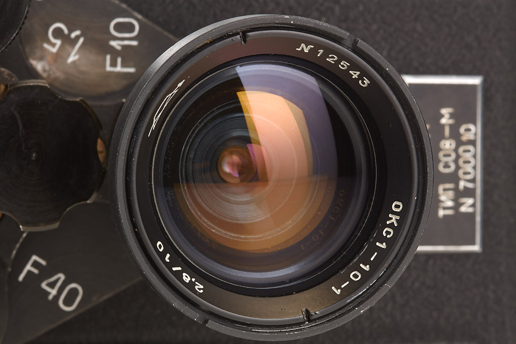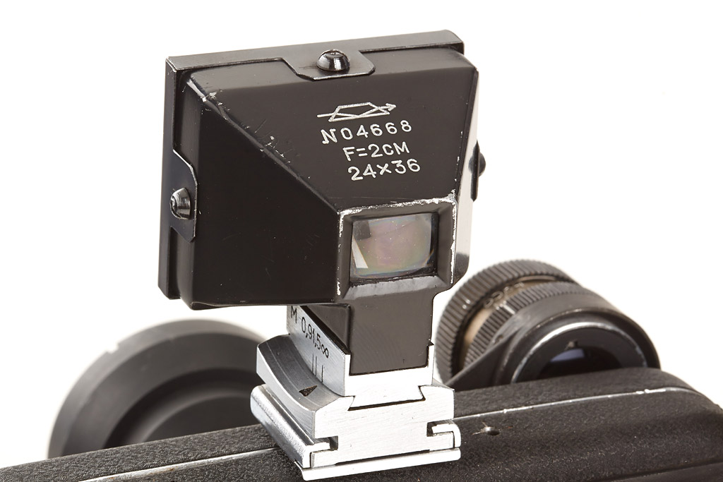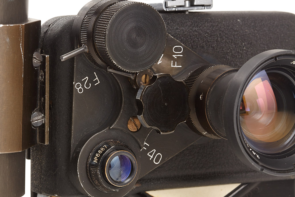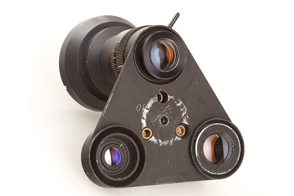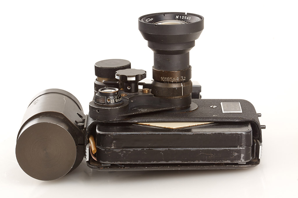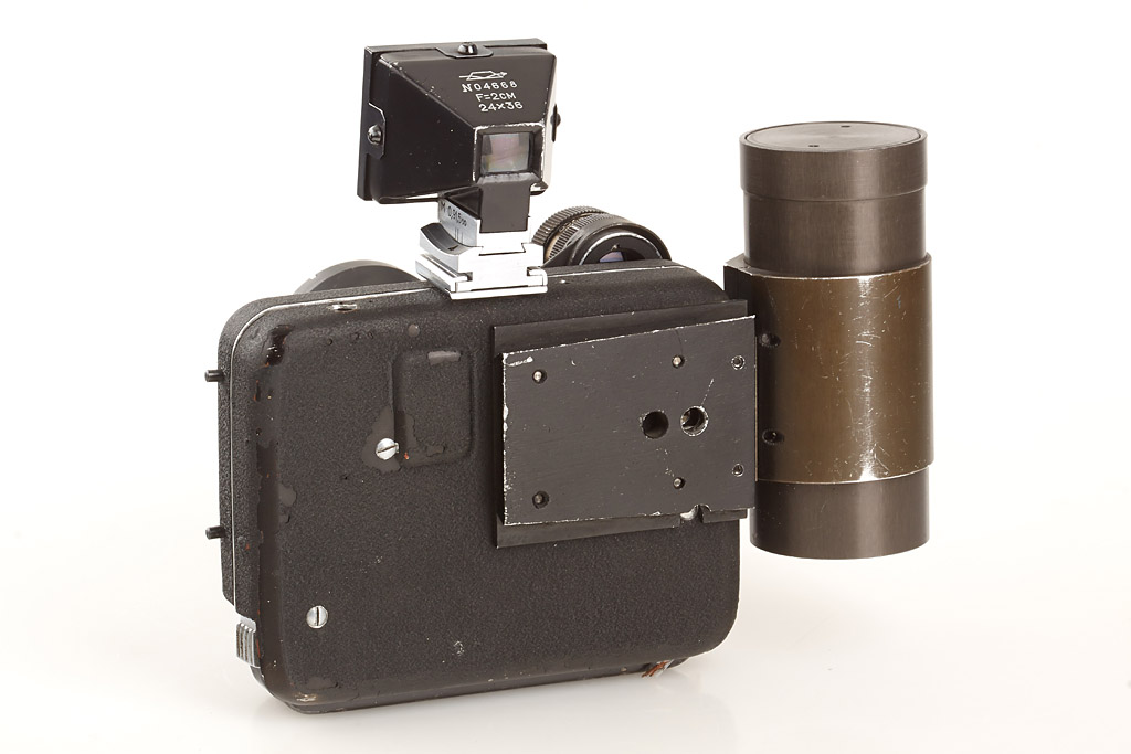 according to the previous owner this especially modified OCA with triple lens turret with 3 lenses (10mm,28mm and 40mm), modified 2cm Russar finder and side mounted grip (probably for a battery) was developed and produced by the Russian space program, it was the movie equivalent of the F-21, the film cassette was mounted on the camera at right angles to the lens, in very fine condition