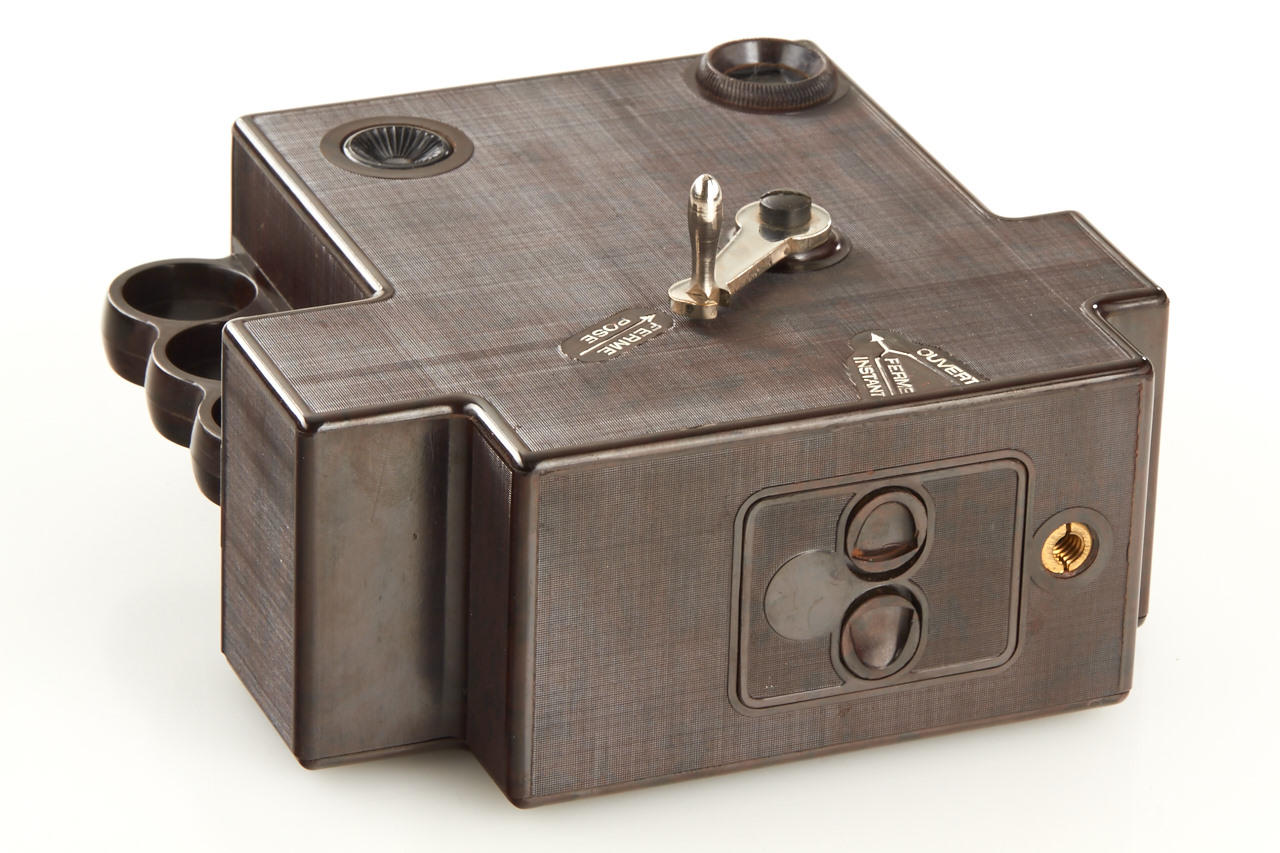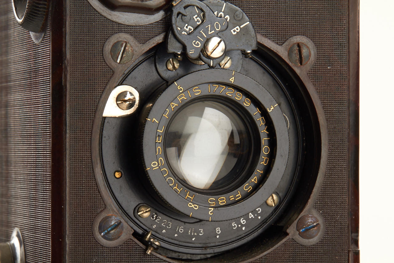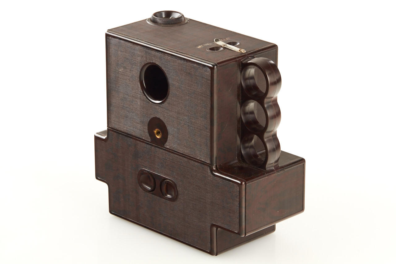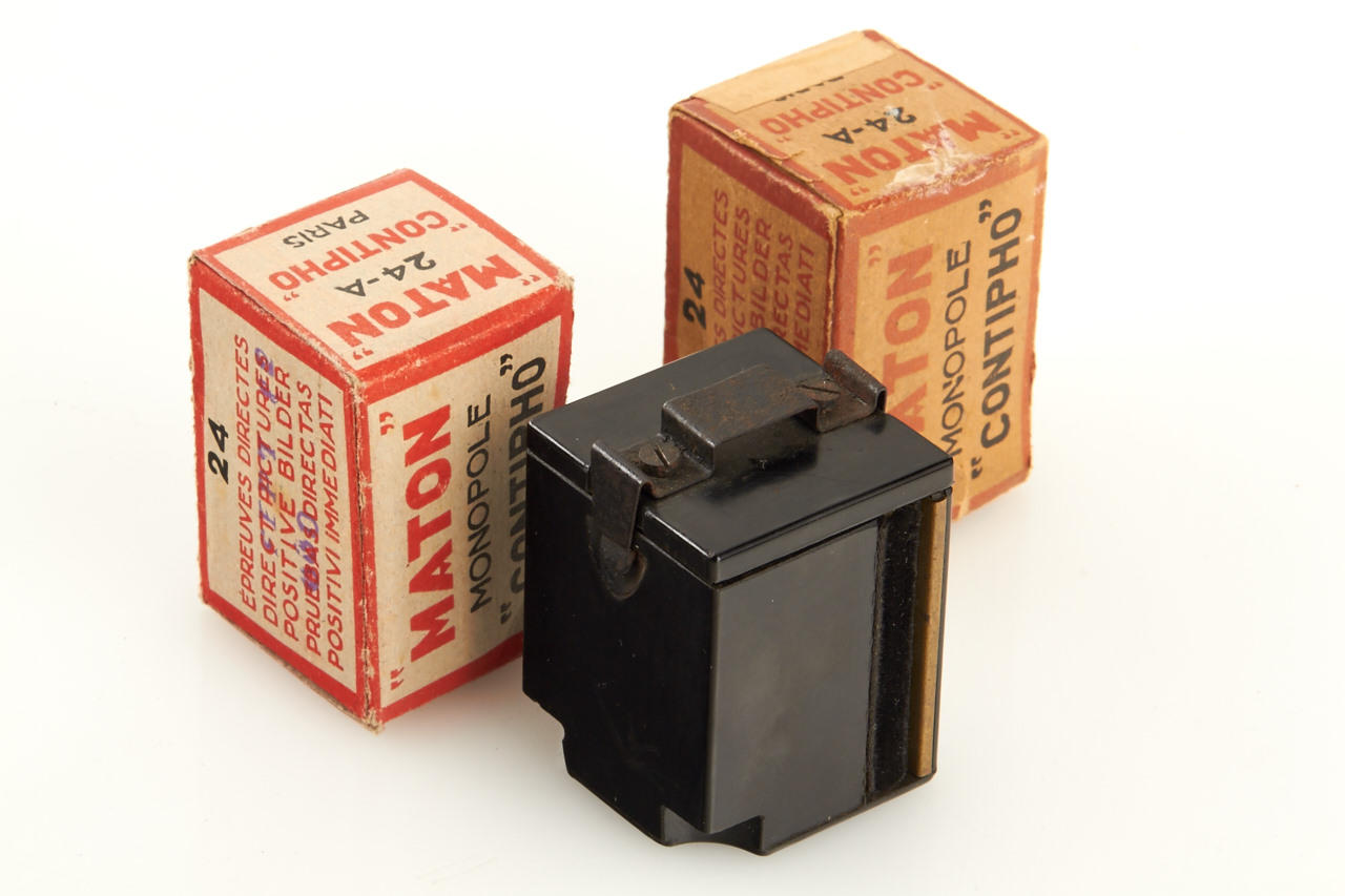 brown bakelite camera for 24x30mm exposures on paper-backed film, crank advance/shutter release, Trylor 4.5/85mm lens in Gitzo shutter, with very rare sealed Maton film, French instructions, another opened film and extra take-up spool, everything in brown outfit case and in beautiful condition