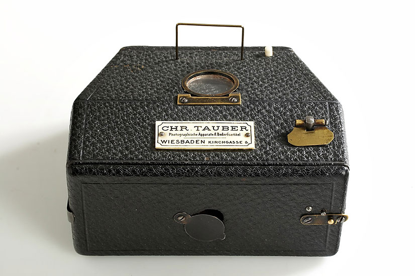 rare Jumelle-style rollfilm camera for 3x4cm, similar to Kodak Cone pocket camera, leather covered body, simple lens with rotating diaphragm, dealers plaque: Chr.Taube Wiesbaden Kirchgasse 6