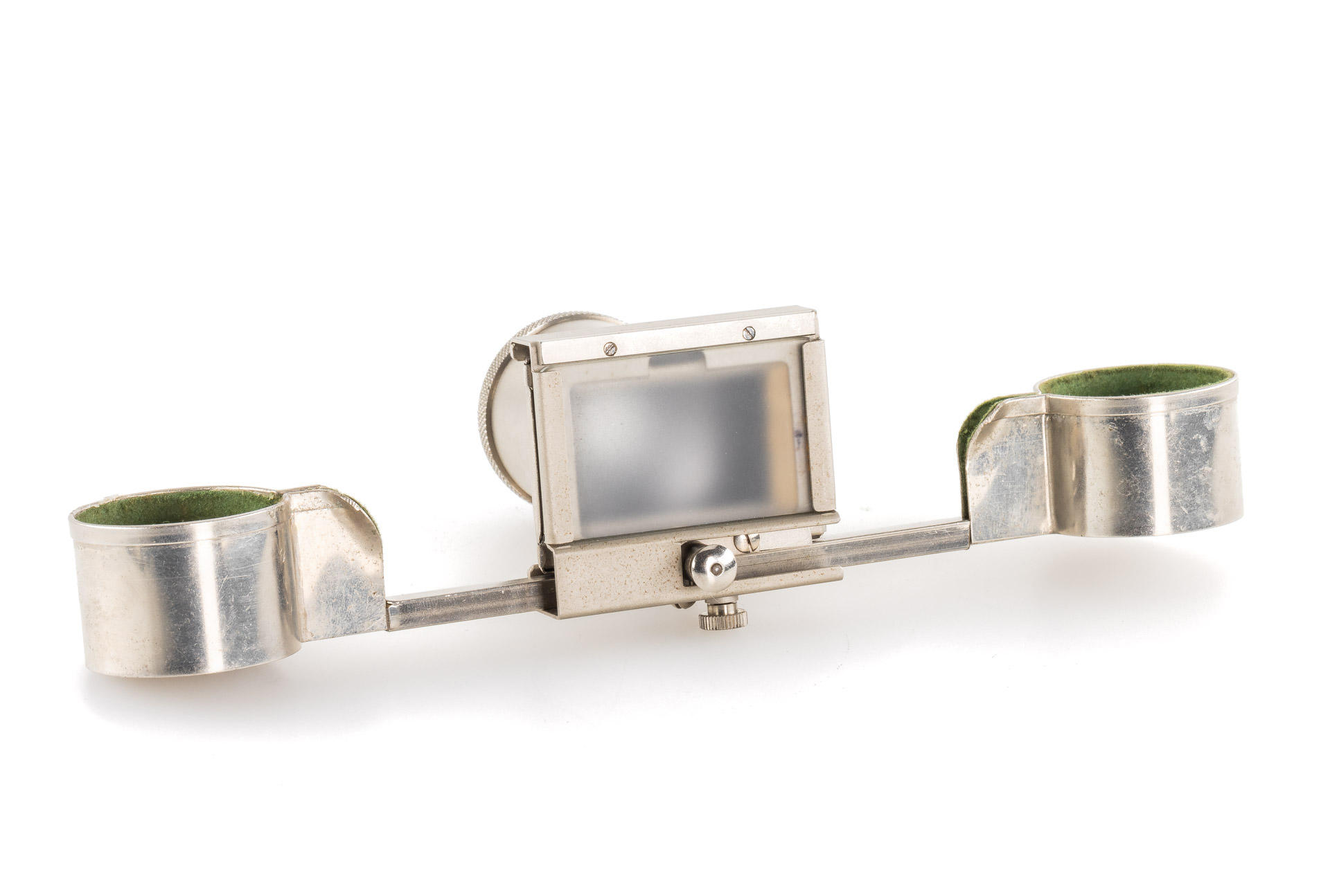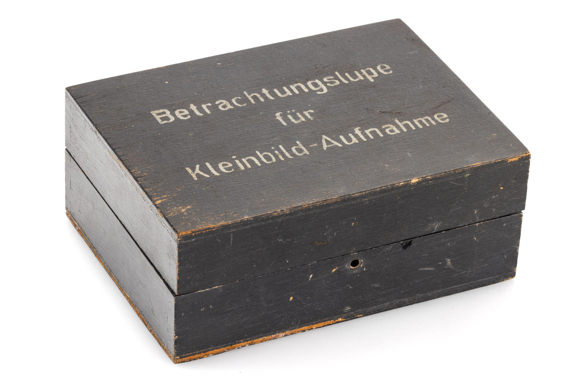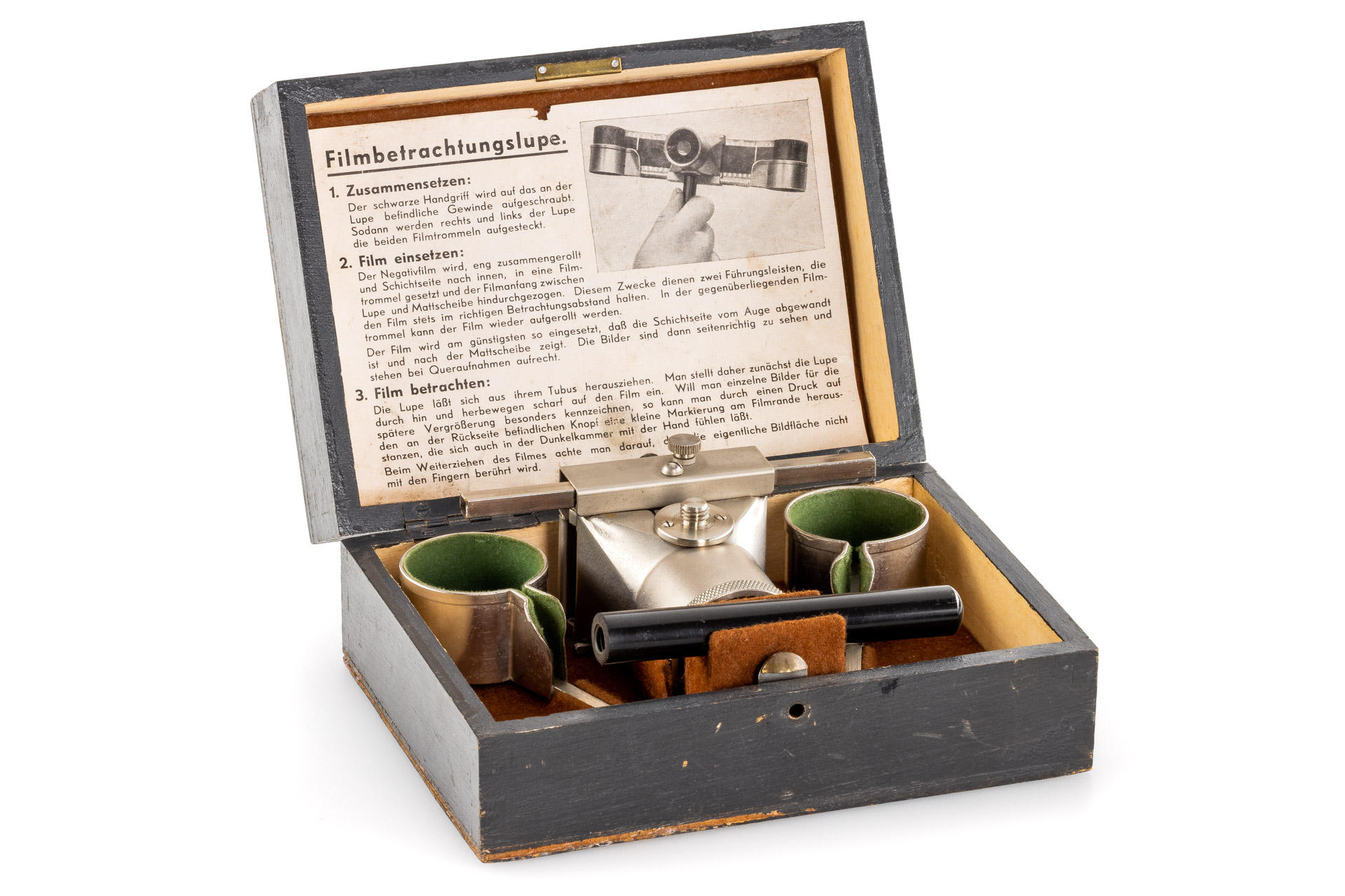 very rare film viewing magnifier for 250 exposures in near mint condition, complete with bakelite handle, film holders, grey painted original wooden maker's box with 'Betrachtungslupe für Kleinbild-Aufnahmen' painted white, with German short instructions
