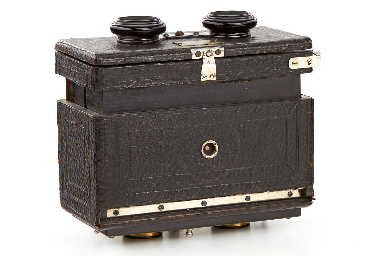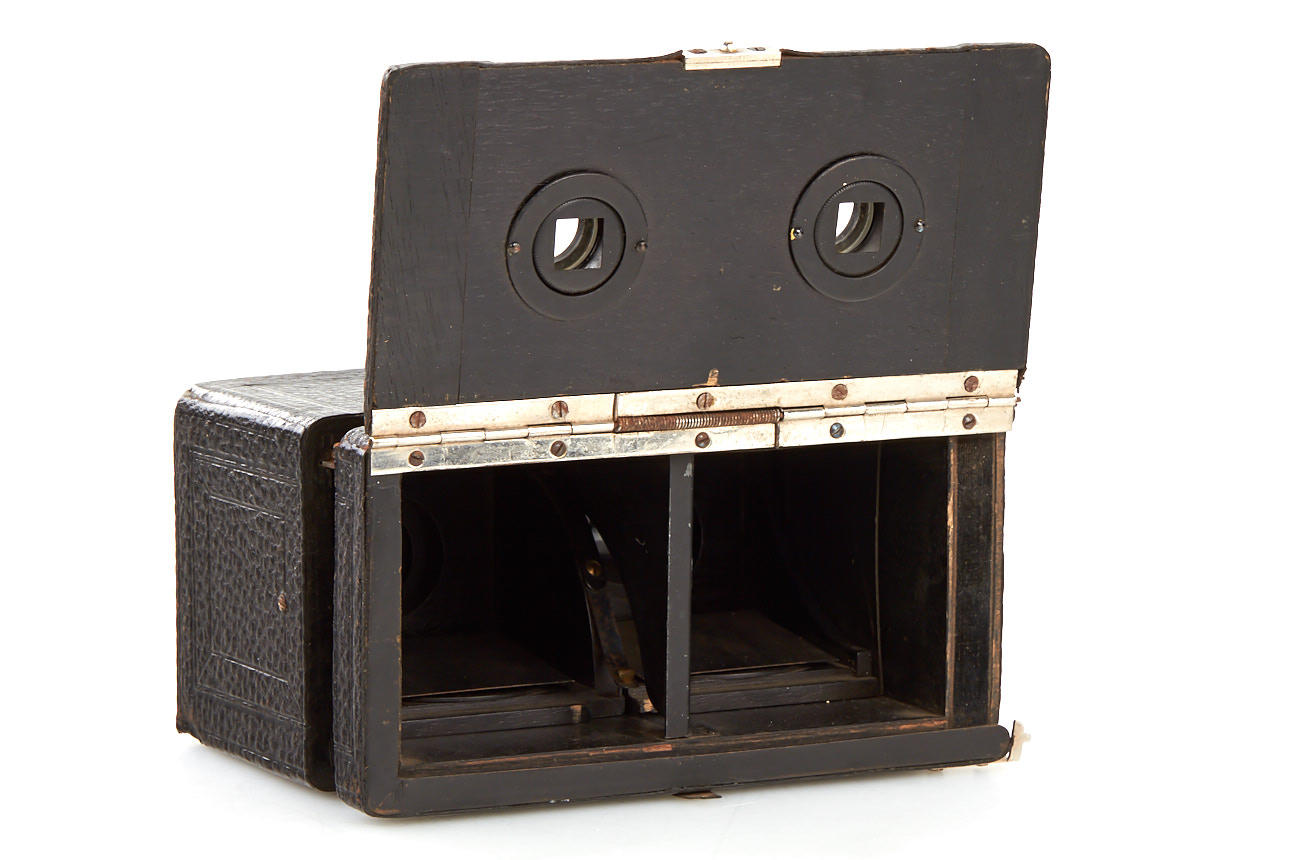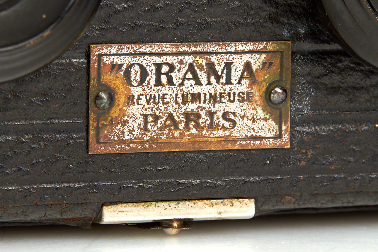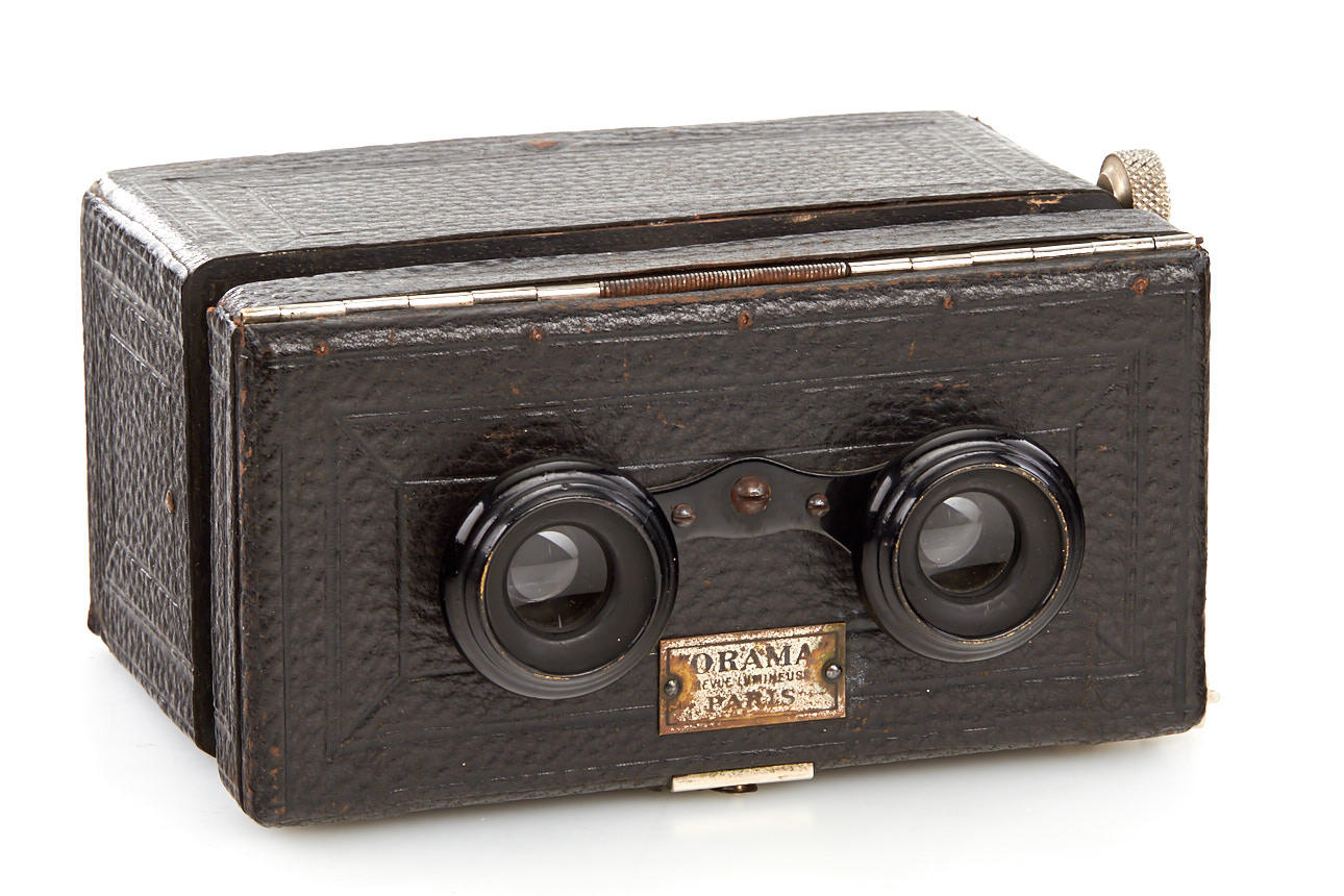 very rare camera for 6x13cm exposure on plates with a pair of Anastigmat Demaria Frères 6.8/90mm brass lenses nos.11224/425, good working focal plane shutter, the camera can also be used as stereo viewer AND binoculars, 'ORAMA' Revue Lumineuse Paris marked on metal plate, case
