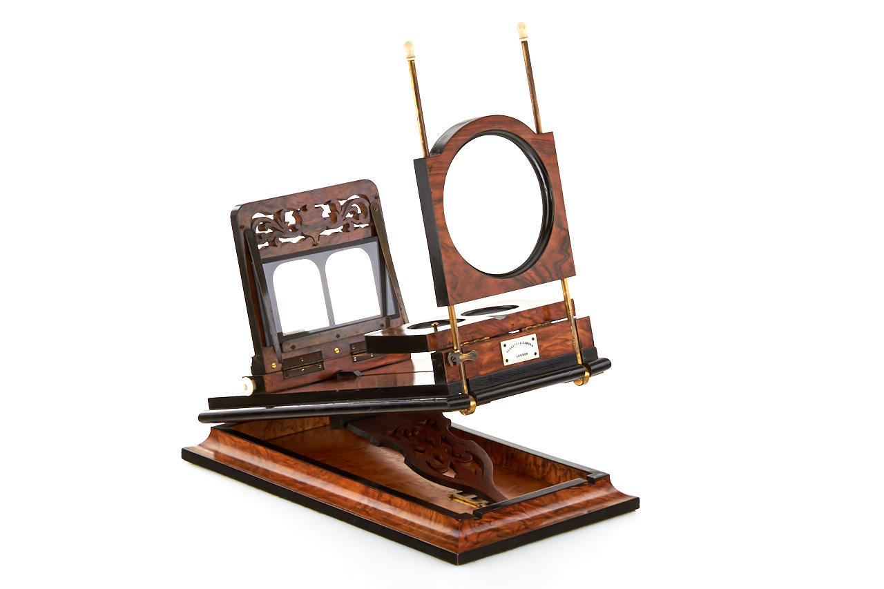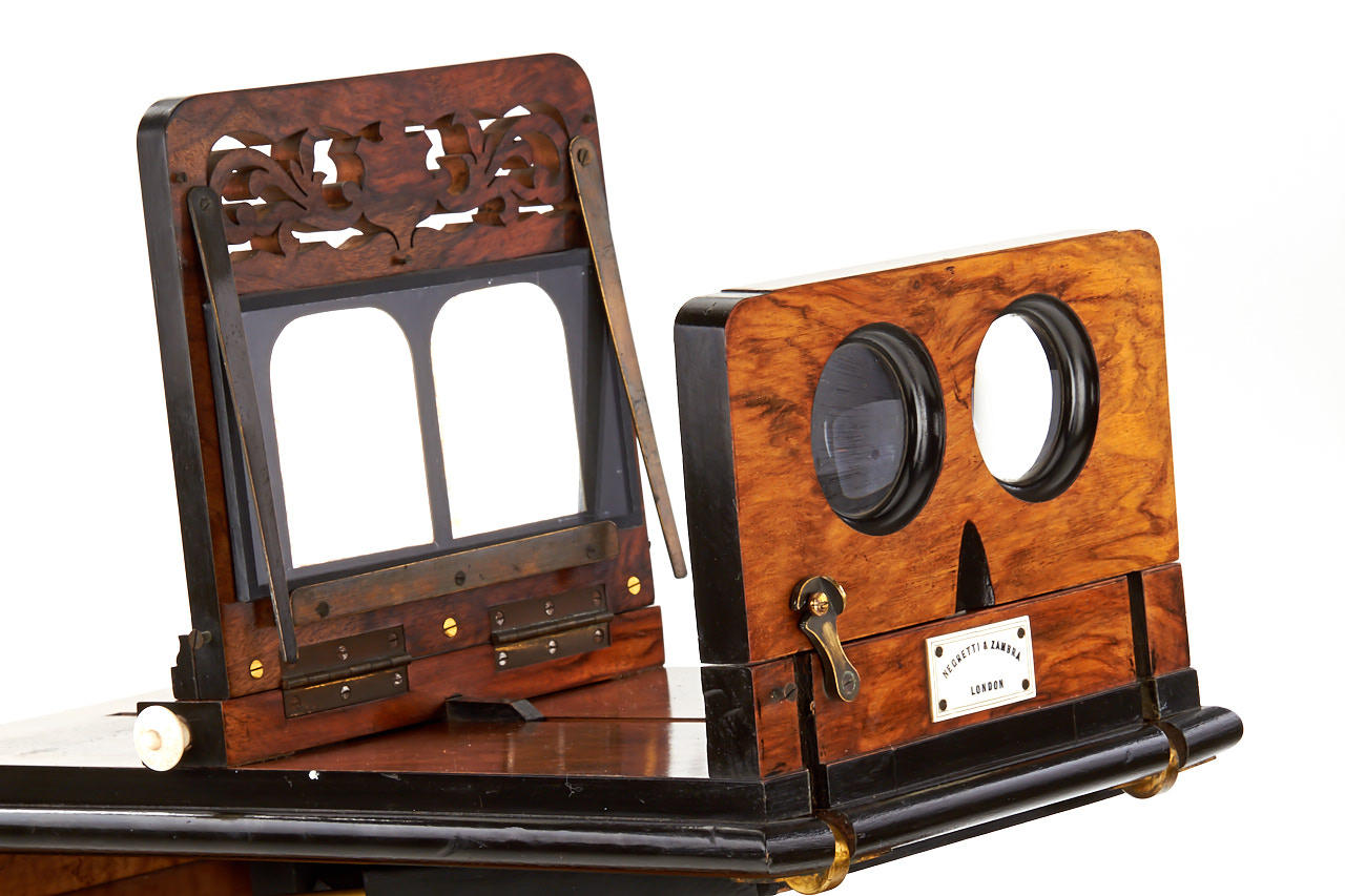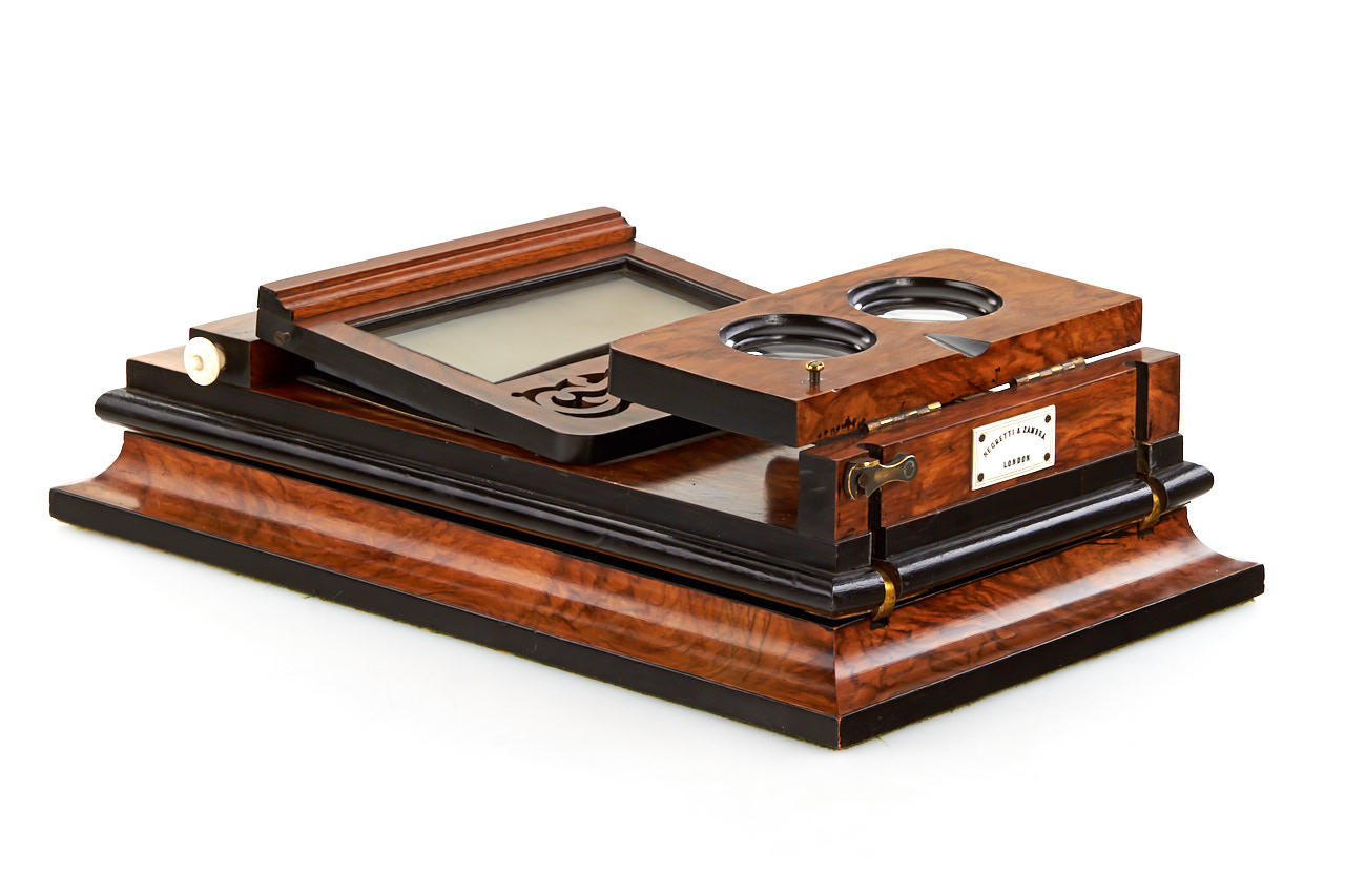 highly decorative, beautiful stereoscope / Graphoscope combination for 8x16cm glass plates or prints, in excellent condition with no missing parts, ivory maker's plaque on front: 'Negretti & Zambra, London', the device is equipped with swing-out Graphoscope loupe, hidden in base, very interesting and in beautiful condition