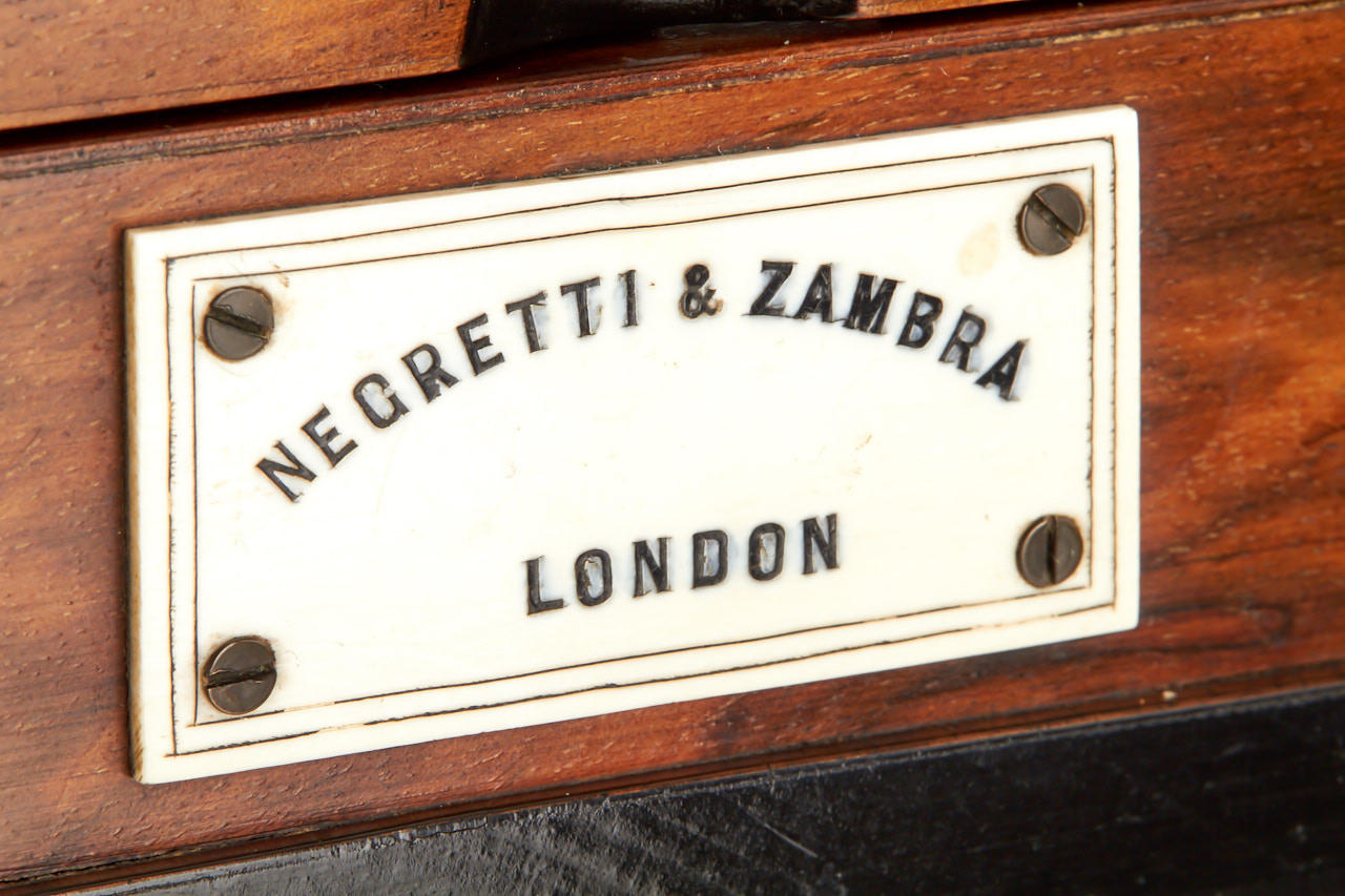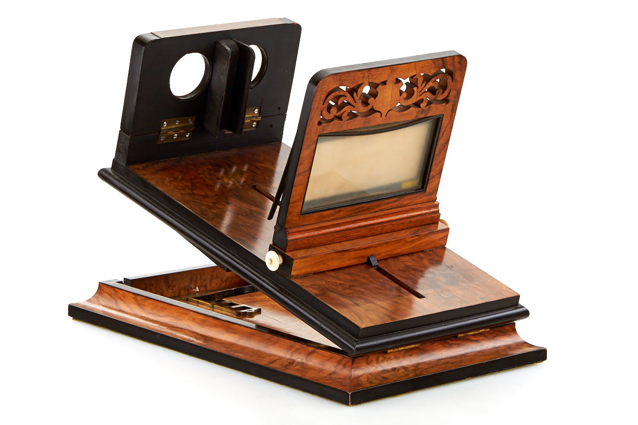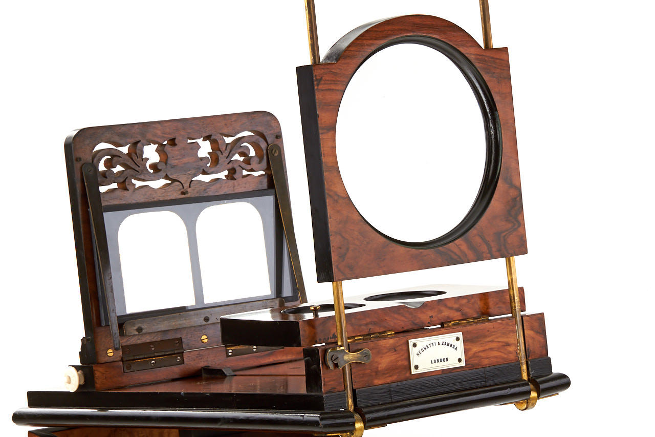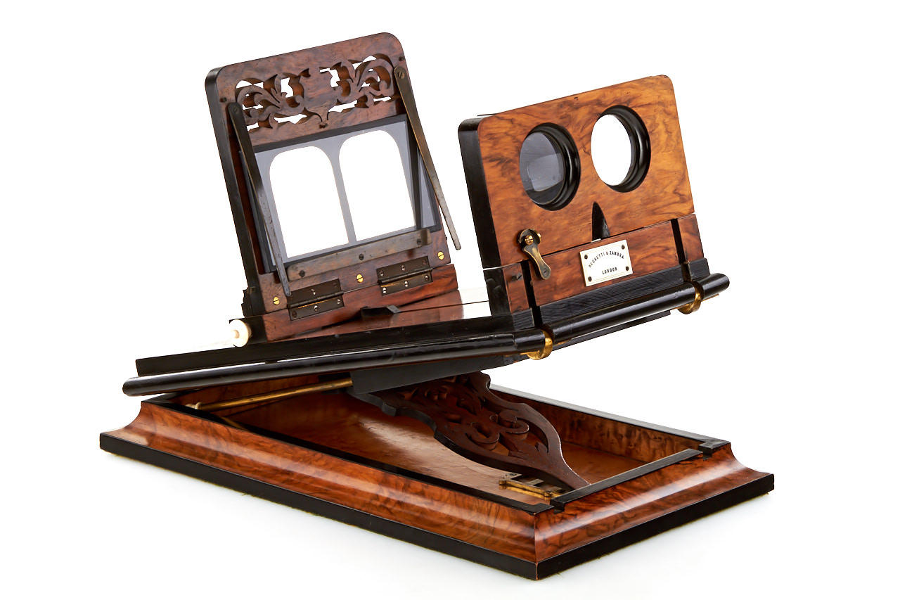 highly decorative, beautiful stereoscope / Graphoscope combination for 8x16cm glass plates or prints, in excellent condition with no missing parts, ivory maker's plaque on front: 'Negretti & Zambra, London', the device is equipped with swing-out Graphoscope loupe, hidden in base, very interesting and in beautiful condition