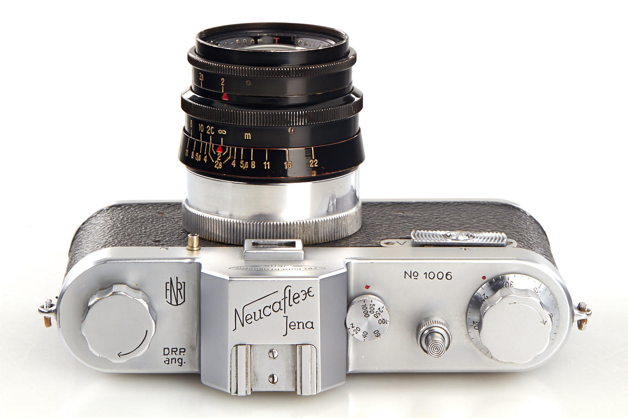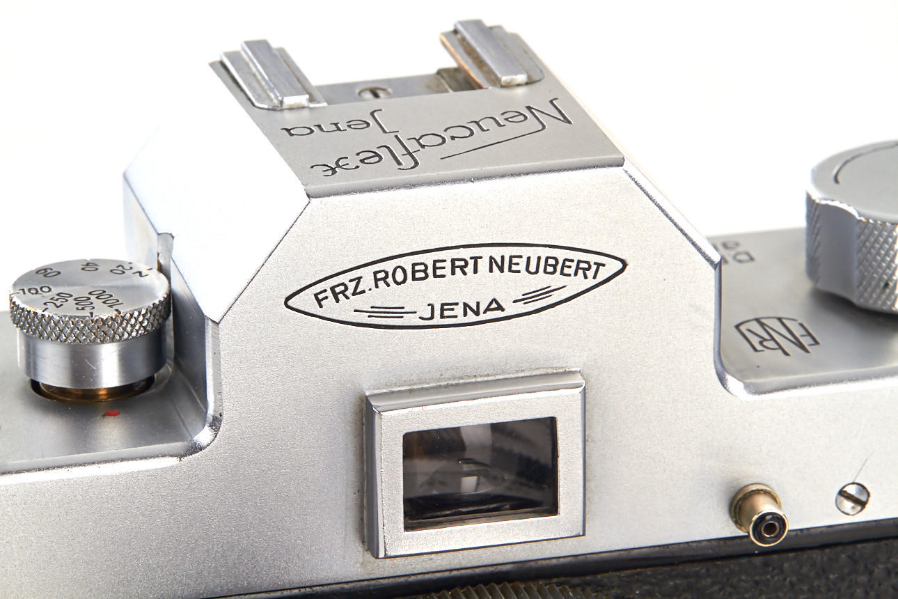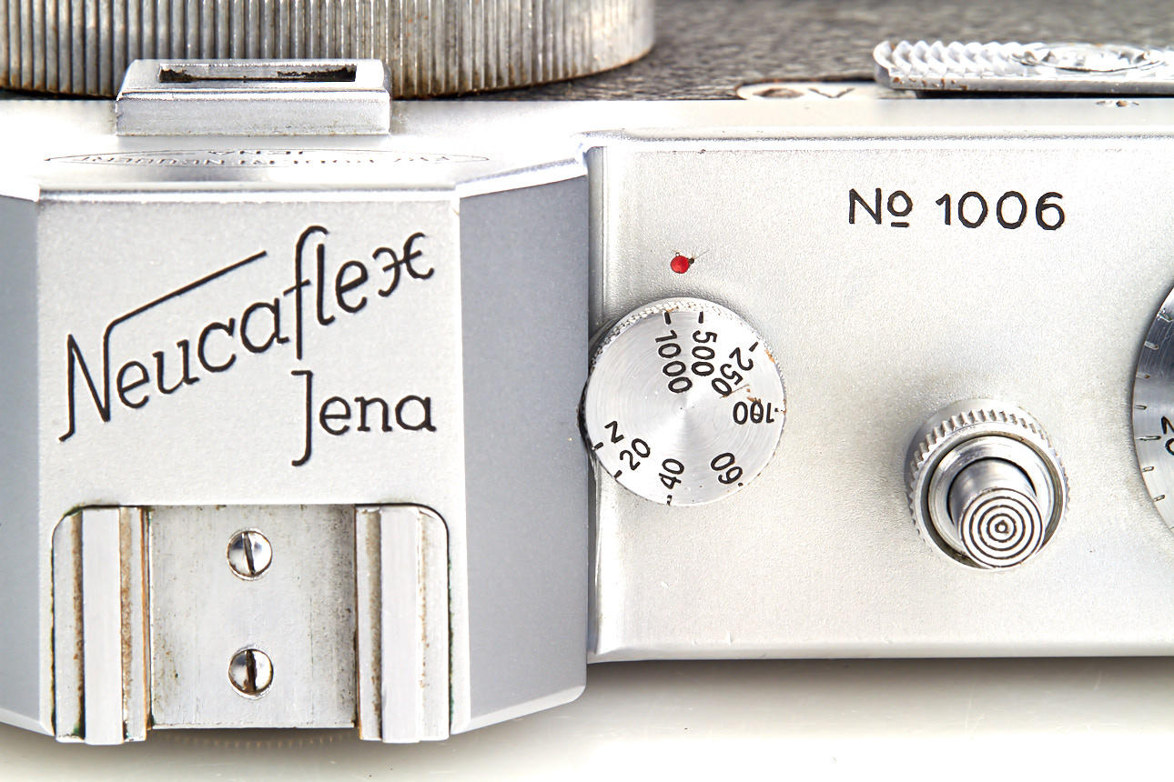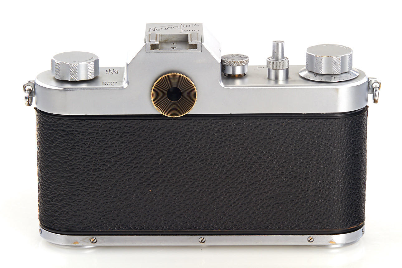 35mm SLR camera with 'periscopic' view finding, similar to the Periflex (and predating it). The camera was designed and made by Franz Robert Neubert in Jena from 1950, based on his earlier Leica copy, the Neuca. Made in very small numbers, only about 3-4 Neucaflex cameras are known to exist. It has a mirror and pentaprism, arranged to give a magnified view of the center of the frame in the viewfinder for focusing. When the shutter release is pressed slightly, both the mirror and pentaprism swing out of the optical path, and the eyepiece now forms part of a reverse-Galilean finder for framing before exposure. The camera uses Leica-mount SM lenses, and its controls (shutter speed selector, film advance and rewind knobs) are similar to those of a Leica. It has shutter speeds 1/20 - 1/1000 second, plus 'Z'. After only a few months, production of a new version of the camera, the Ucaflex began, by UCA in Flensburg. The offered camera is in very beautiful condition, engraved with 'D.R.P. ang.' and 'No. 1006' on the top plate, it comes with a black Zeiss Biotar 2/5.8cm T no.3108606 and the original leather case, important camera from the early German post-war camera history !