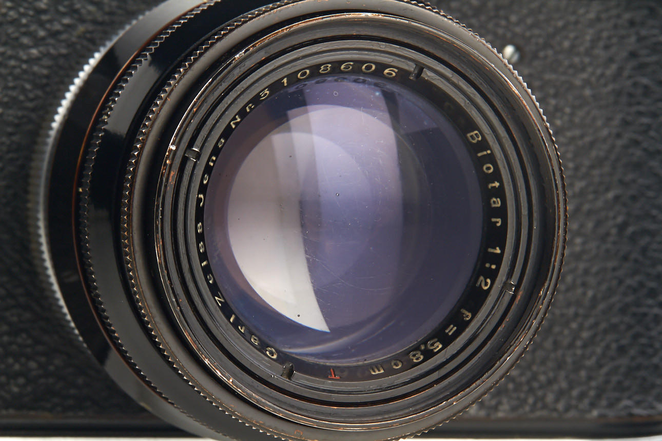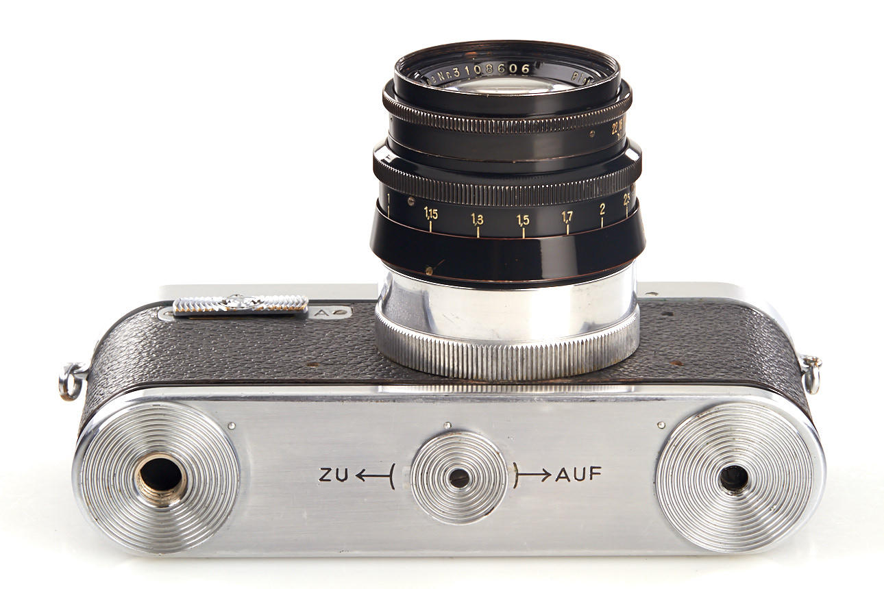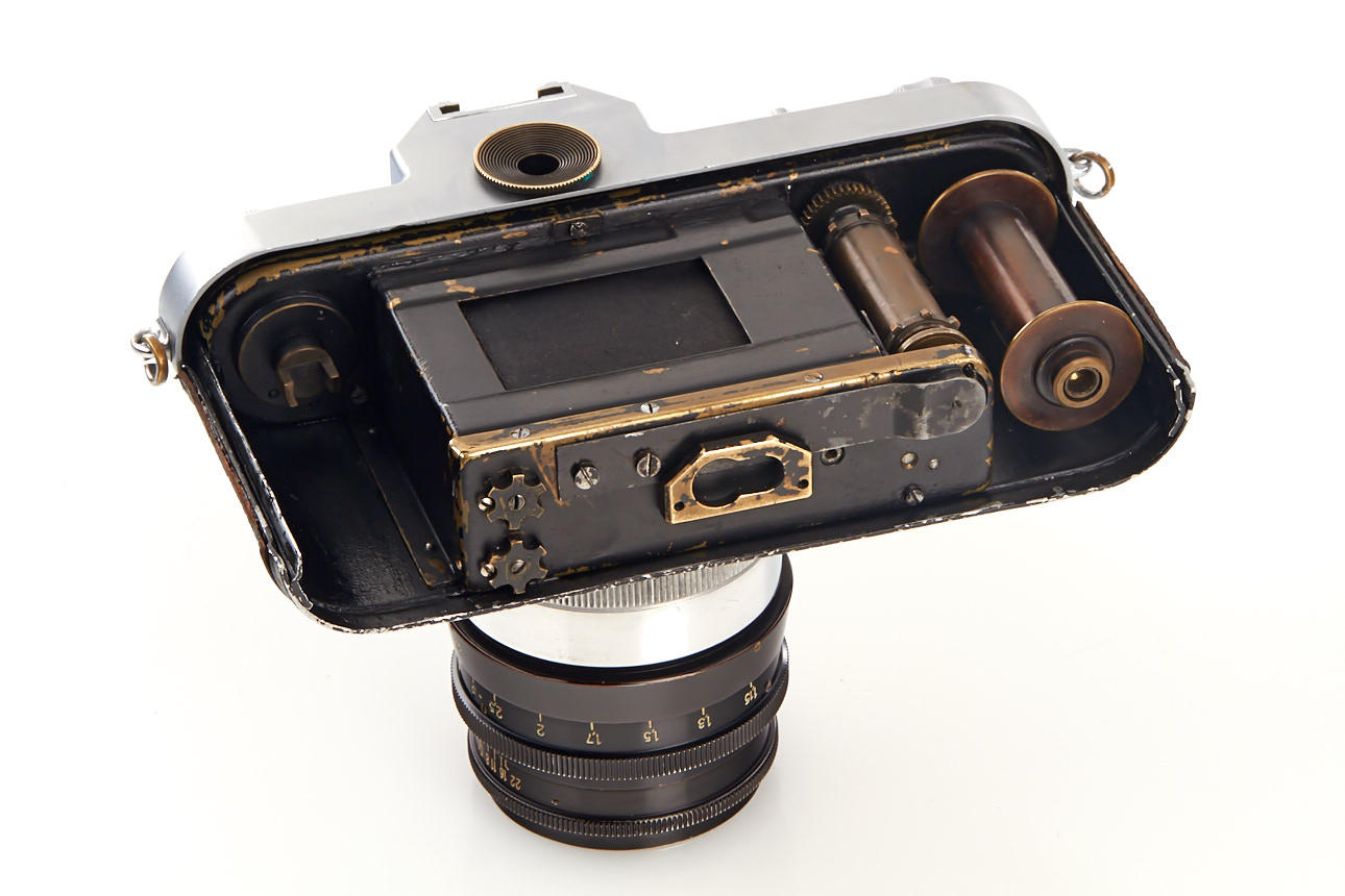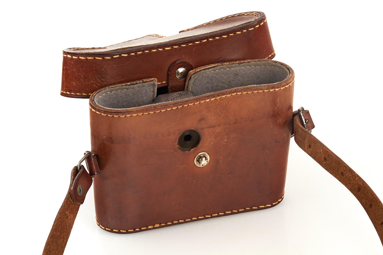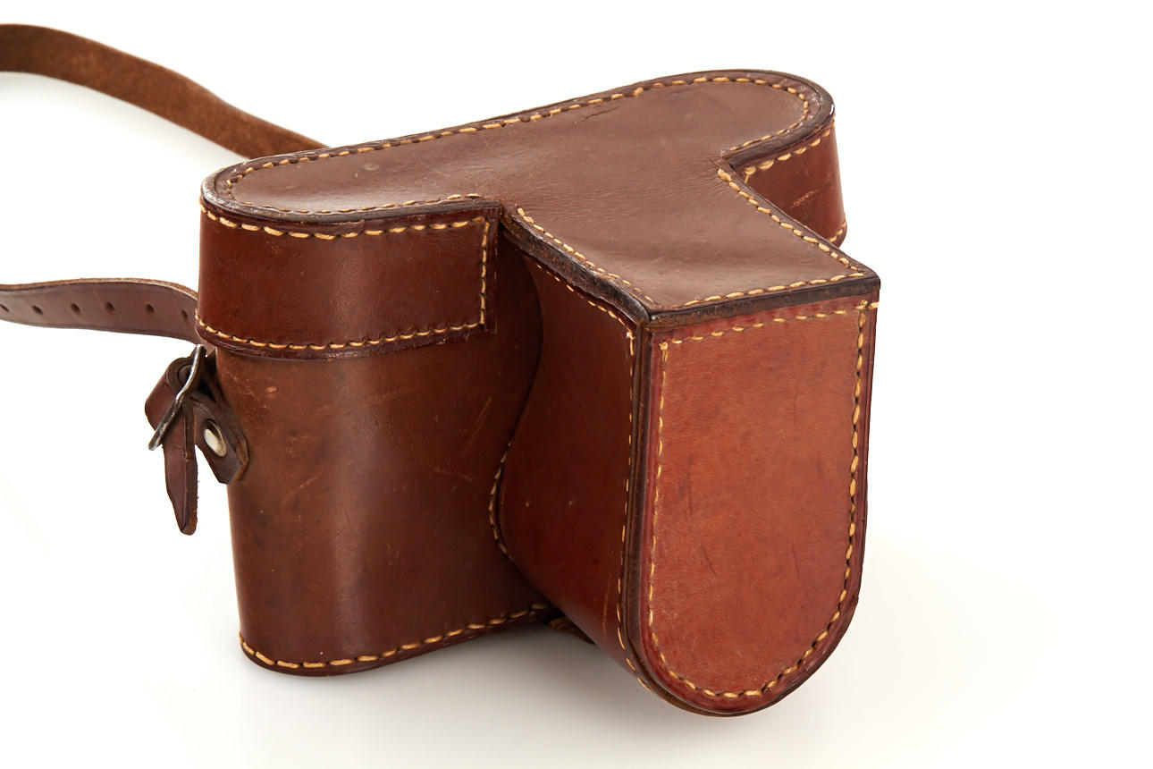 35mm SLR camera with 'periscopic' view finding, similar to the Periflex (and predating it). The camera was designed and made by Franz Robert Neubert in Jena from 1950, based on his earlier Leica copy, the Neuca. Made in very small numbers, only about 3-4 Neucaflex cameras are known to exist. It has a mirror and pentaprism, arranged to give a magnified view of the center of the frame in the viewfinder for focusing. When the shutter release is pressed slightly, both the mirror and pentaprism swing out of the optical path, and the eyepiece now forms part of a reverse-Galilean finder for framing before exposure. The camera uses Leica-mount SM lenses, and its controls (shutter speed selector, film advance and rewind knobs) are similar to those of a Leica. It has shutter speeds 1/20 - 1/1000 second, plus 'Z'. After only a few months, production of a new version of the camera, the Ucaflex began, by UCA in Flensburg. The offered camera is in very beautiful condition, engraved with 'D.R.P. ang.' and 'No. 1006' on the top plate, it comes with a black Zeiss Biotar 2/5.8cm T no.3108606 and the original leather case, important camera from the early German post-war camera history !