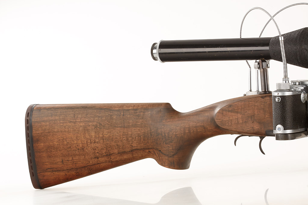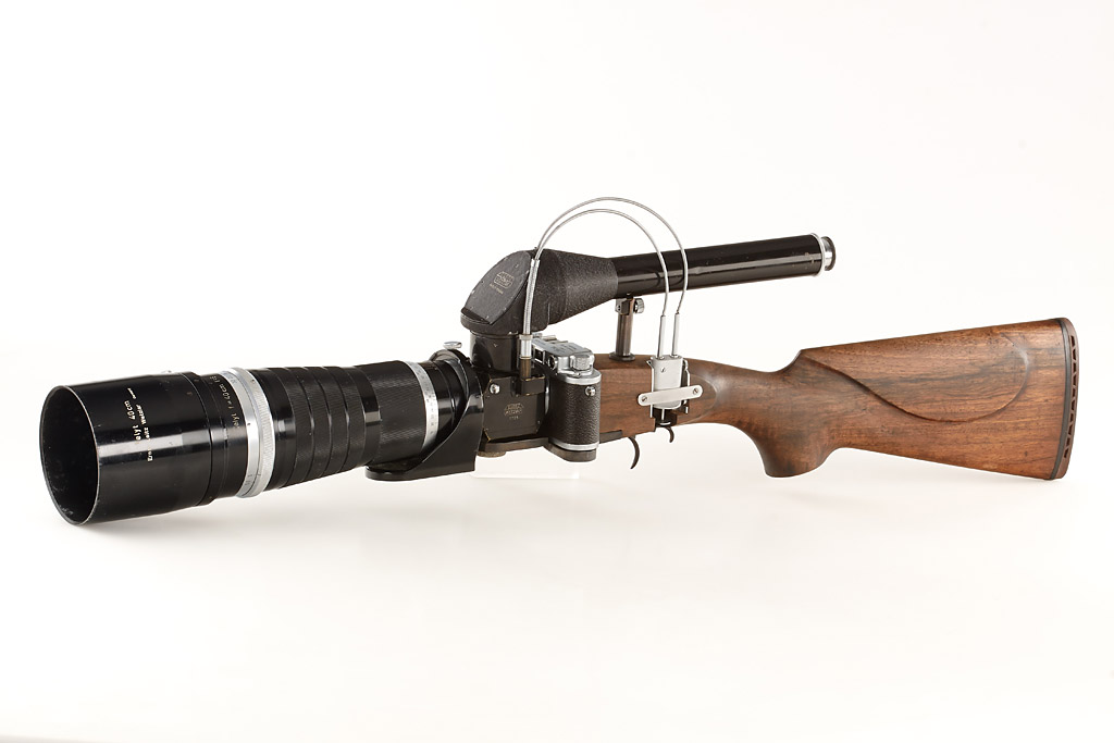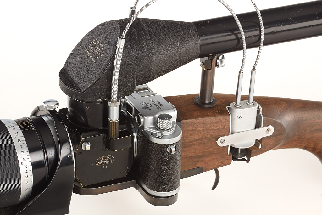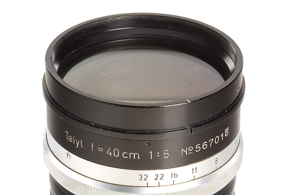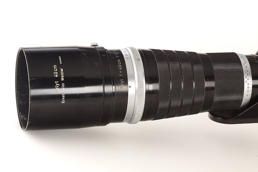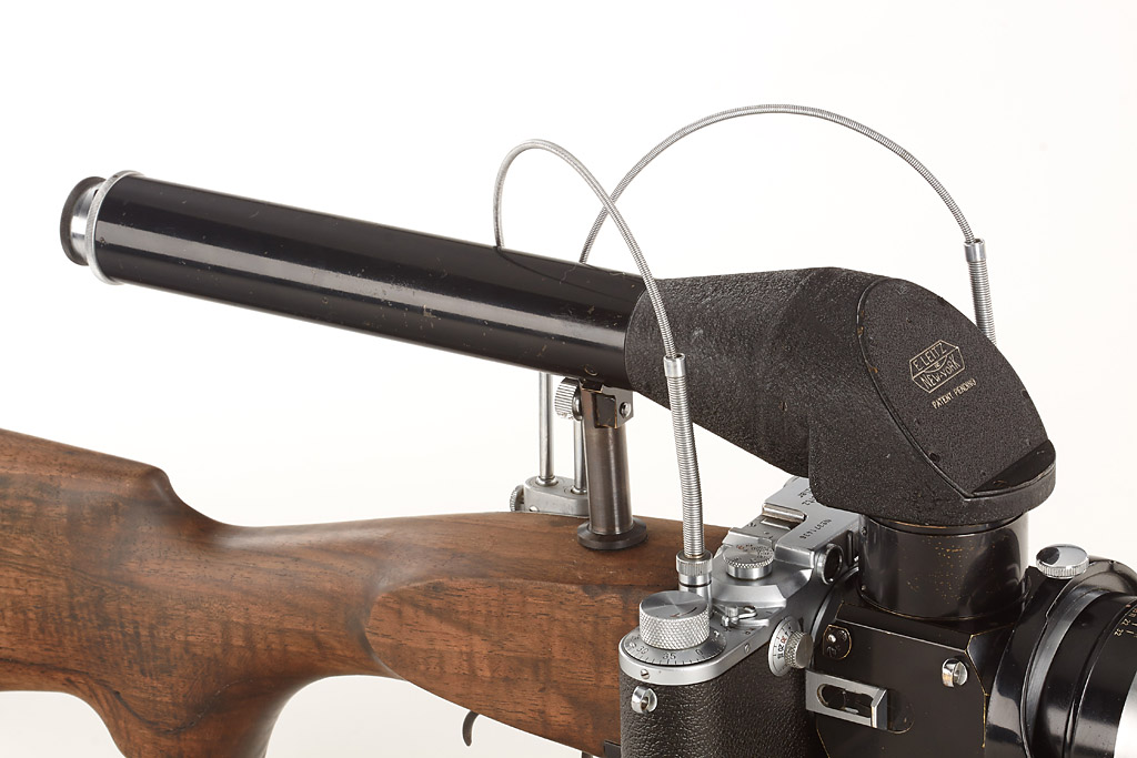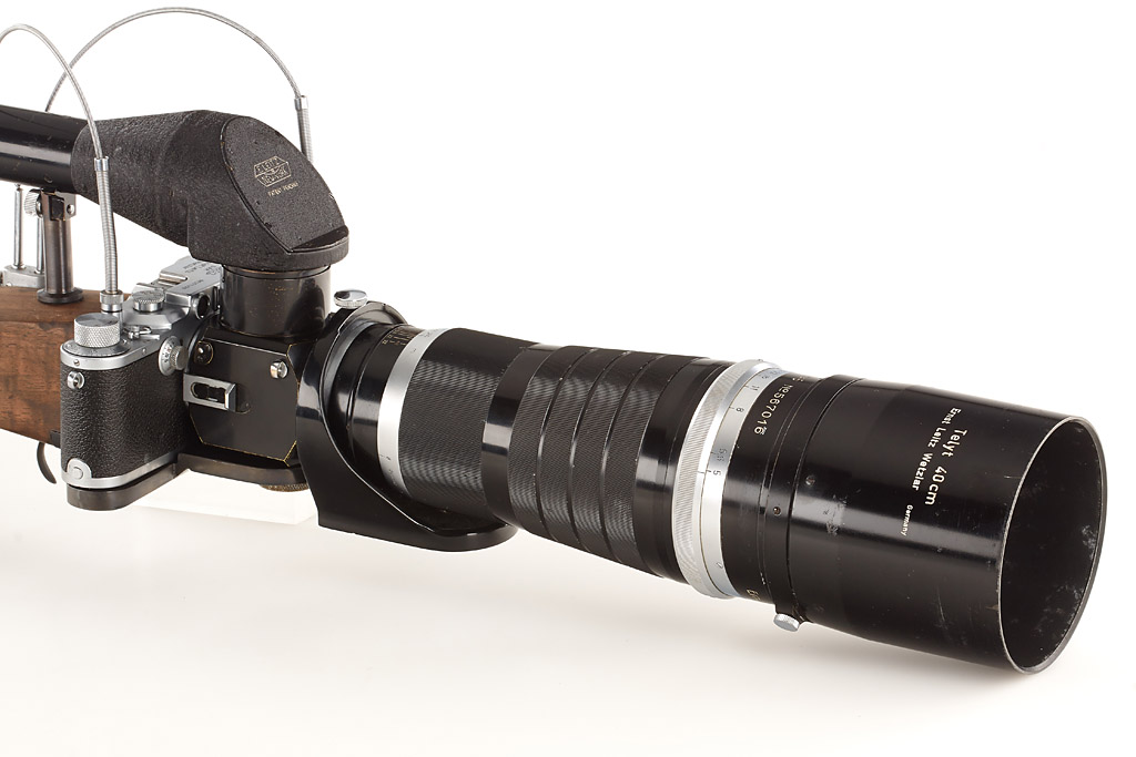 original NY prism finder with matching PLOOT reflex housing no.1721, IIIc no.371436, first version Telyt 5/40cm no.567016 (hood, cap), gun stock and camera adapter plate are well-made copies to complete the outfit