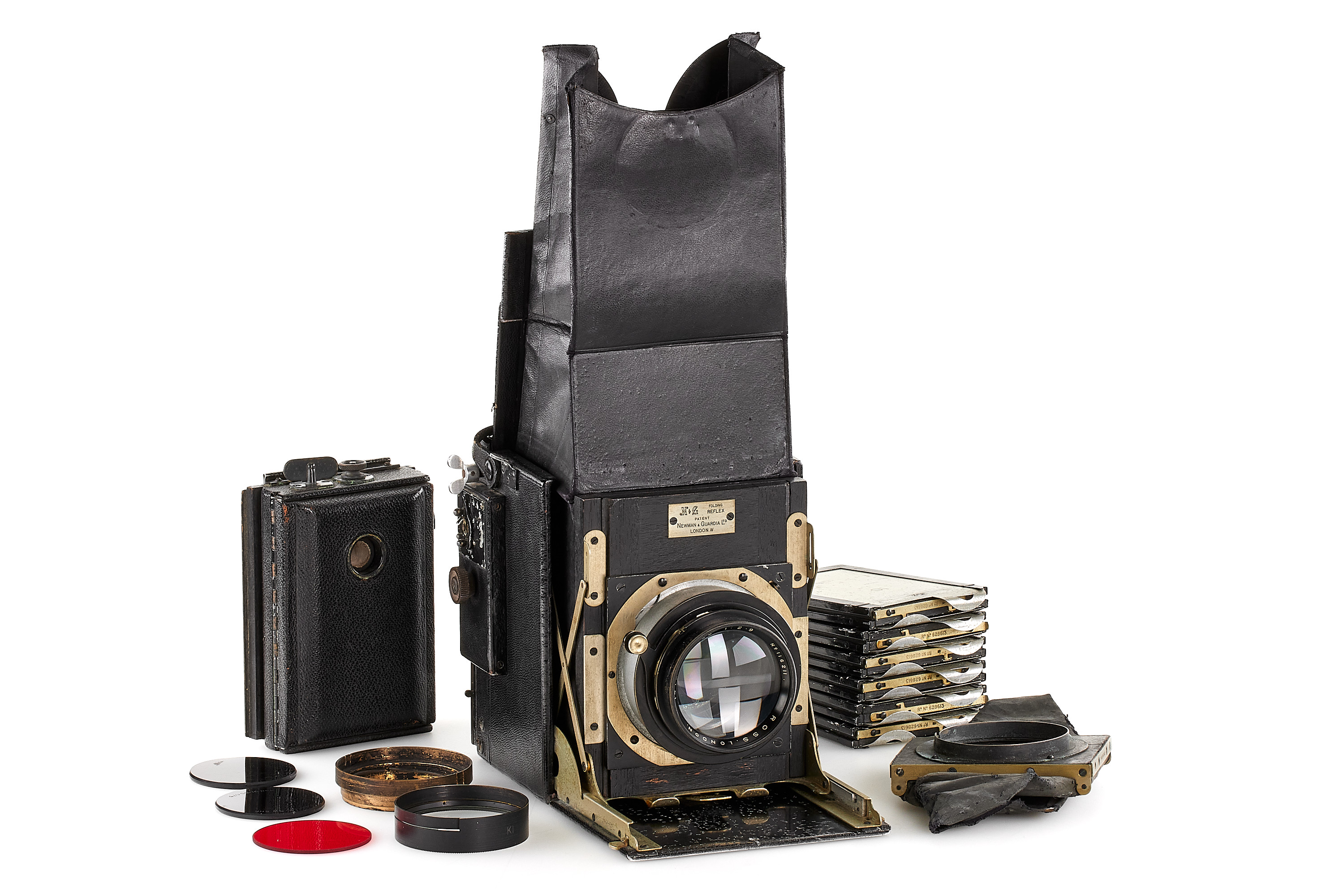 Rare professional folding medium format SLR camera made in the United Kingdom, in good cosmetic condition, shutter not operable, with sought-after fast Ross Xpres 2.9/144mm no.116211 (good lenses), together with focus screen, Graflex roll film back, original lens hood (cond. C), 6x double film plate holders, 4x filters, 1x close-up filter and original outfit case.