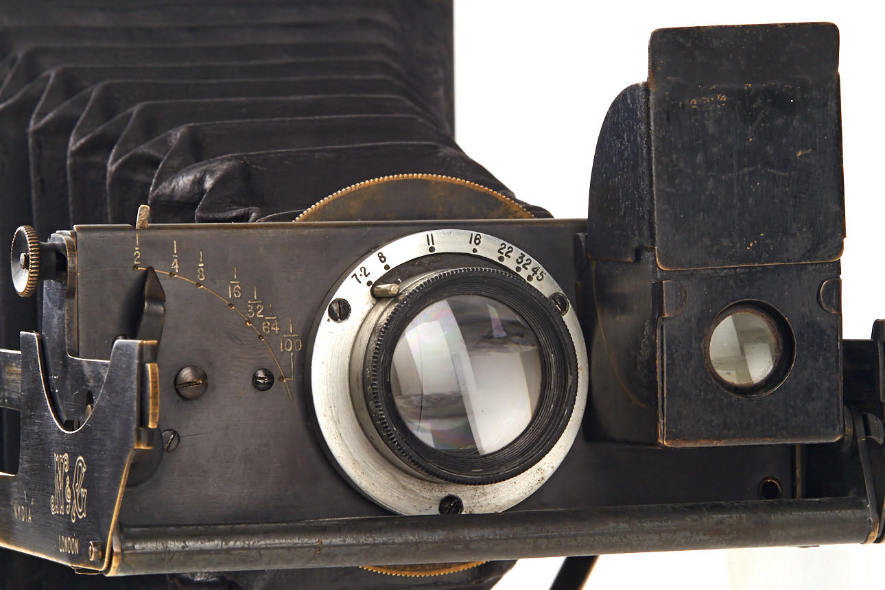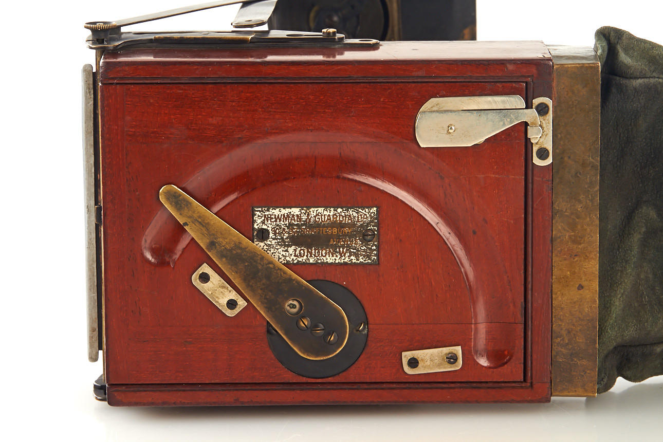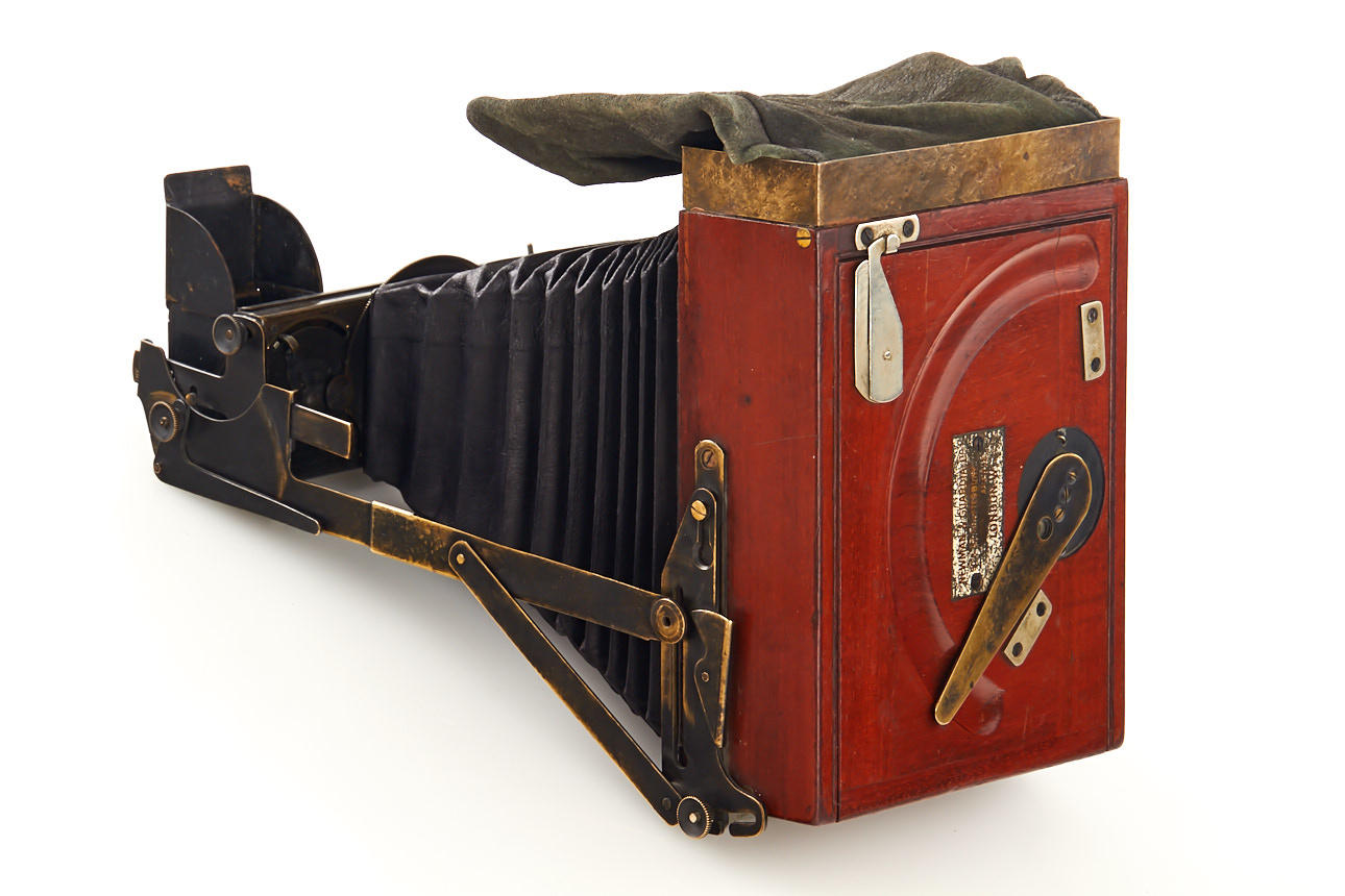 extremely rare format 8x10,5cm, unusual folding plate film camera, polished mahogany body, black leather bellows, Zeiss Tessar 6.3/145mm no.65242, in excellent condition